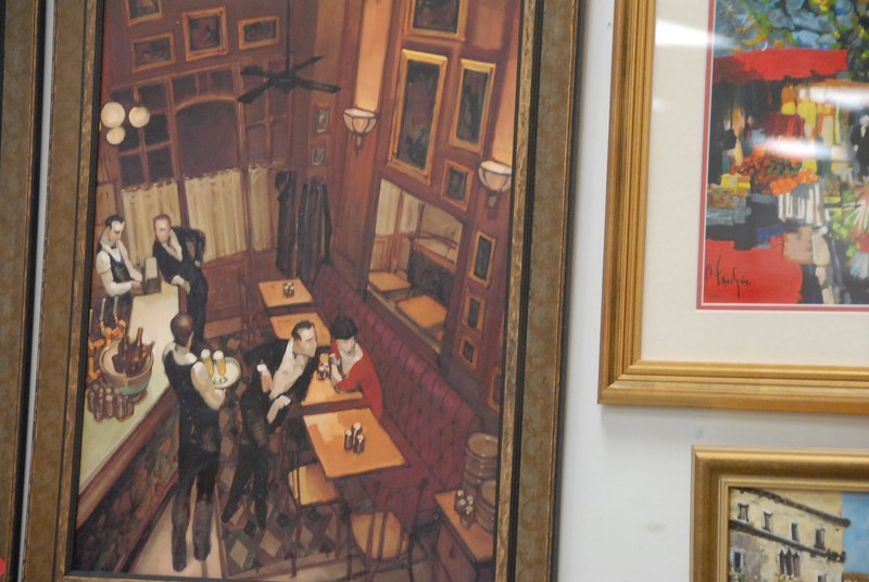 Lot 390: Group of five framed pieces to include four prints on canvas and an oil on canvas canal scene signed lower right Deslies.