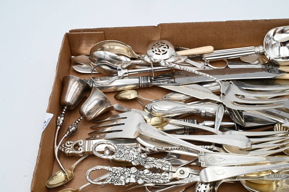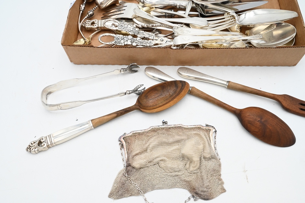 Group of Silver, to include Georg Jensen sterling serving pieces, sterling serving spoons and forks, demitasse spoons; along with a Whiting sterling mesh purse; 40.7 t. oz. plus weighted handles along with silver plated flatware.
