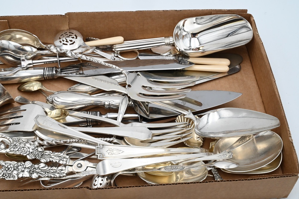 Lot 390: Group of Silver, to include Georg Jensen sterling serving pieces, sterling serving spoons and forks, demitasse spoons; along with a Whiting sterling mesh purse; 40.7 t. oz. plus weighted handles along with silver plated flatware.