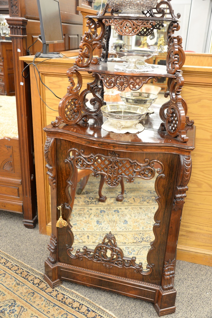 Lot 390: Rosewood Victorian Etagere having pierce carved top, with two mirror back shelves on lower section, with pierce carved front with m…
