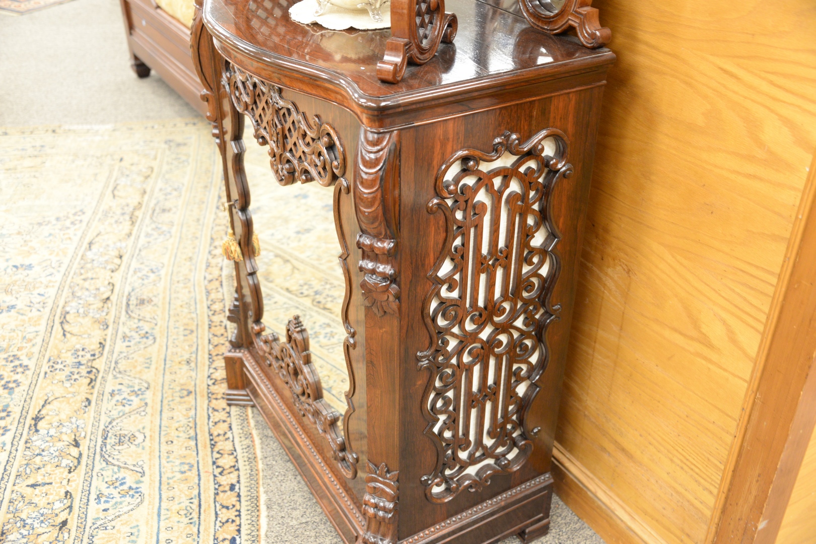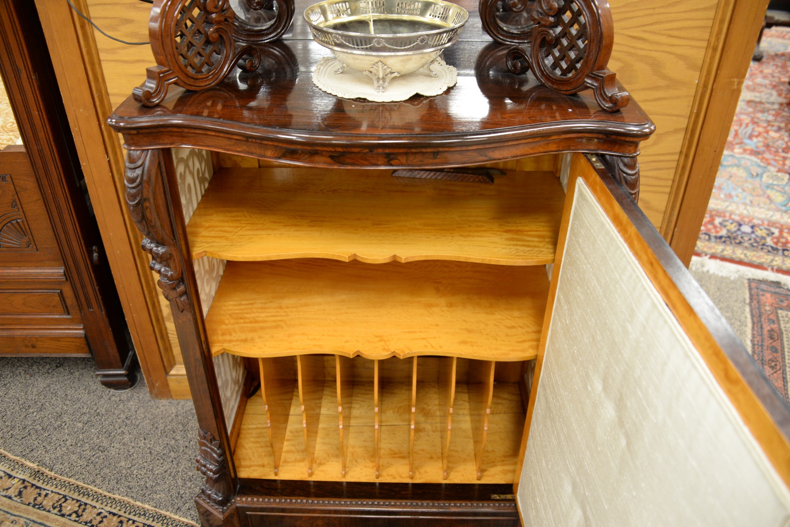 having pierce carved top, with two mirror back shelves on lower section, with pierce carved front with mirror, and pierce carved sides with cloth, door opens to reveal satinwood interior with shelves, and sections for records or magazines
