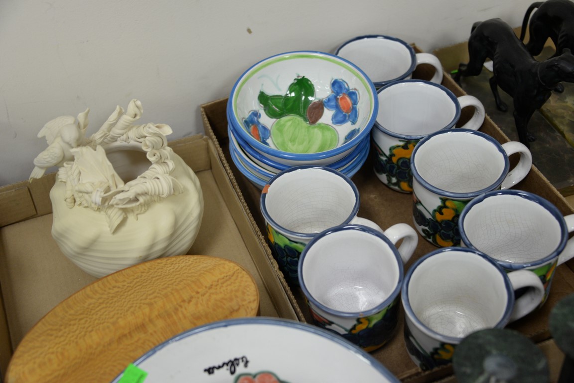 Six box lots of miscellaneous items including Celina pottery dish set, pair of dog bookends, owl, ceramic pieces, etc.