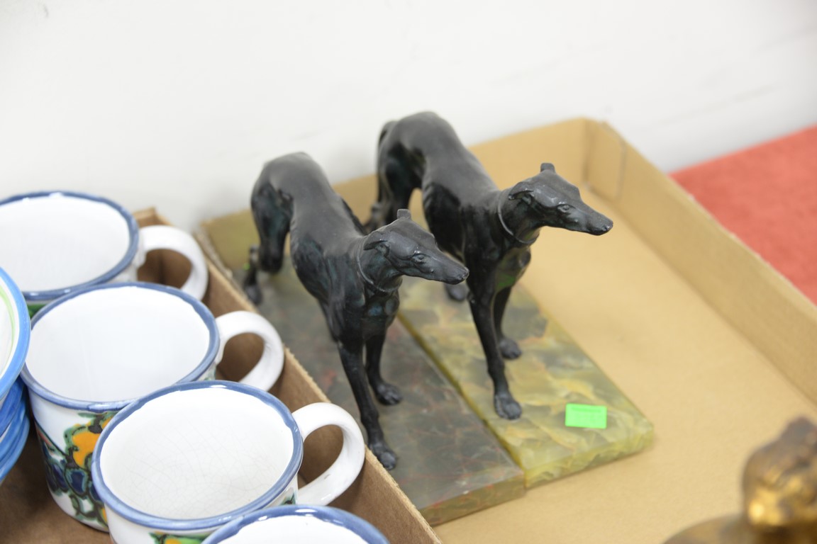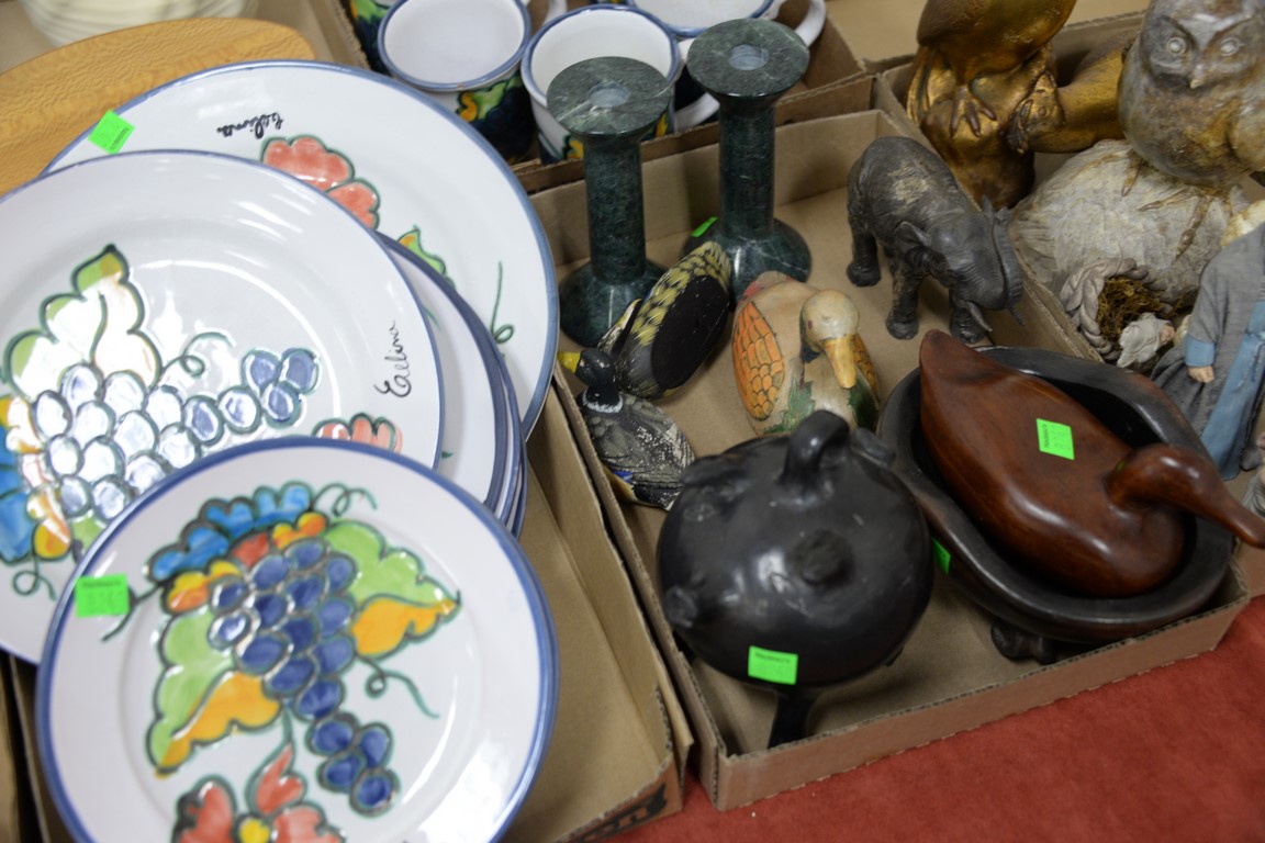 Lot 390: Six box lots of miscellaneous items including Celina pottery dish set, pair of dog bookends, owl, ceramic pieces, etc.