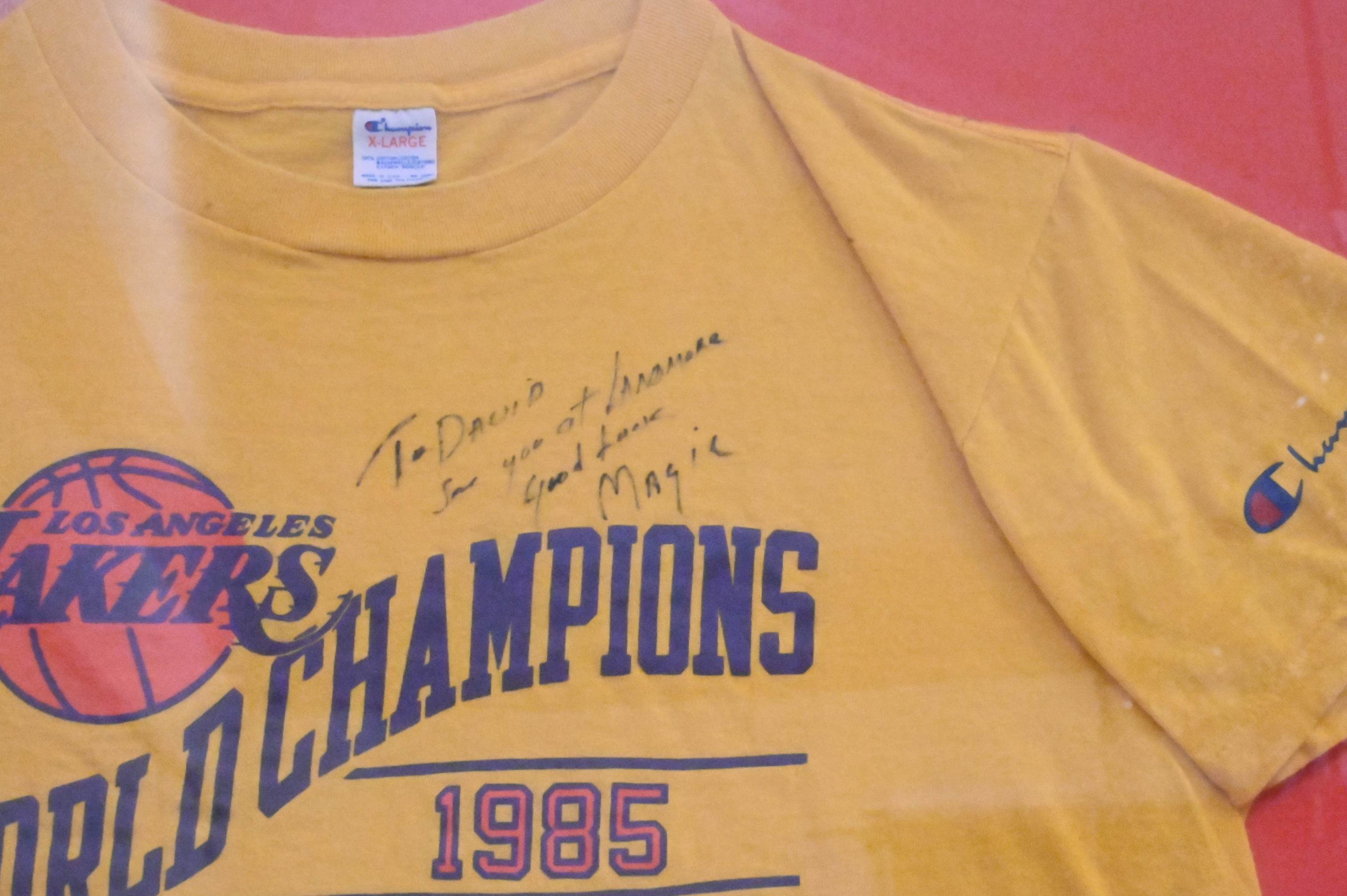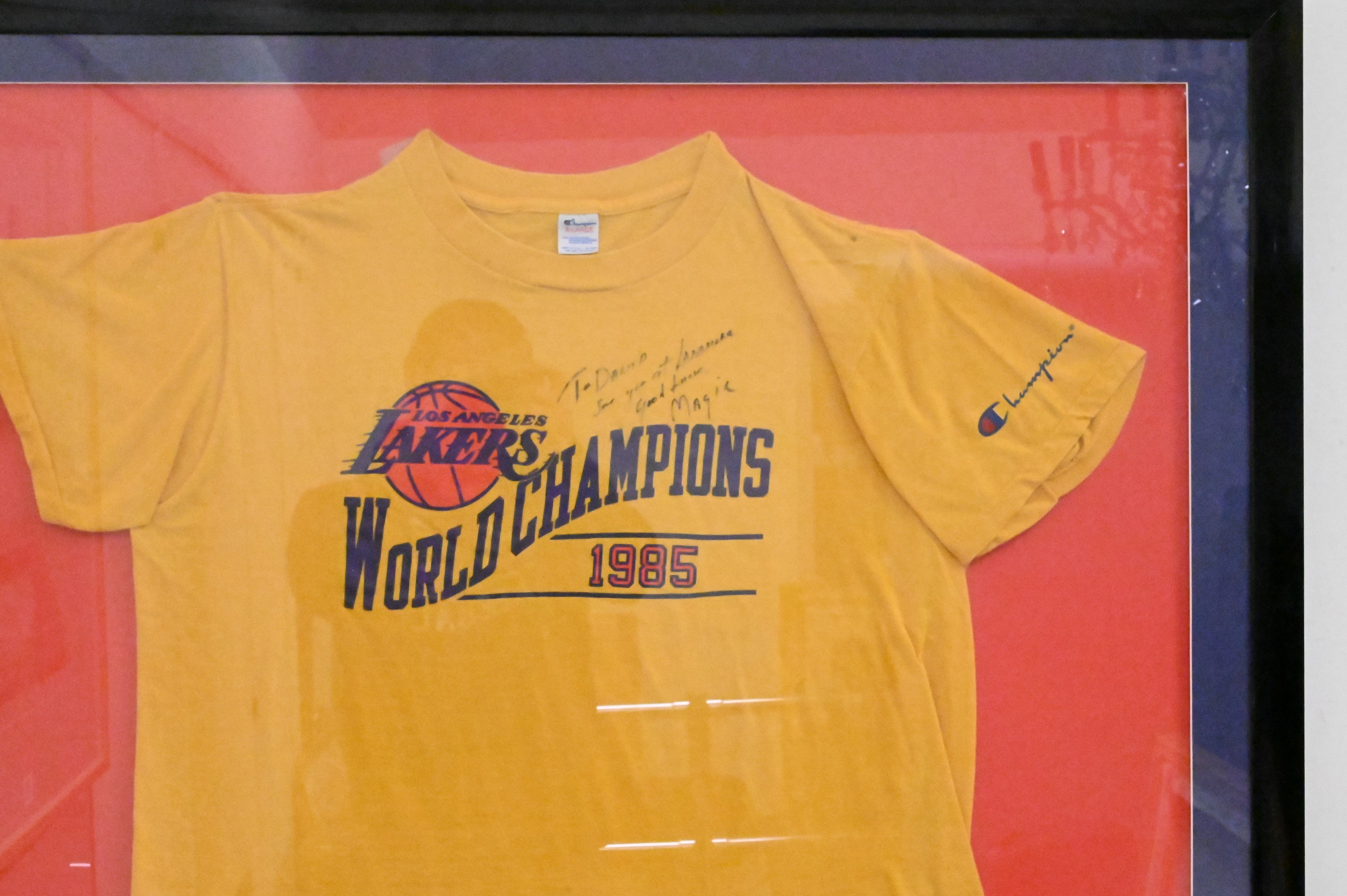 Magic Johnson signed Lakers T-shirt framed Los Angeles Lakers World Champions 1985,