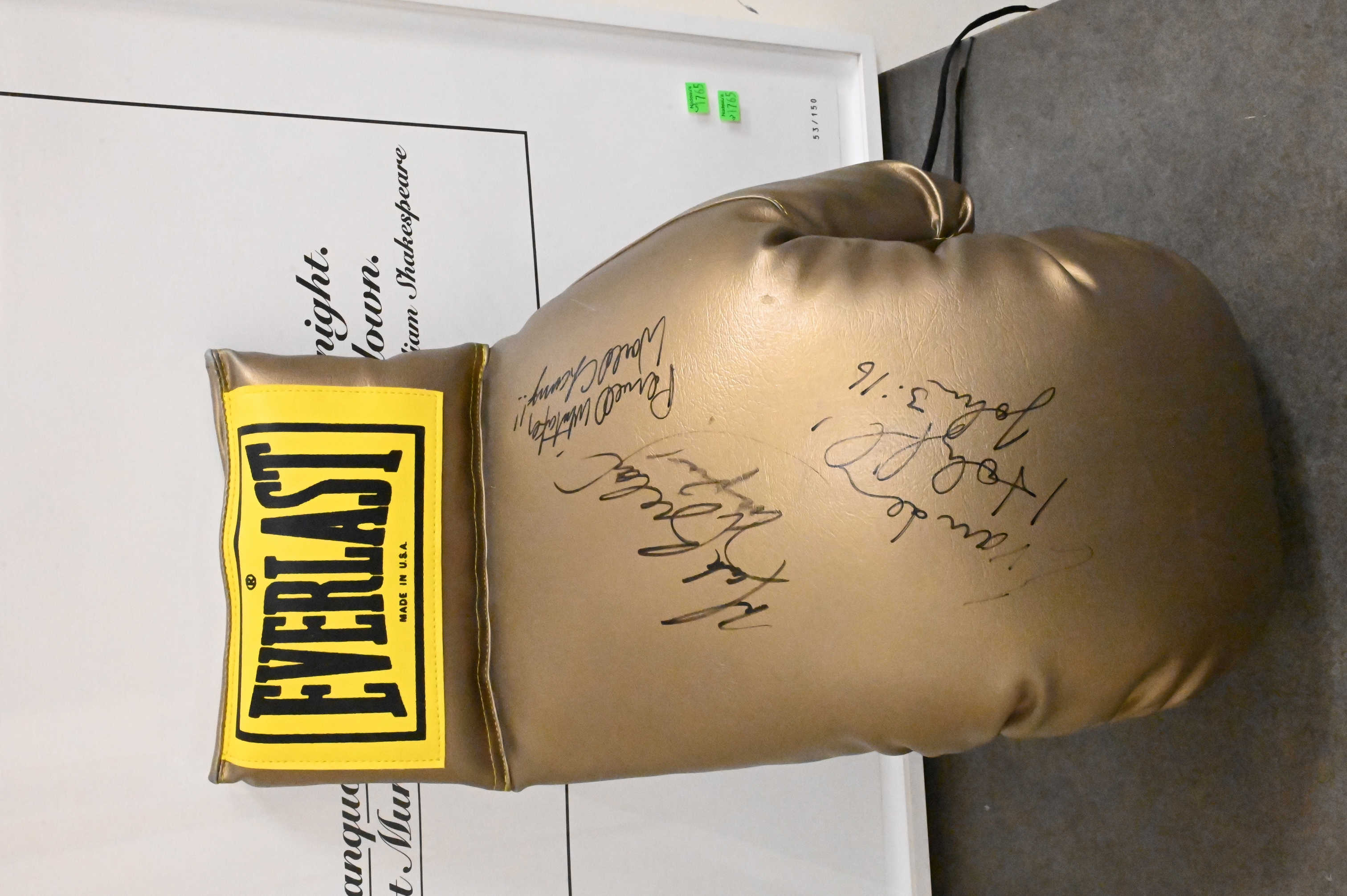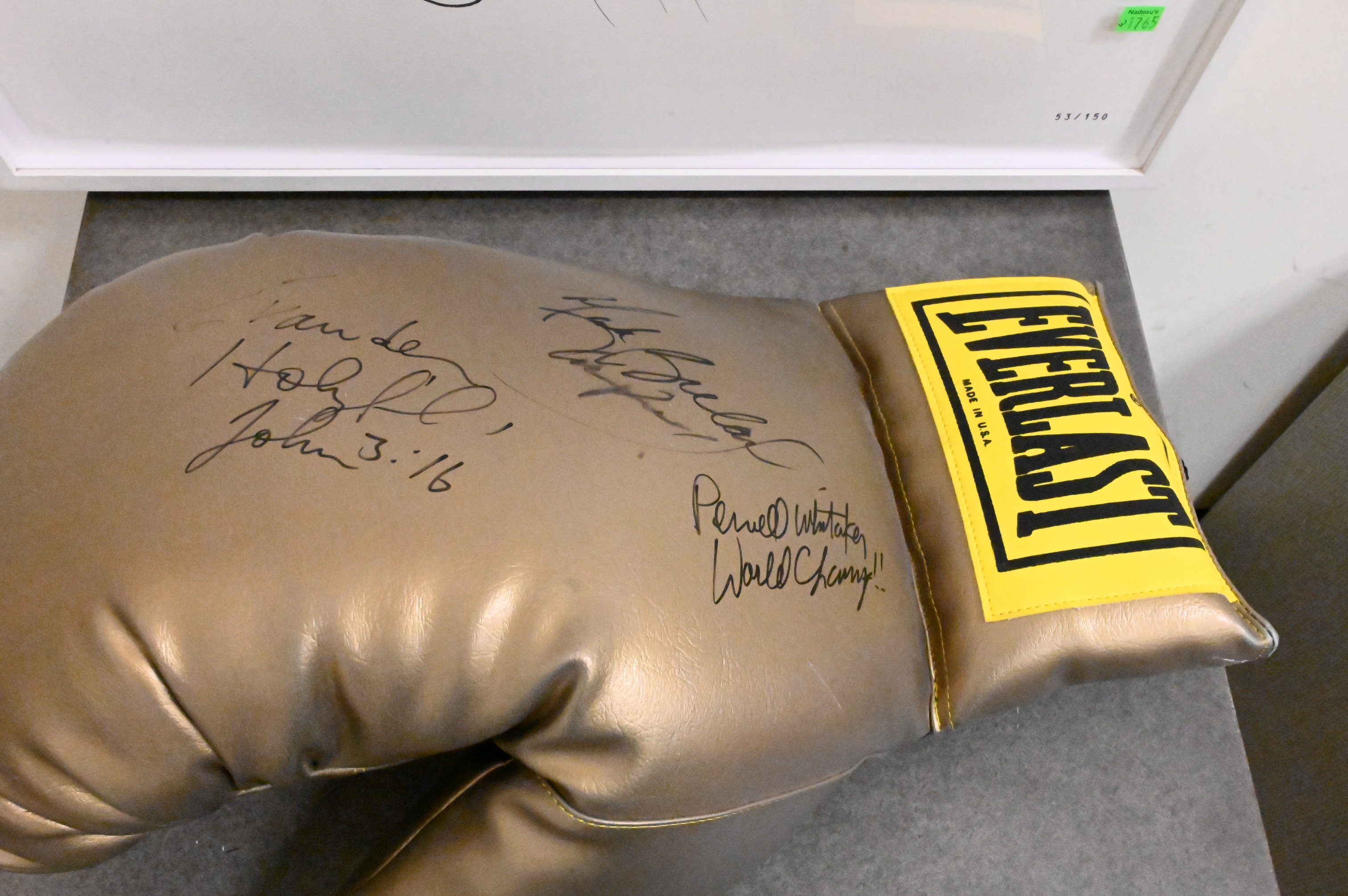 oversized Everlast boxing glove signed by 1984 USA Gold medalists, Evander Holyfield, Mark Breland, and Pernell Whitaker, from the 1984 Summer Olympics, along with
