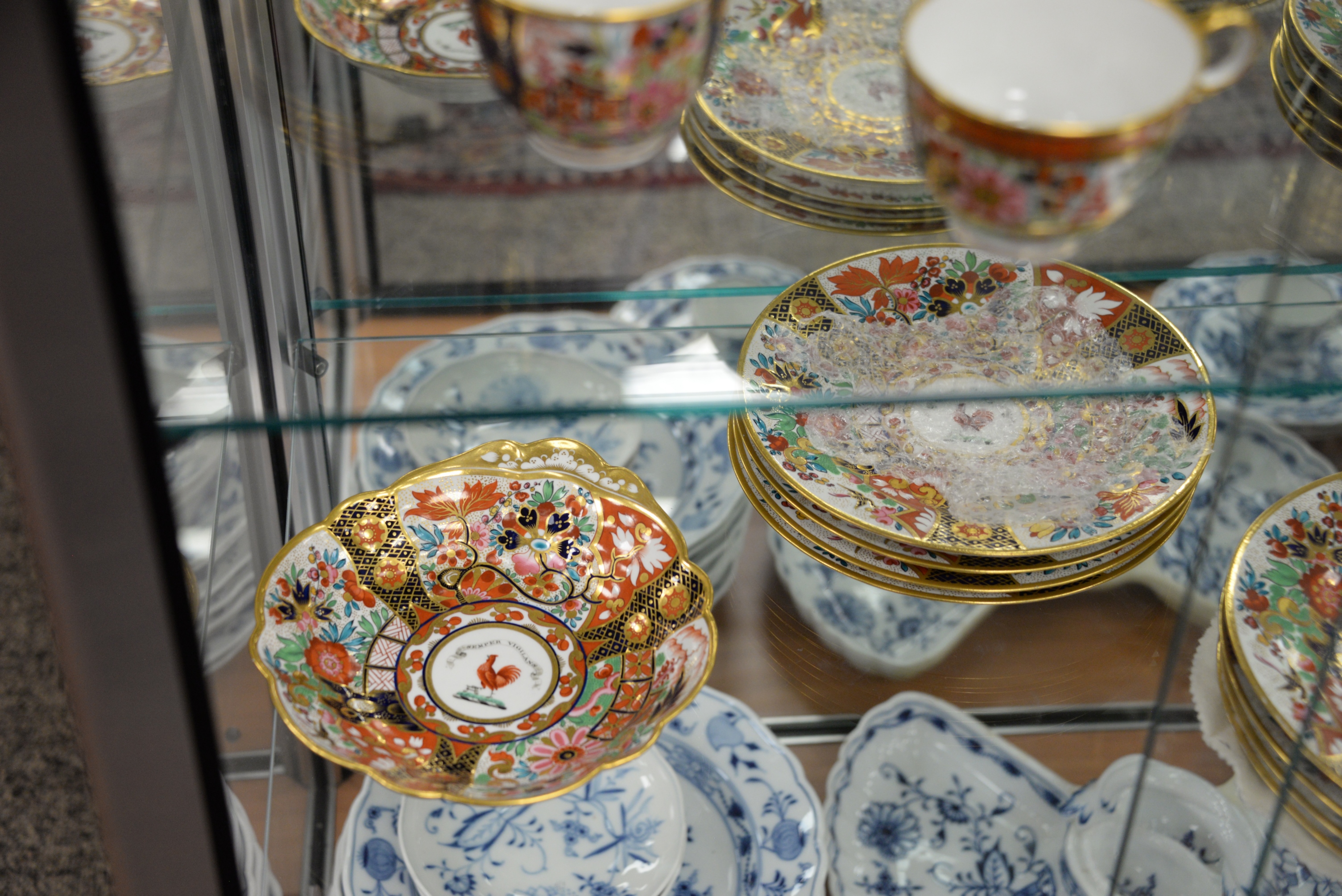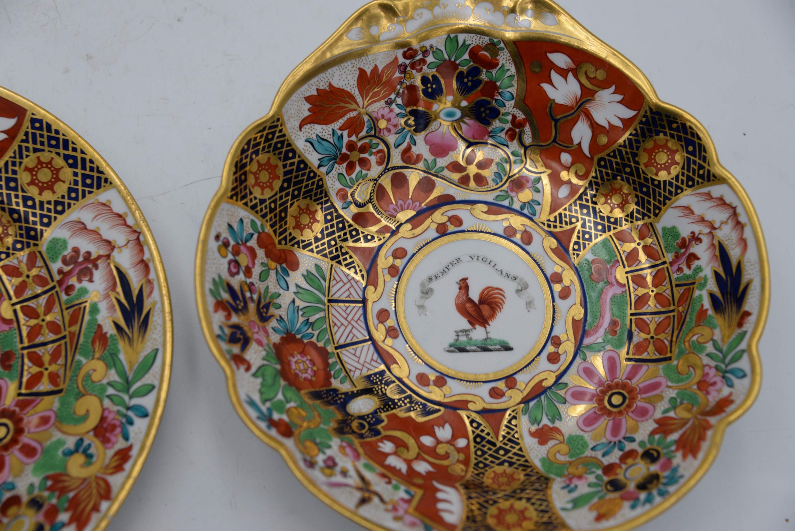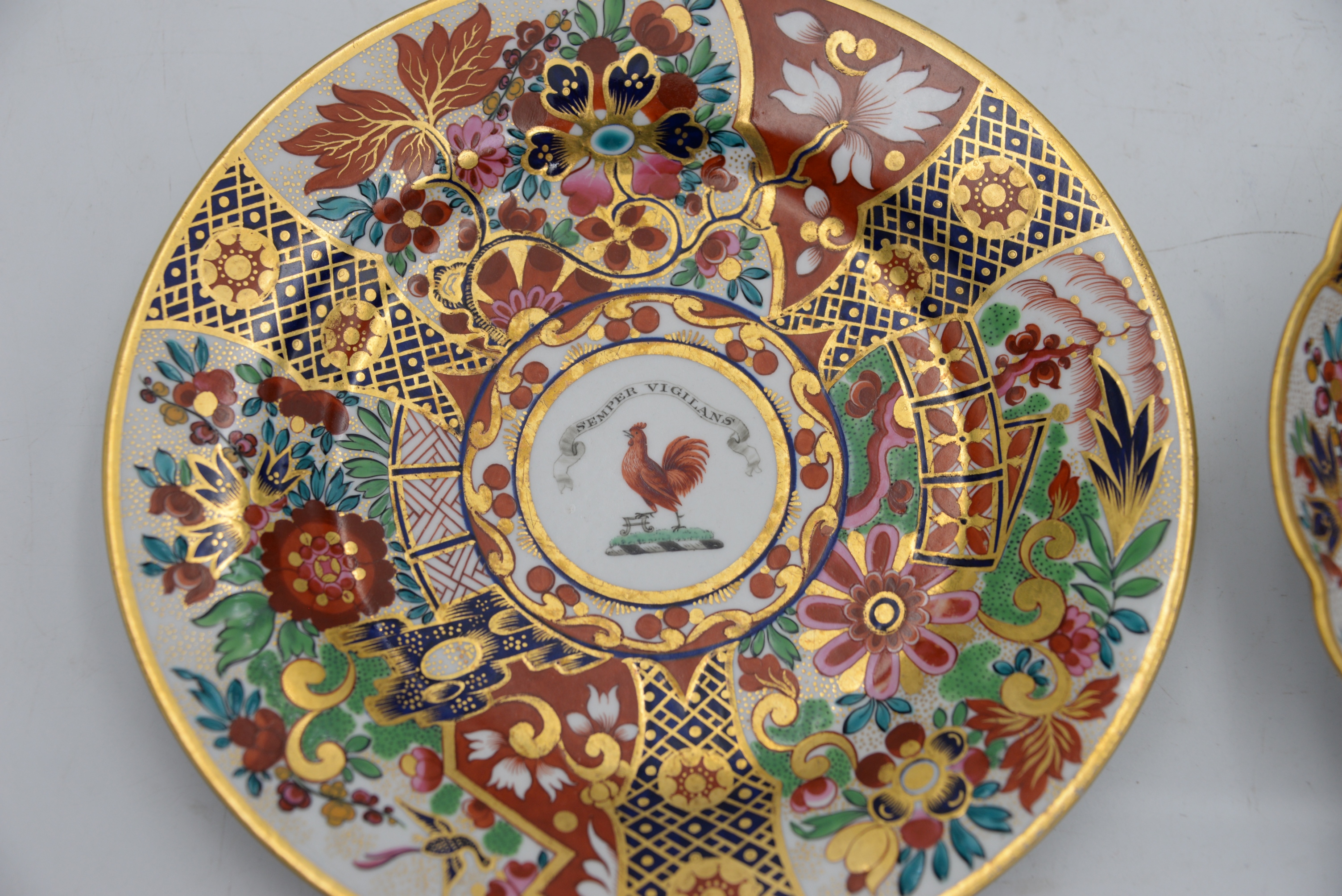 16 Piece Worcester Flight Barr and Barr Set, to include 14 Plates having diameter of 8 1/8 inches, along with 2 shaped dishes having diameter of 7 3/8 inches, all with rooster centers with semper vigilans impressed with crown mark, in Imari pattern.