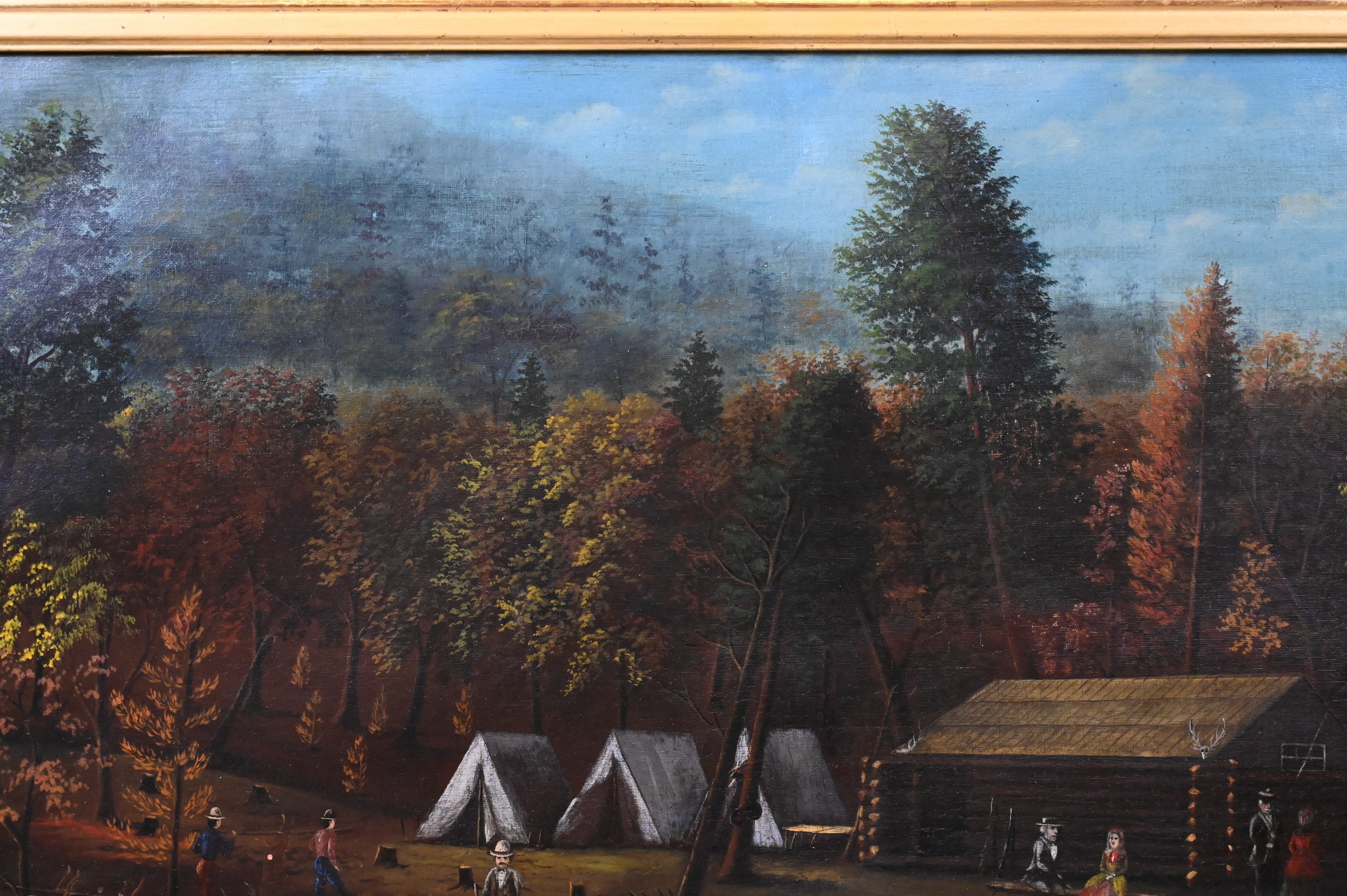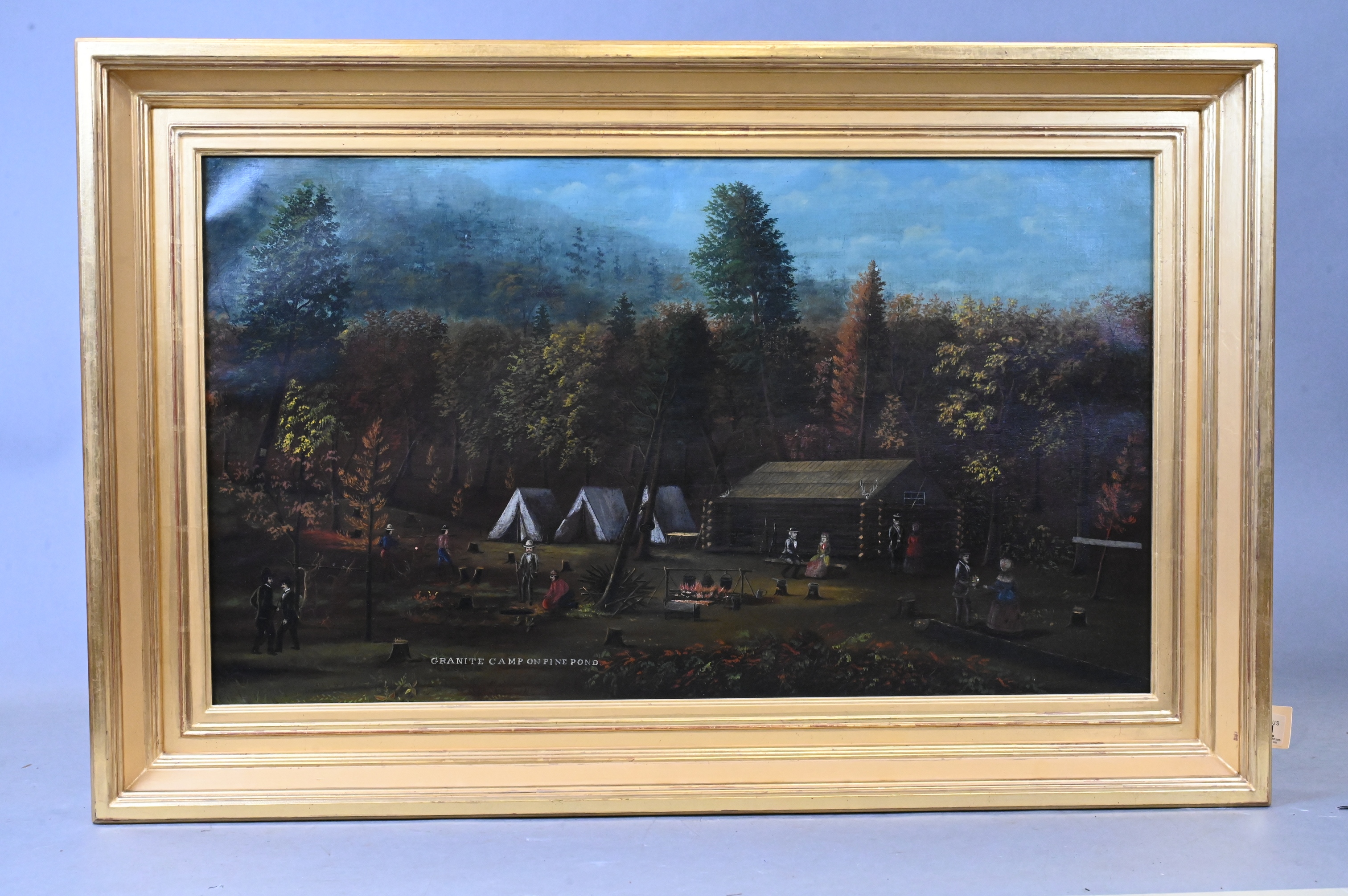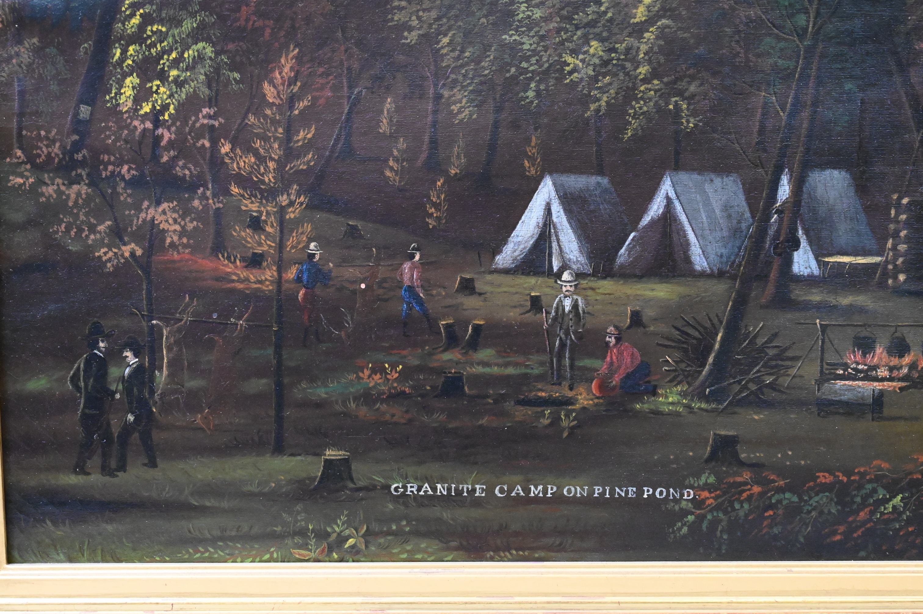 Depicting a New England granite quarry encampment, with a log cabin and canvas tents set among tree stumps at the forest edge. Groups of men and women are shown gathered around a campfire, engaged in work and social activity, painted in a naïve, documentary style characteristic of regional folk art.