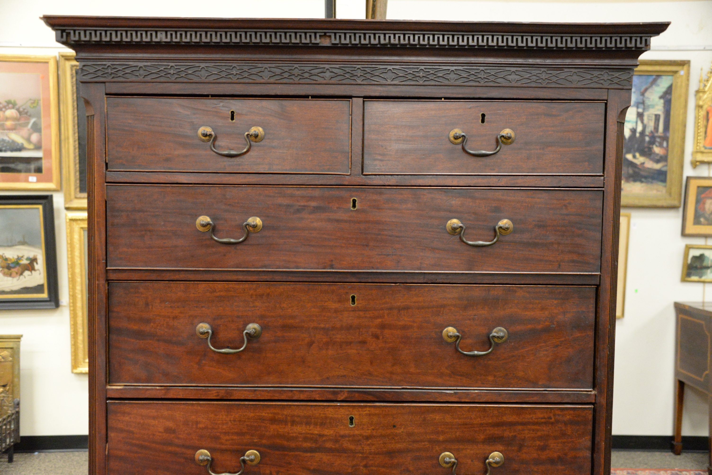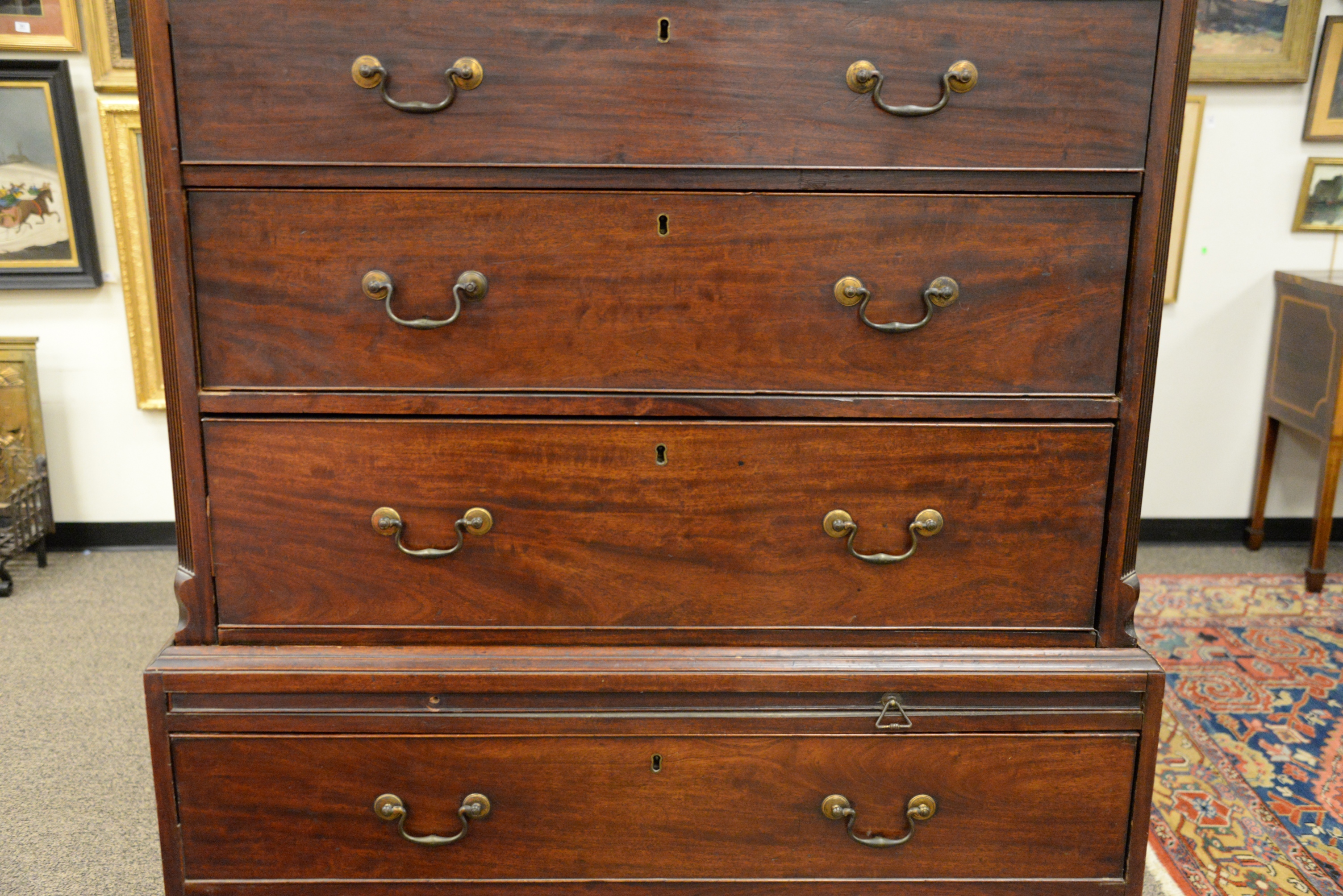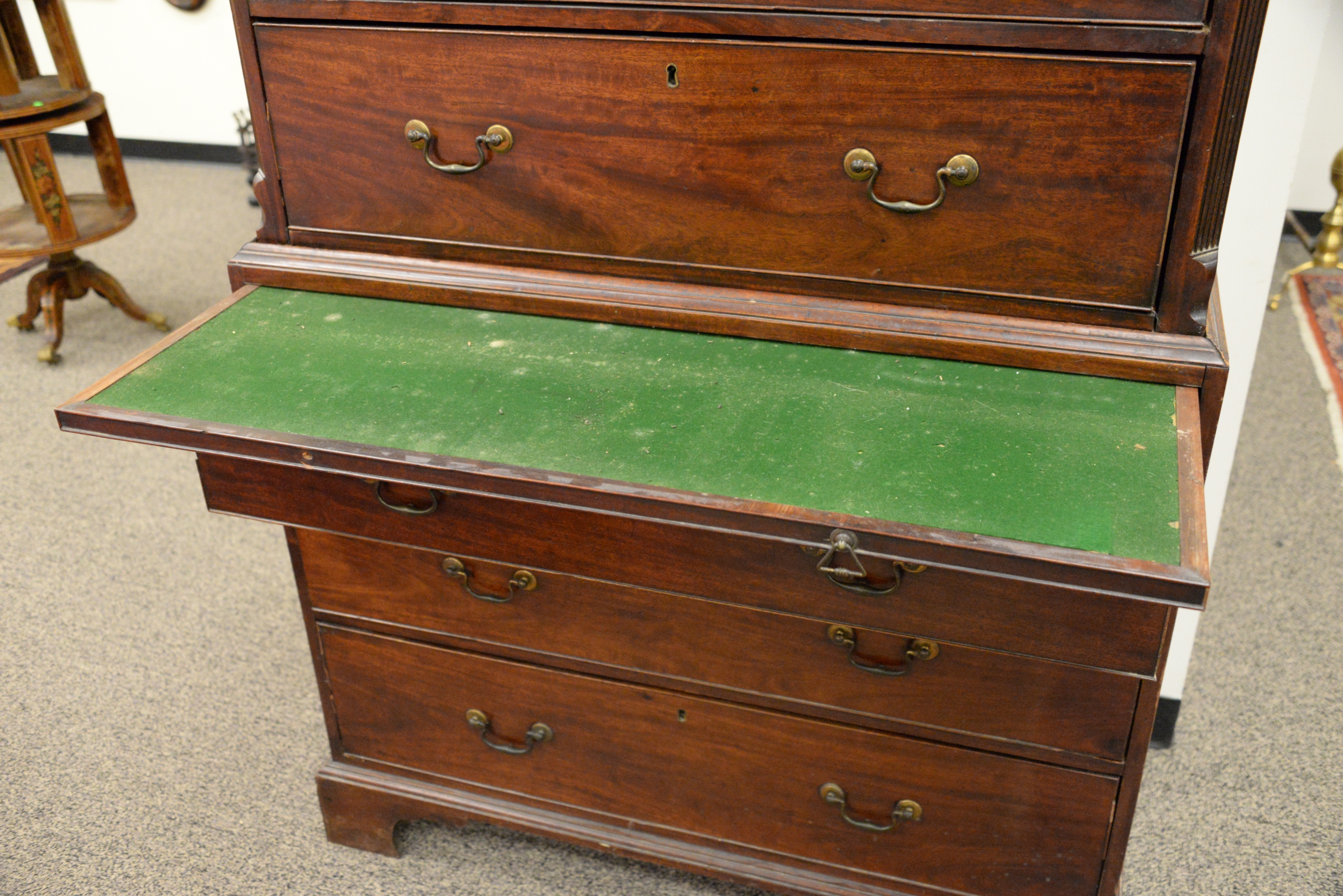 English Chippendale Two Part Cheston Chest, the top having two over three drawers, set on base having pullout slide over three graduated drawers set on bracket feet, height 74 inches, width 42 inches, depth 20 1/2 inches.