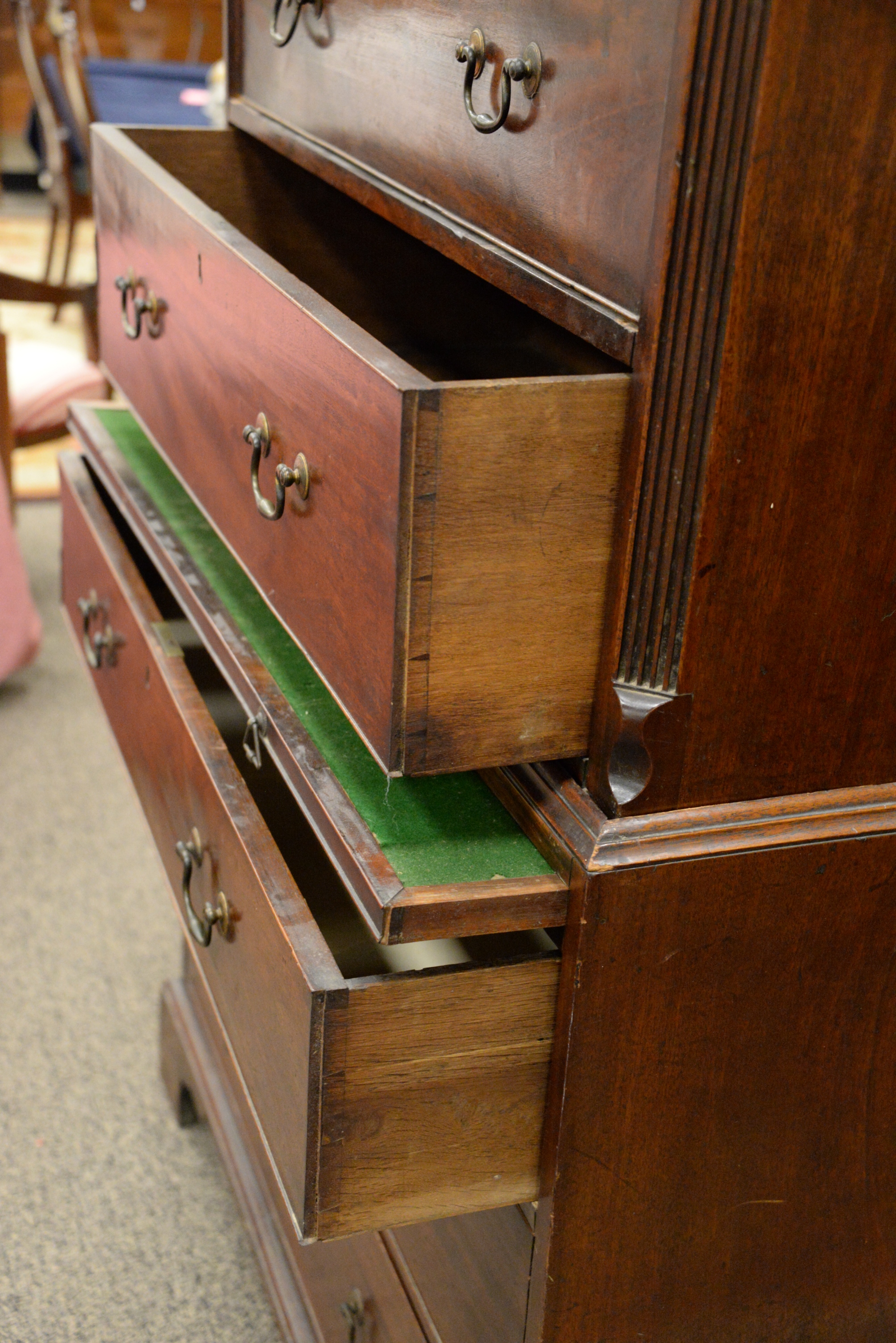 English Chippendale Two Part Cheston Chest, the top having two over three drawers, set on base having pullout slide over three graduated drawers set on bracket feet, height 74 inches, width 42 inches, depth 20 1/2 inches.