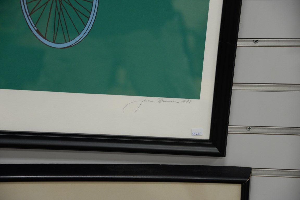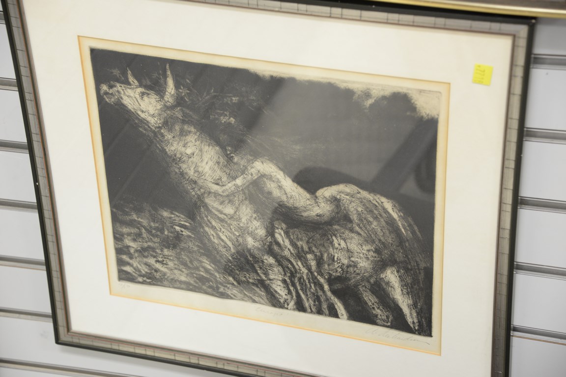 Four framed abstract art pieces including a clown abstract mixed media on paper signed lower right Manning 11/67 18 x 21, Jack Brusca lithograph of bicycles 24 x 24, an etching of a nude on a bull Europa signed lower right A. Richardson 11 1/2 x 14 1/2, and Alexander Dobkin 1908-1975 charcoal of nude signed lower left Dobkin with Forum Gallery label on reverse 30 x 22.