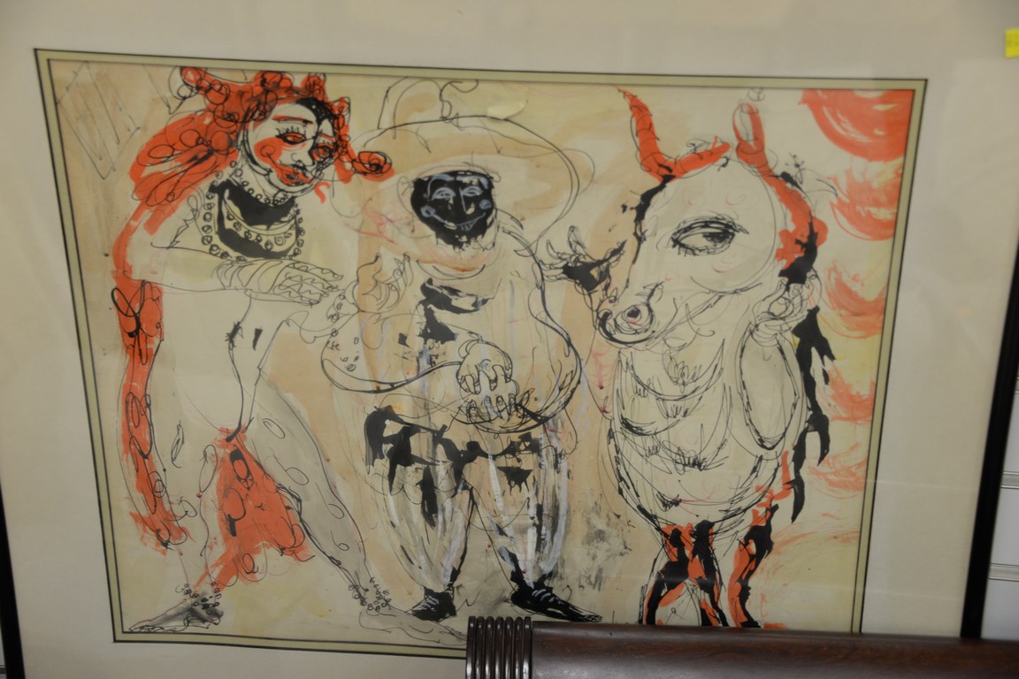 Lot 391: Four framed abstract art pieces including a clown abstract mixed media on paper signed lower right Manning 11/67 18 x 21, Jack B…