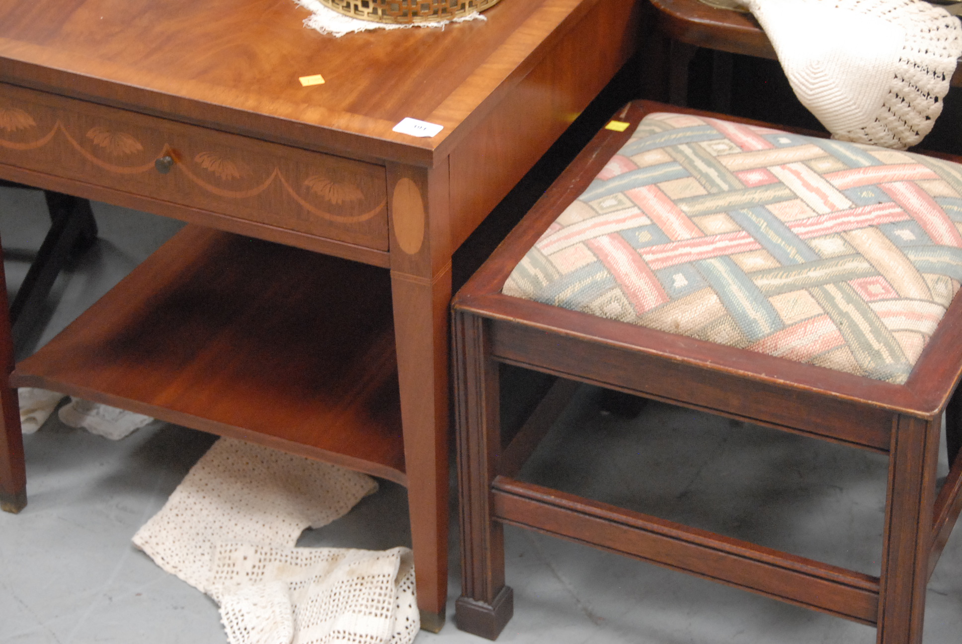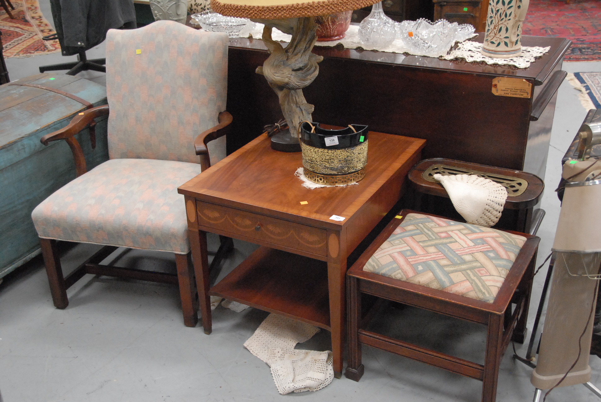 Lot 391: Four piece lot to include an occasional chair, inlaid end table, brass top stand, and small stool.