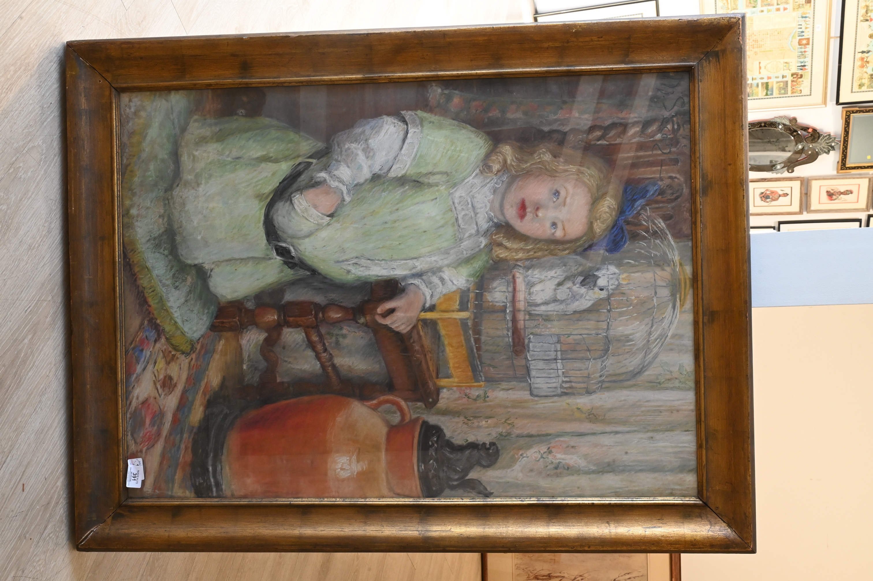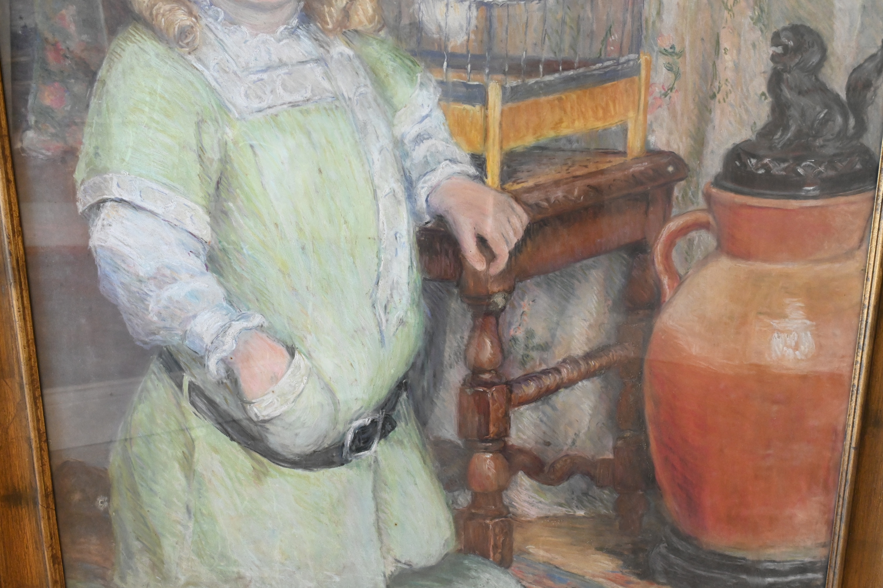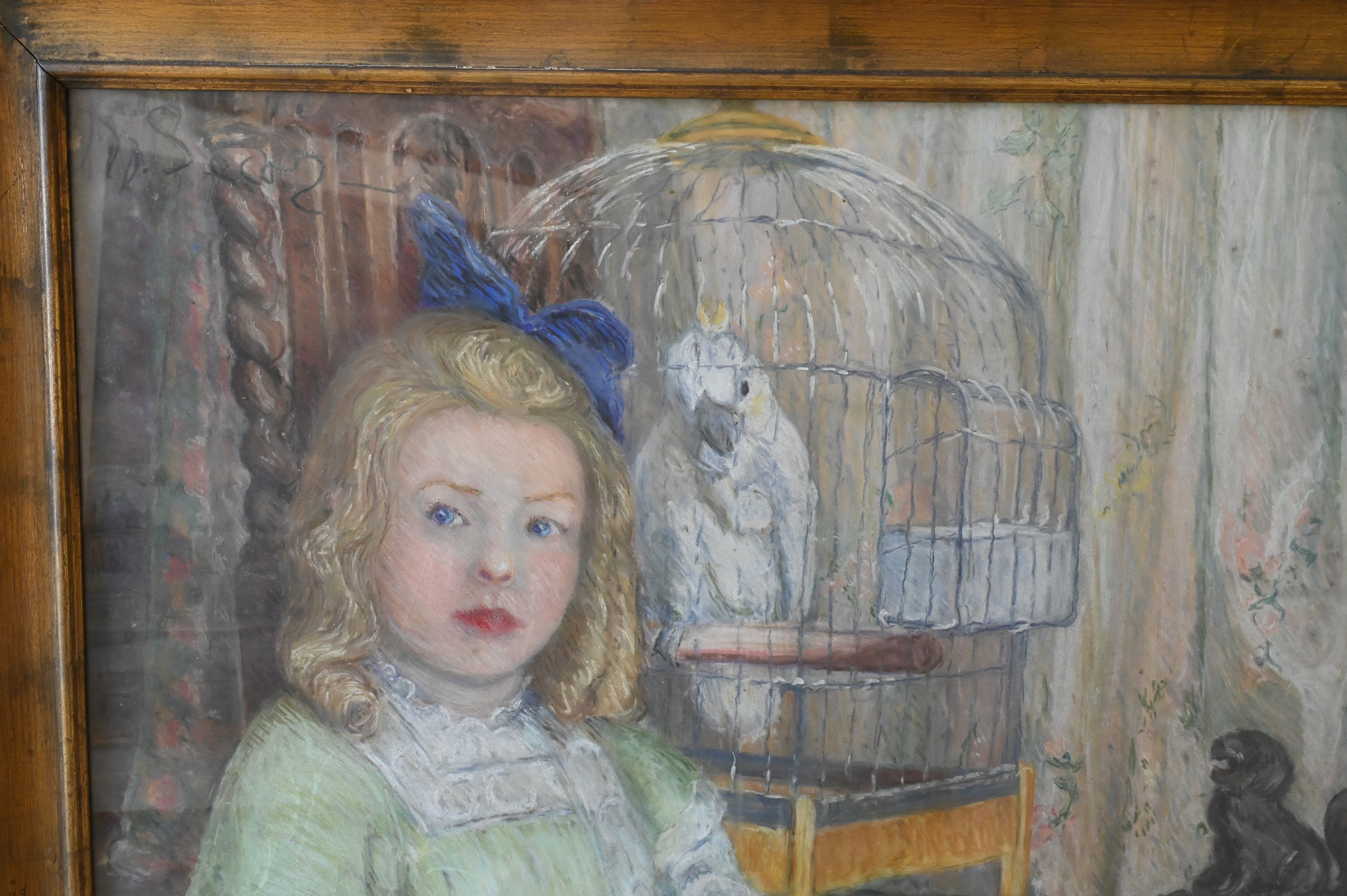 Lot 391: Full Length Portrait of a Girl in a Green Dress with a White Parrot