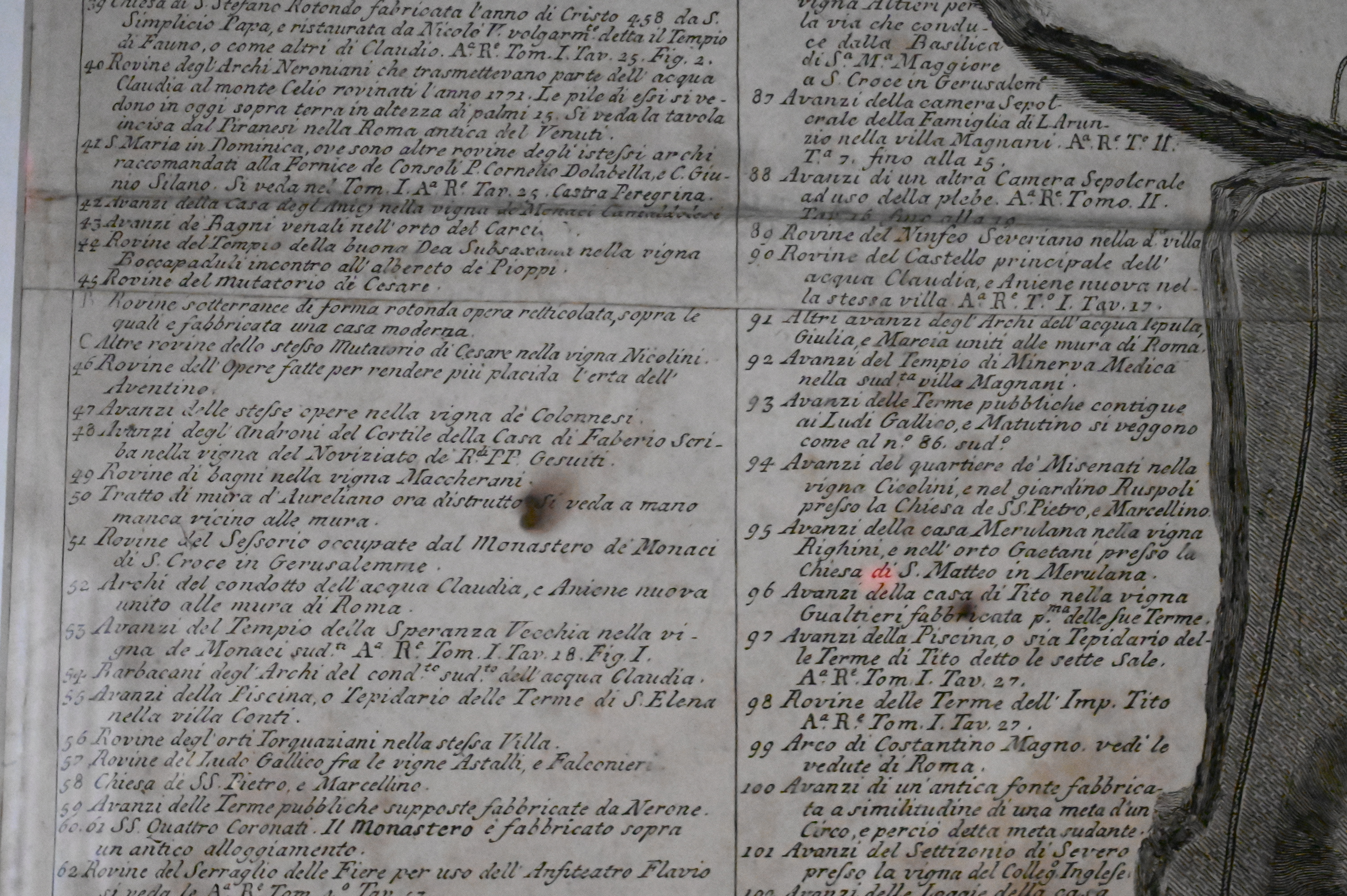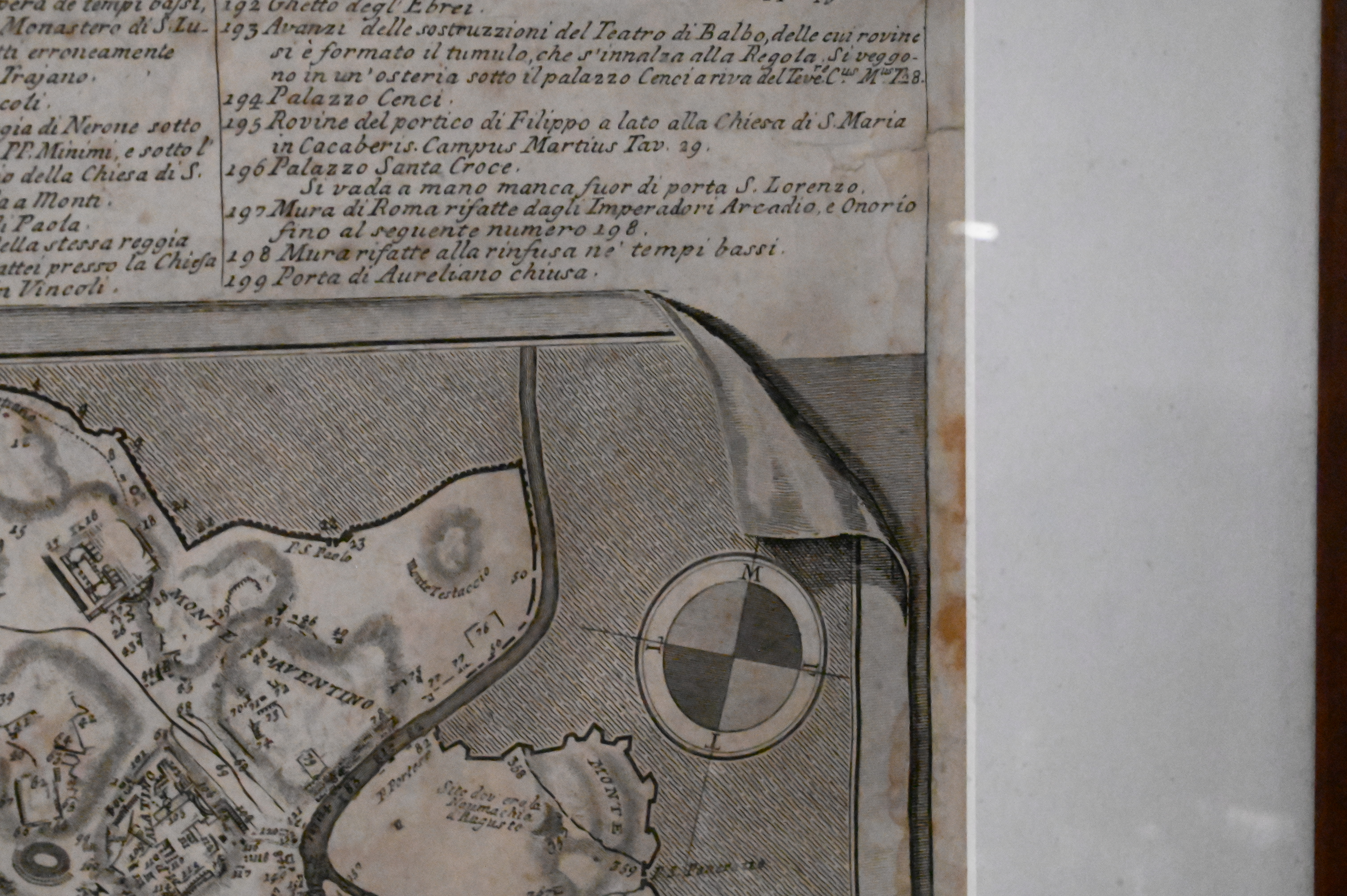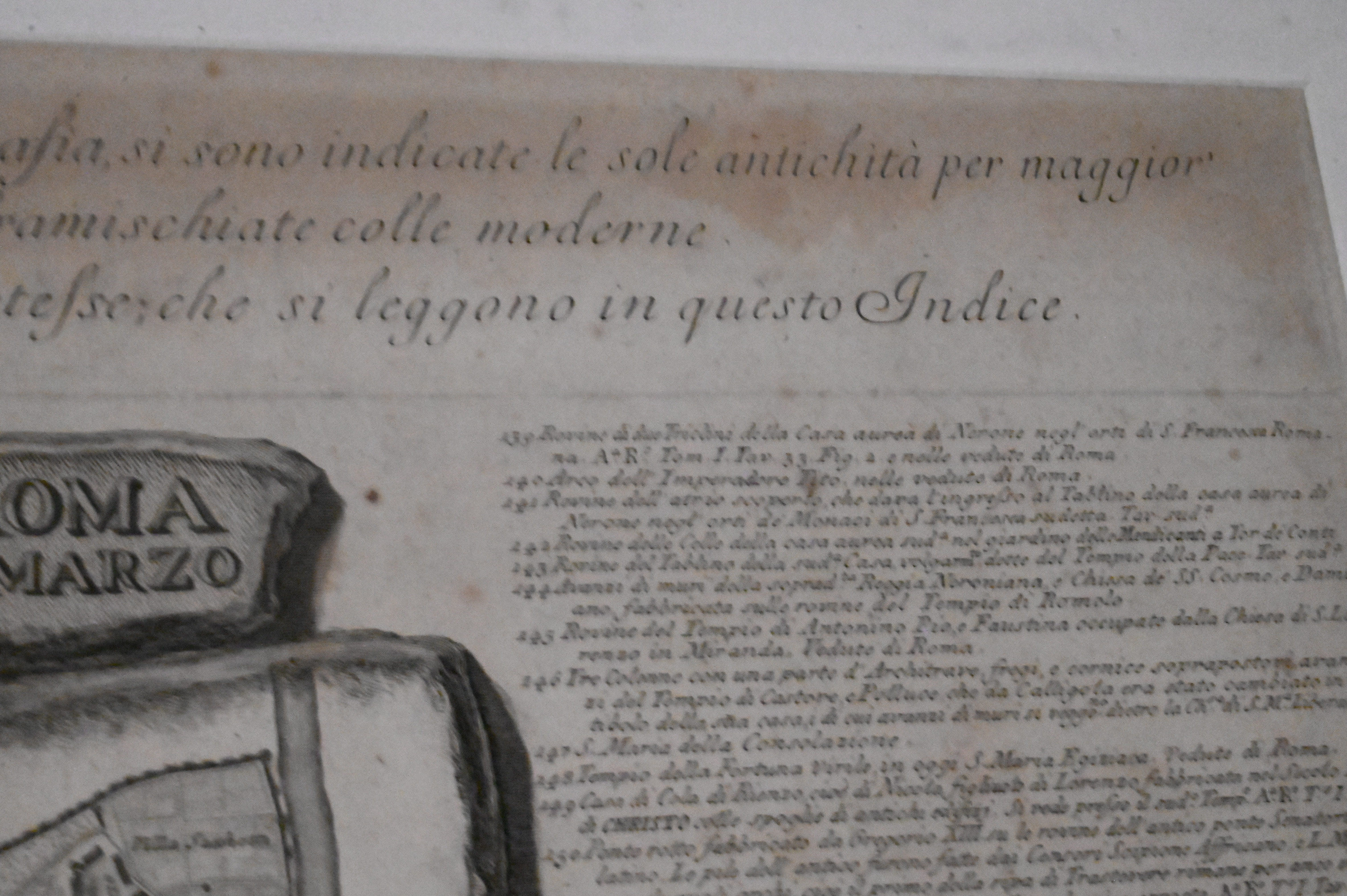 Large map of ancient and modern Rome with extensive letterpress-style index surrounding the central plan, executed in Piranesi’s distinctive architectural manner, richly detailed with monuments, streets, fountains, and the topography of the Campo Marzio. Lower dedication cartouche referencing Clemente XIII. Handsomely presented in a wide archival mat and later wood frame.