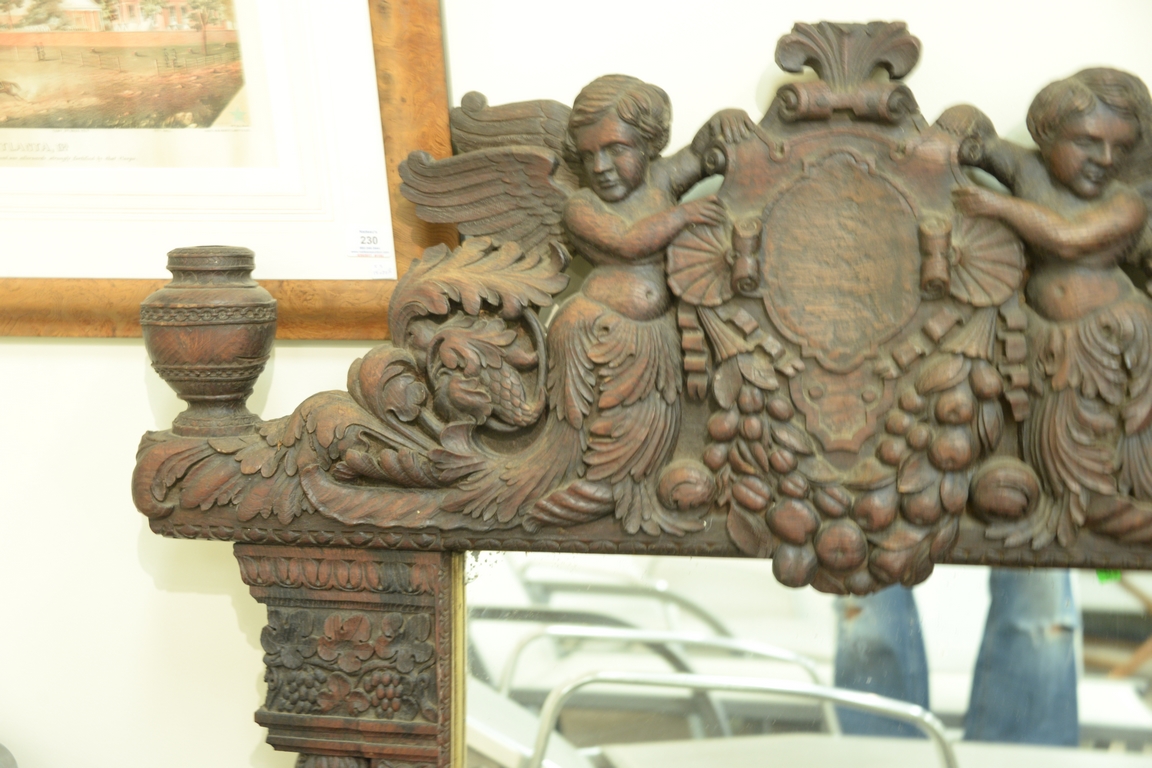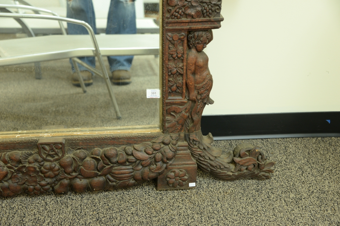 Lot 391: Large figural Italian classical style oak mirror having carved putti figures, grapevines, and fruit wreaths. 43 x 52
