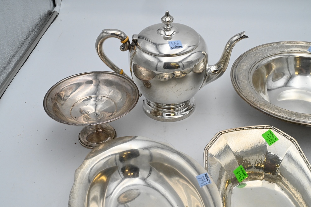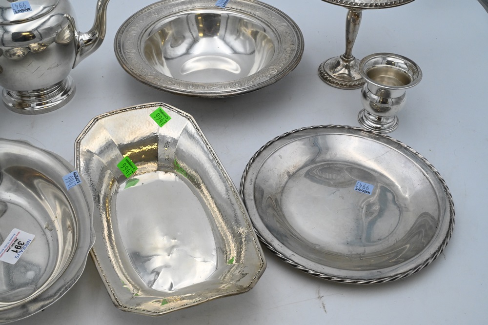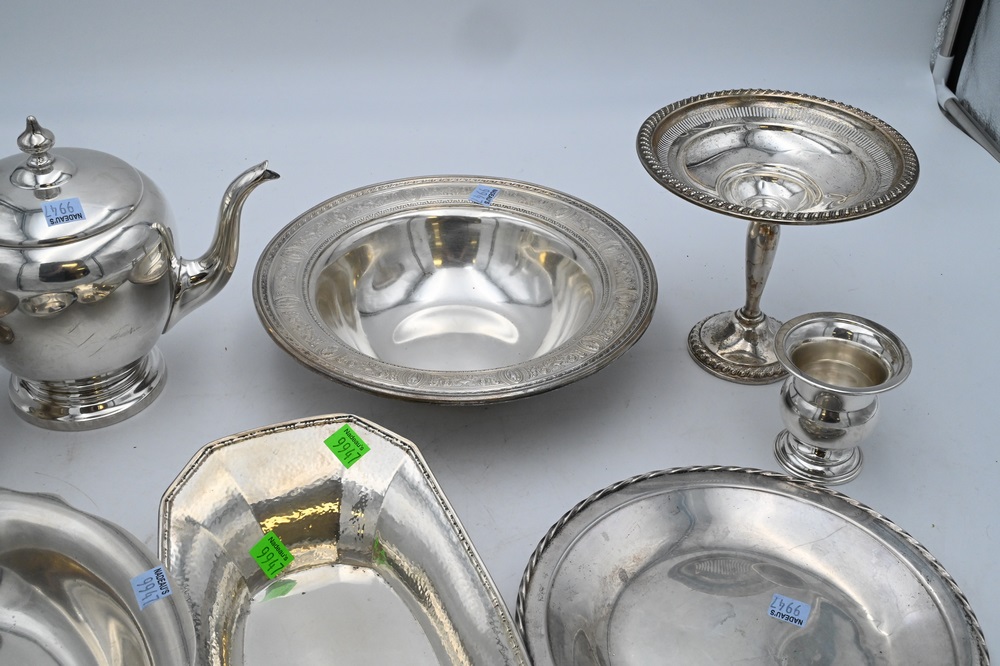 Large Group of Sterling Silver, to include a teapot, bowl, plate, two serving dishes, along with two weighted compotes, 58.2 t.oz. plus two weighted pieces.