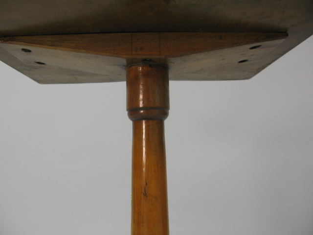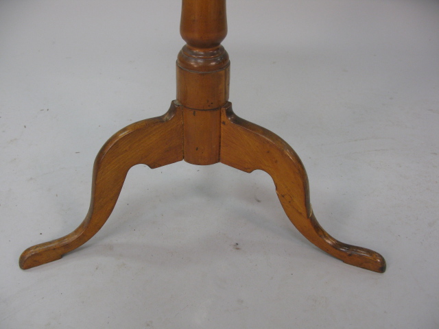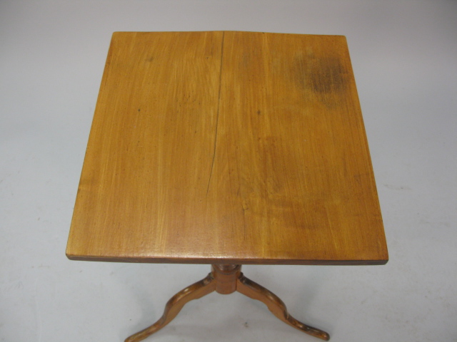 Maple candle stand with square top on turned shaft on tripod base, probably northeastern.