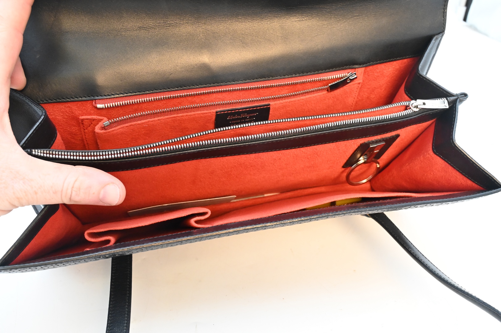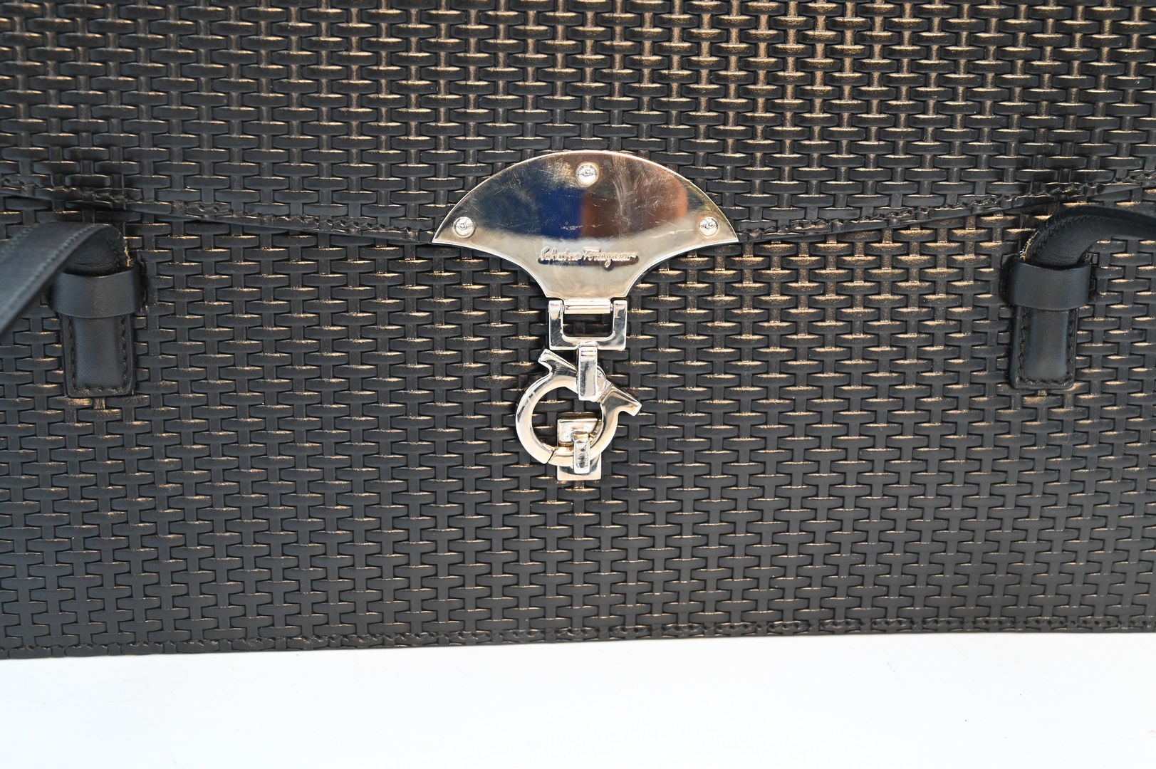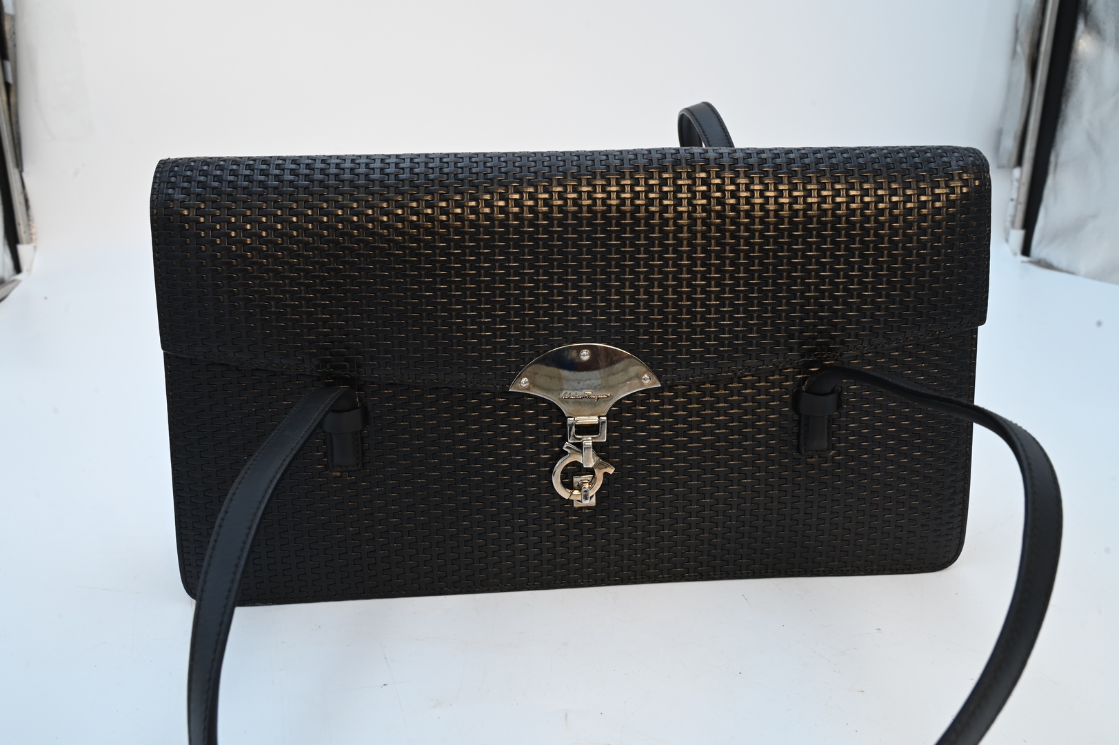Salvatore Ferragamo Black Leather Purse, having stylized clasp, height 7 1/2 inches, width 14 inches.
