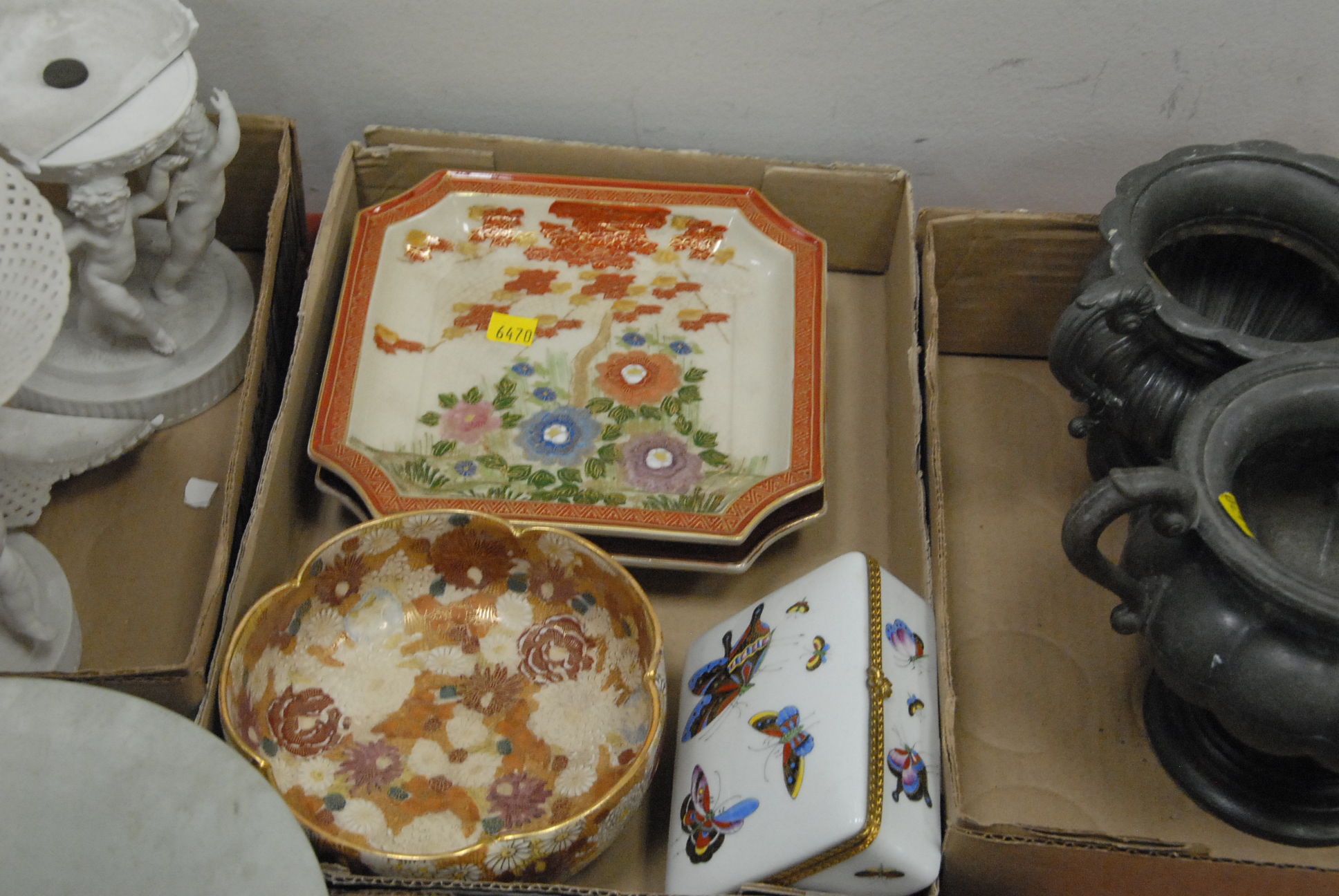 Six box lots creamware, Staffordshire birds, bowls, Royal Doulton dog, small lift top box, Oriental bowl, two Oriental plates, two pewter serving pieces, etc.