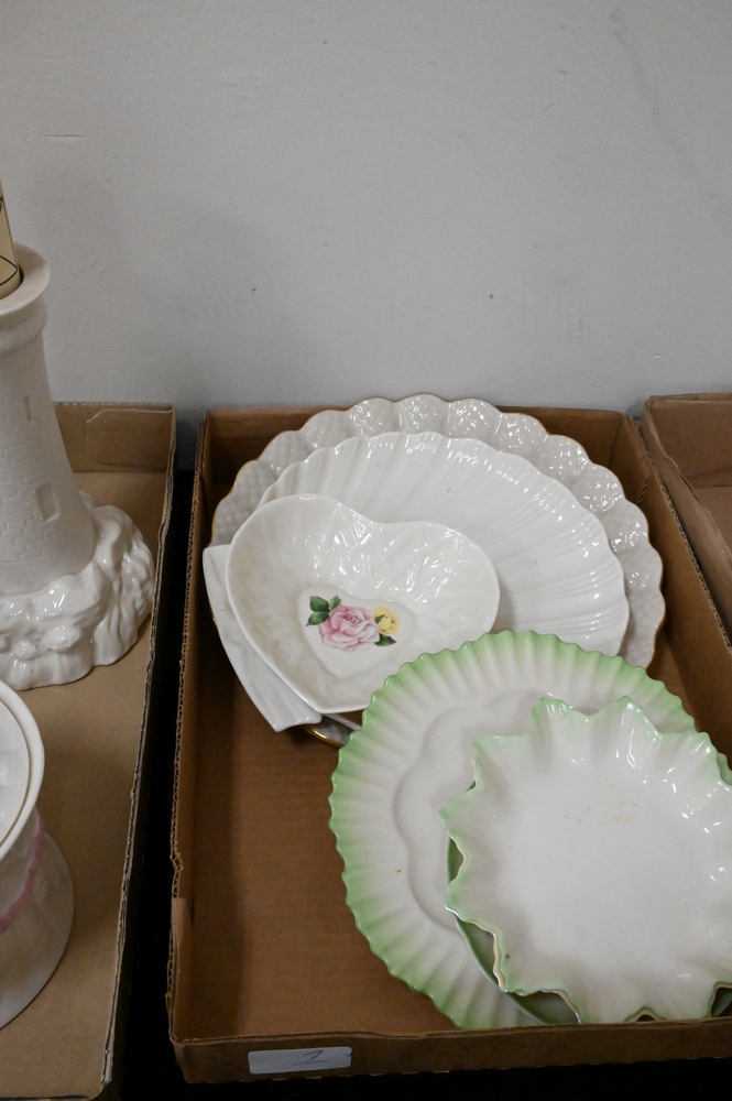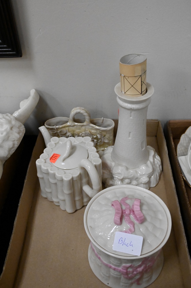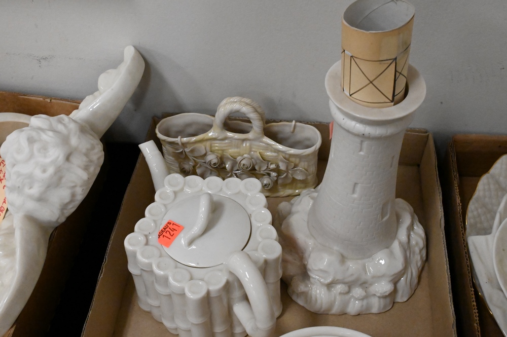 Lot 391: Two Tray Lots of Belleek, to include a specimen holder, faux bamboo teapot, harp, pair of cornucopia vases, lighthouse, etc.; all with black marks. Provenance: Collections of Norma Reilly, New Jersey.