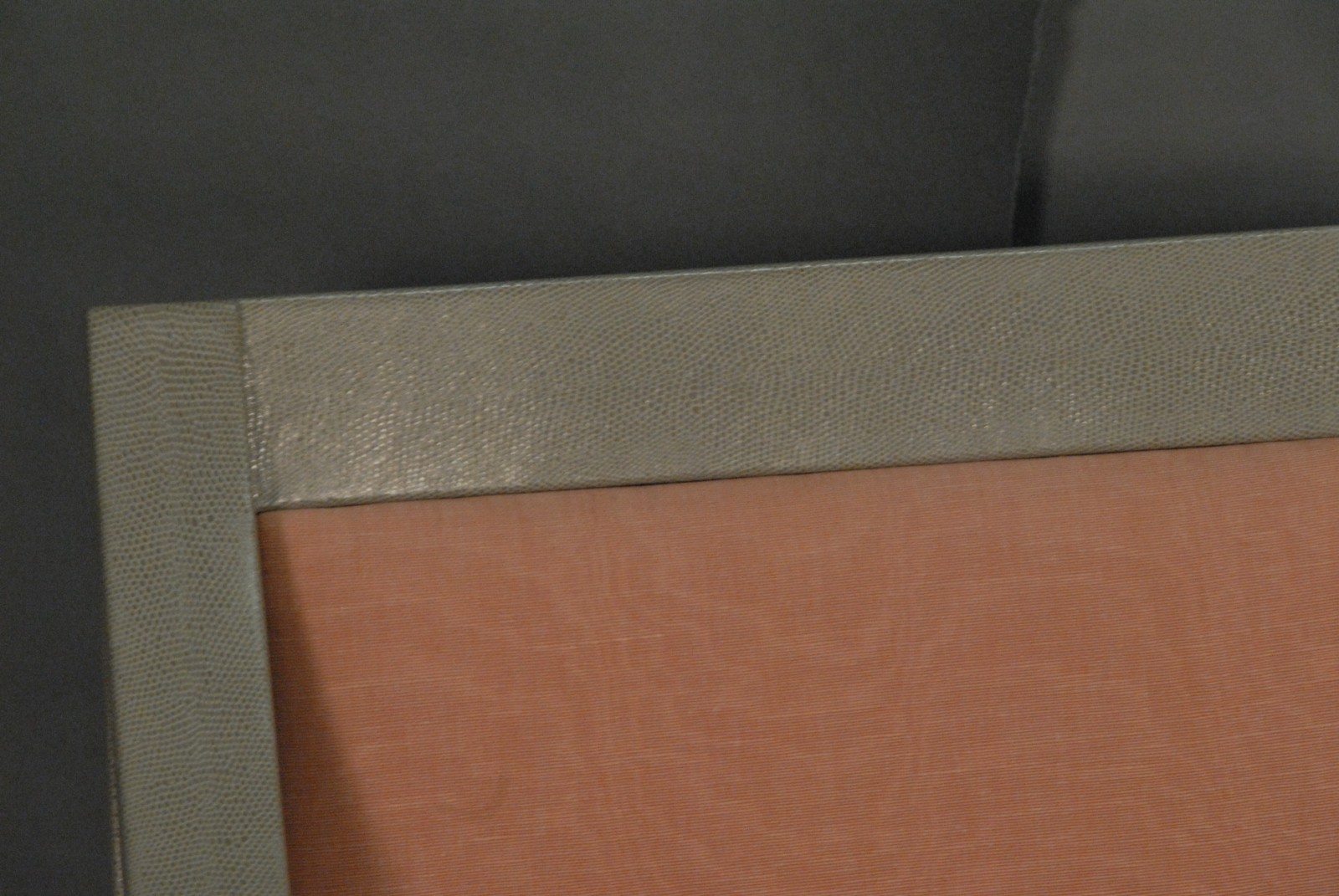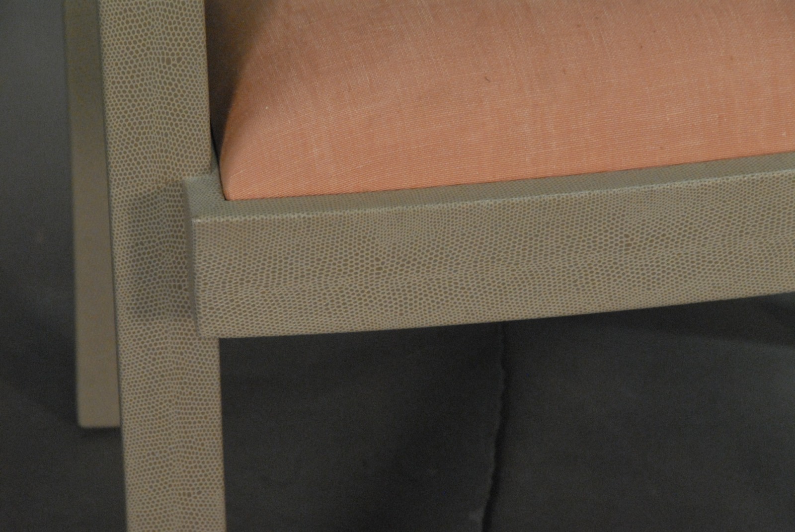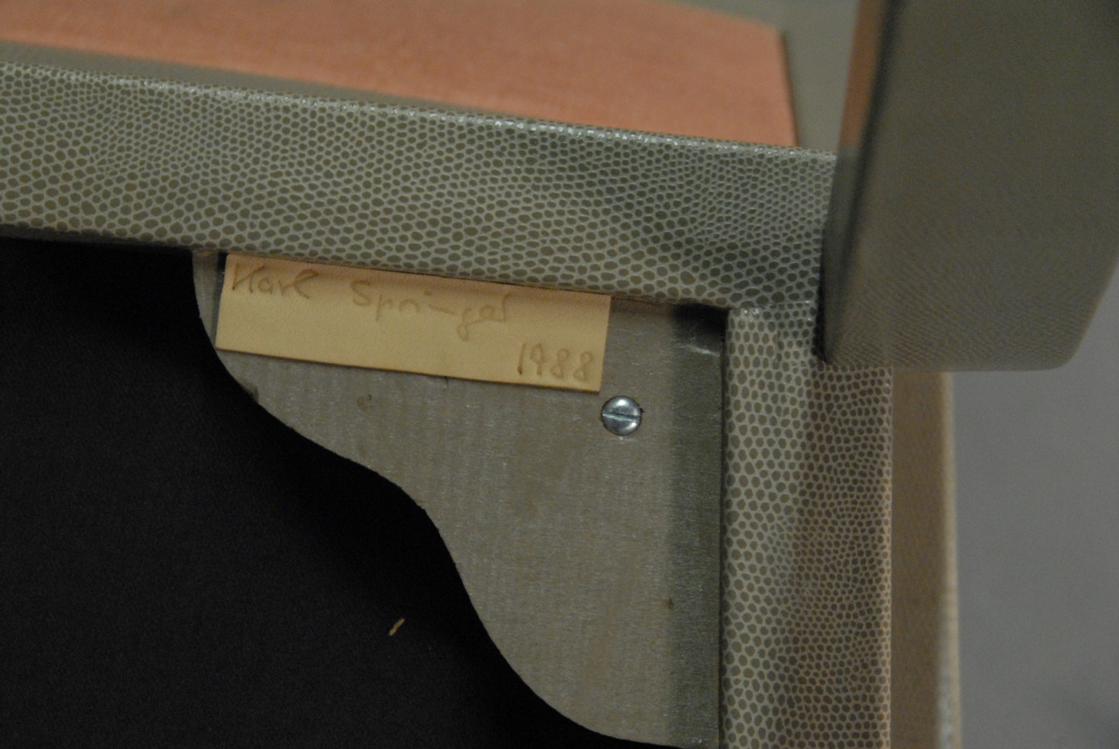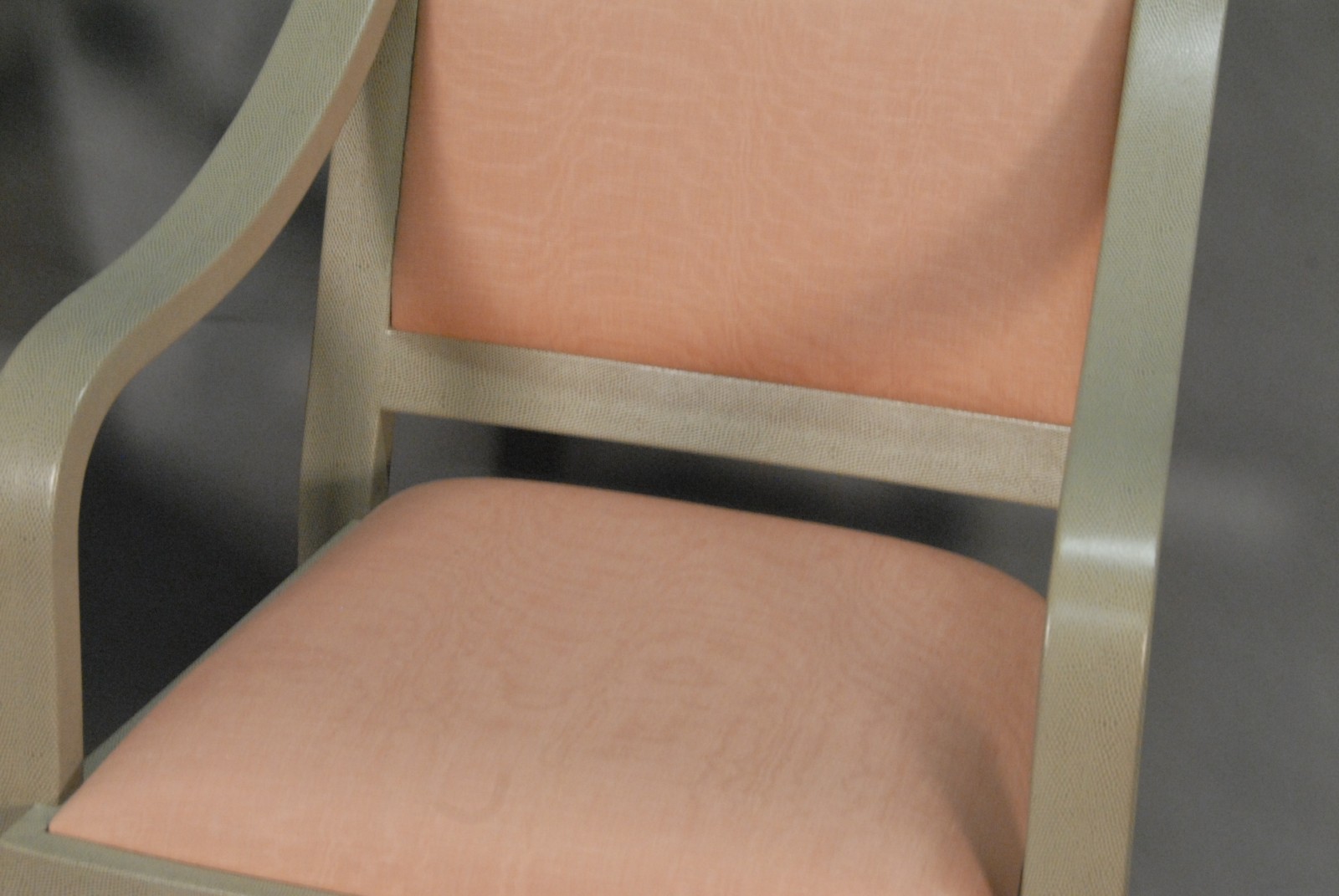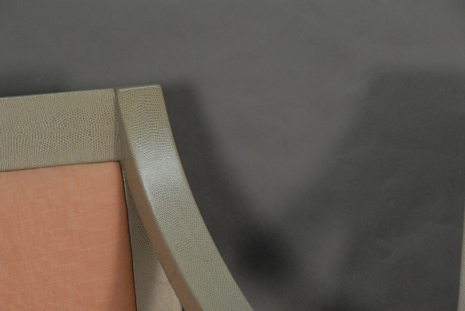 Pair of Karl Springer lizard veneer armchairs with insert cloth back and seat signed Karl Springer 1988.