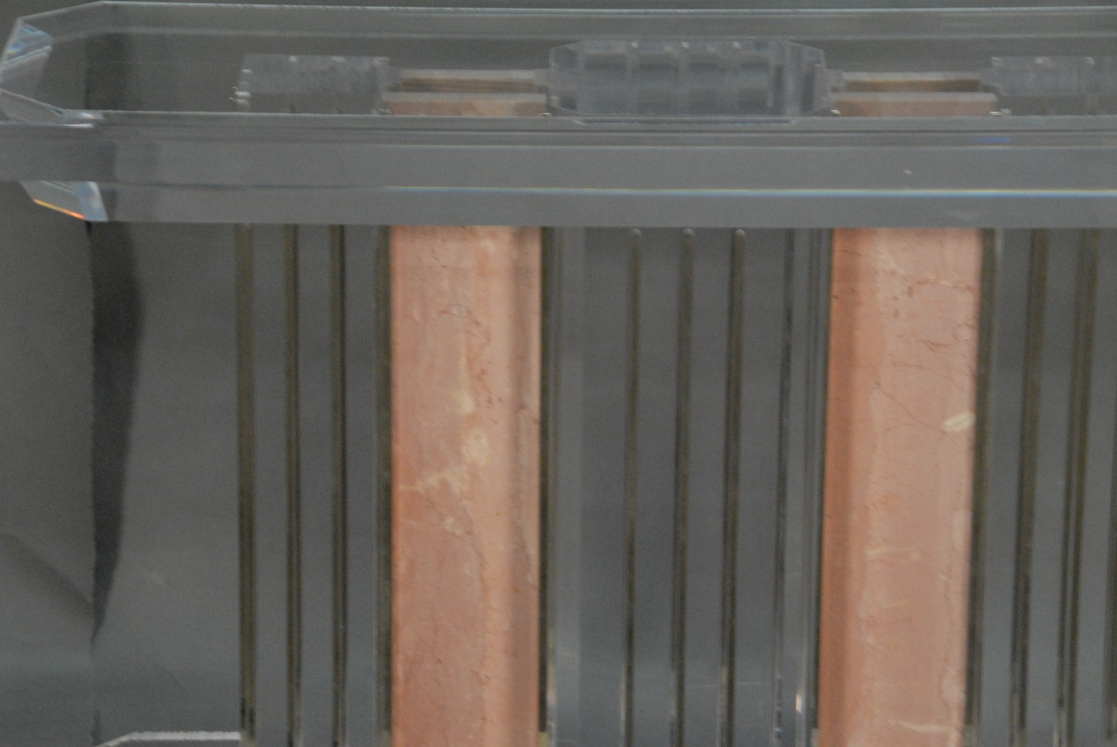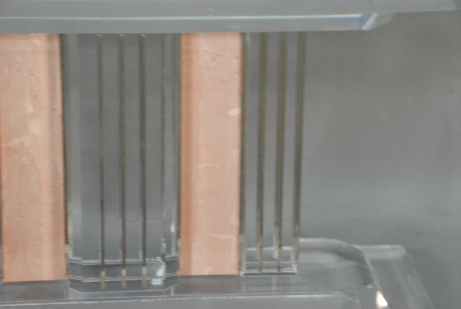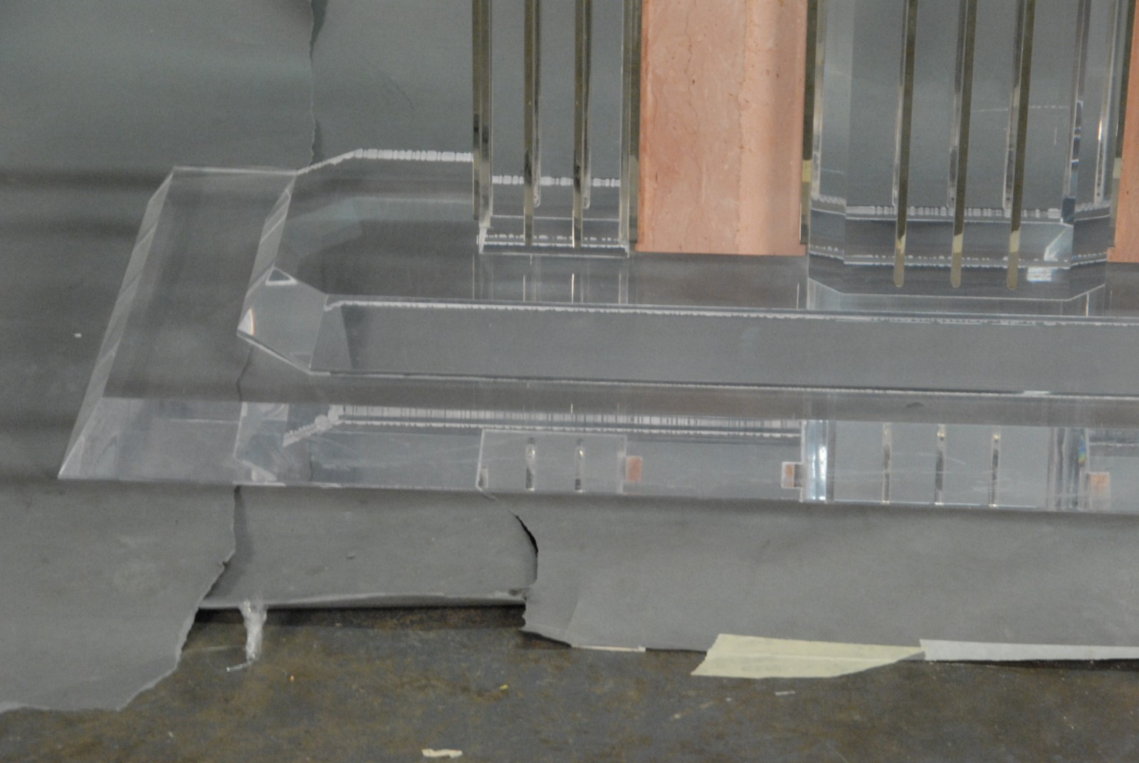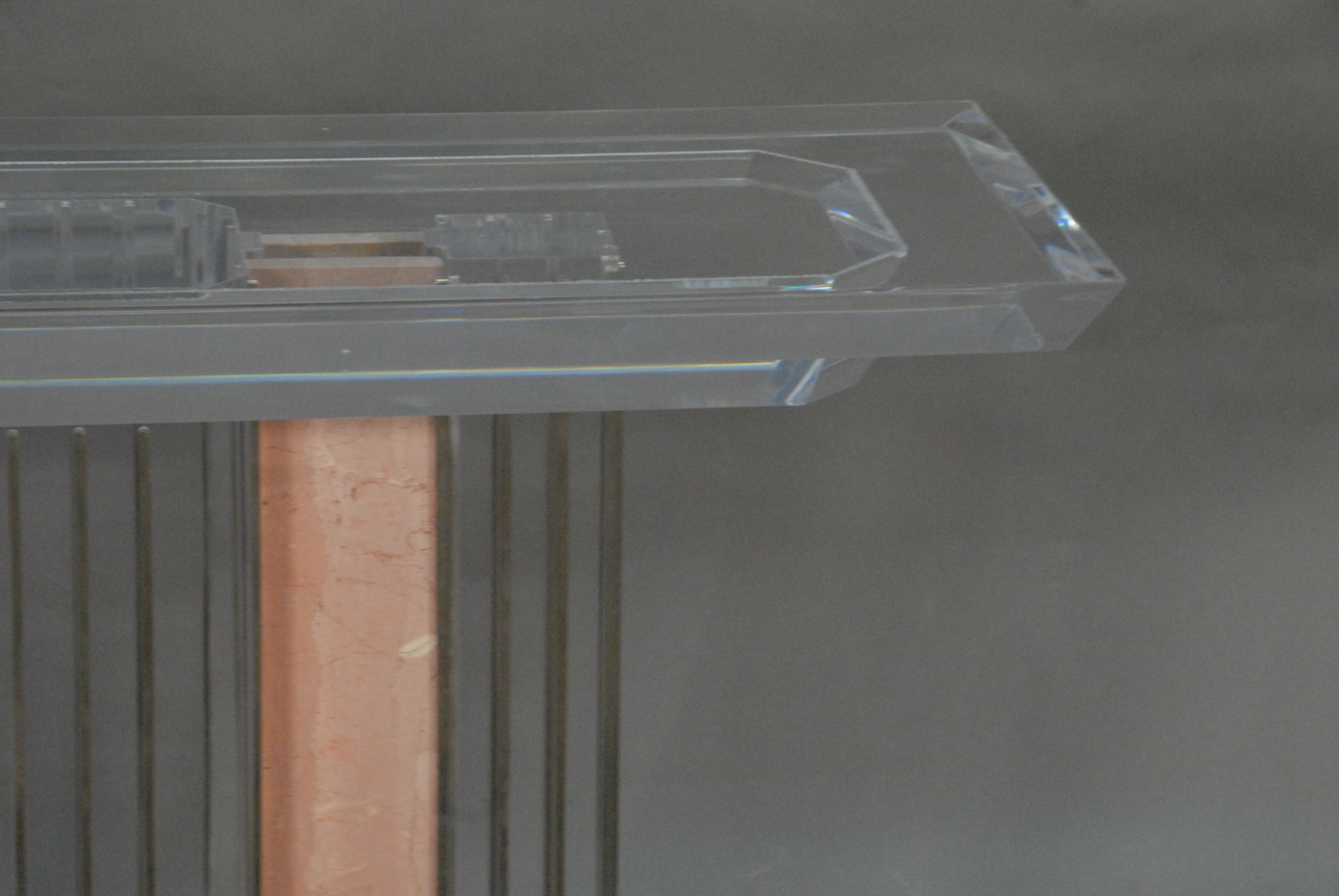 Karl Springer glass top dining table with solid lucite base inlaid with marble and metal strips.