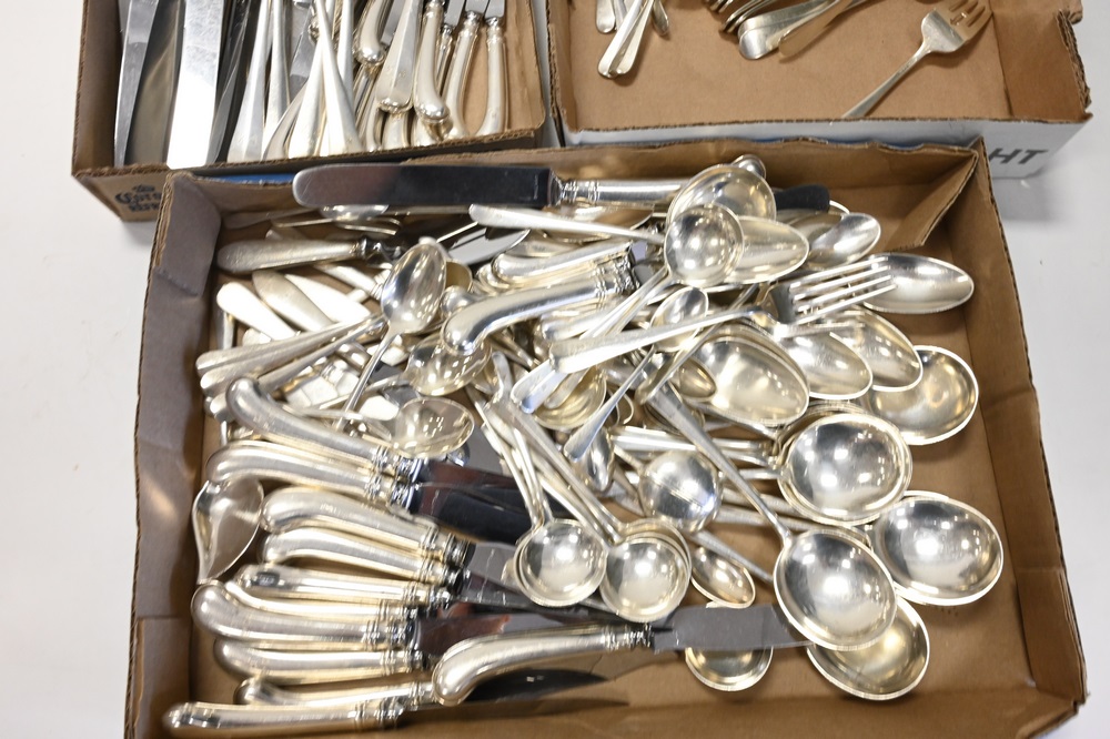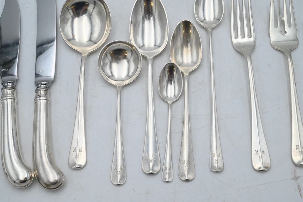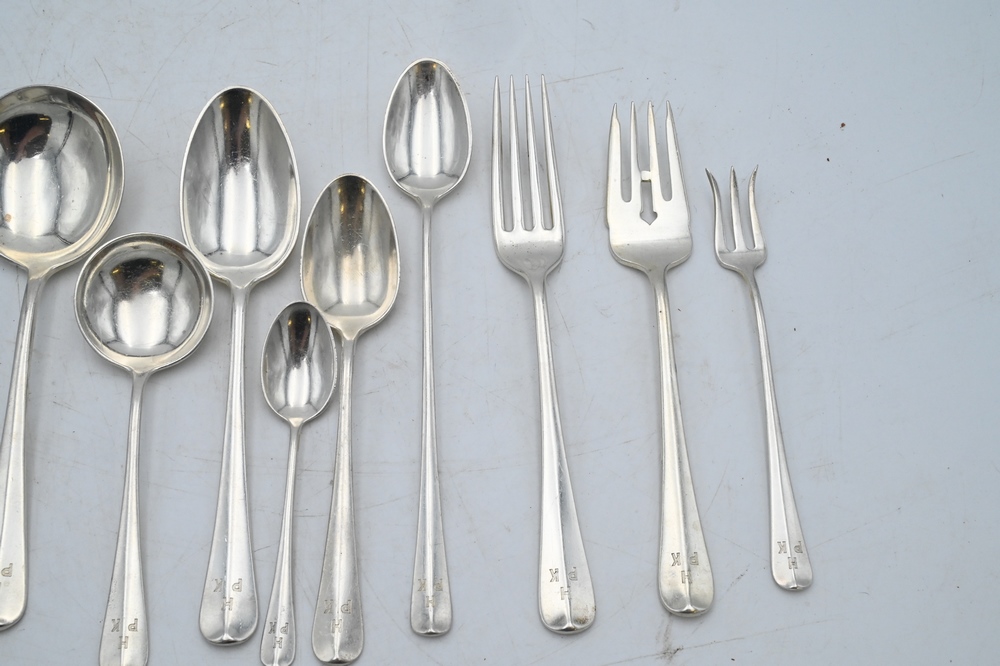Lot 392: 220 Piece Sterling Silver Flatware Set, to include 12 dinner knives; 12 small fish knives; 12 luncheon knives; 12 large fish knives; 12 butter knives; 3 large serving forks; 22 dinner forks; 12 salad forks; 11 fish forks; 11 iced tea spoons; 12 tablespoons; 22 demitasse spoons; 2 large serving spoons; 12 large soup spoons; 12 small soup spoons; 2 servers; 11 teaspoons; 11 dessert/sorbet spoons; 12 hors d’oeuvre forks; 1 sugar spoon; 1 spreader; 3 large spoons; 248 t.oz, plus 48 handles.