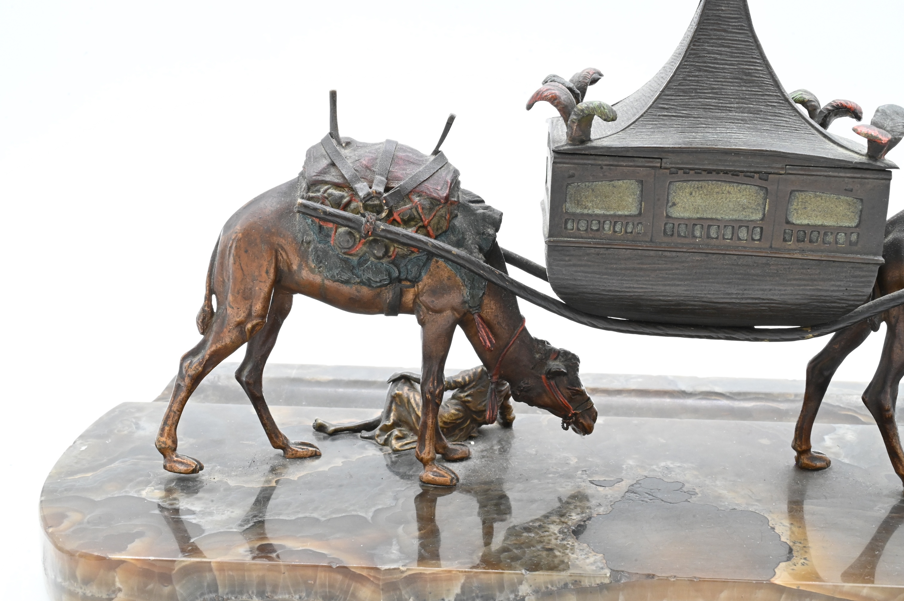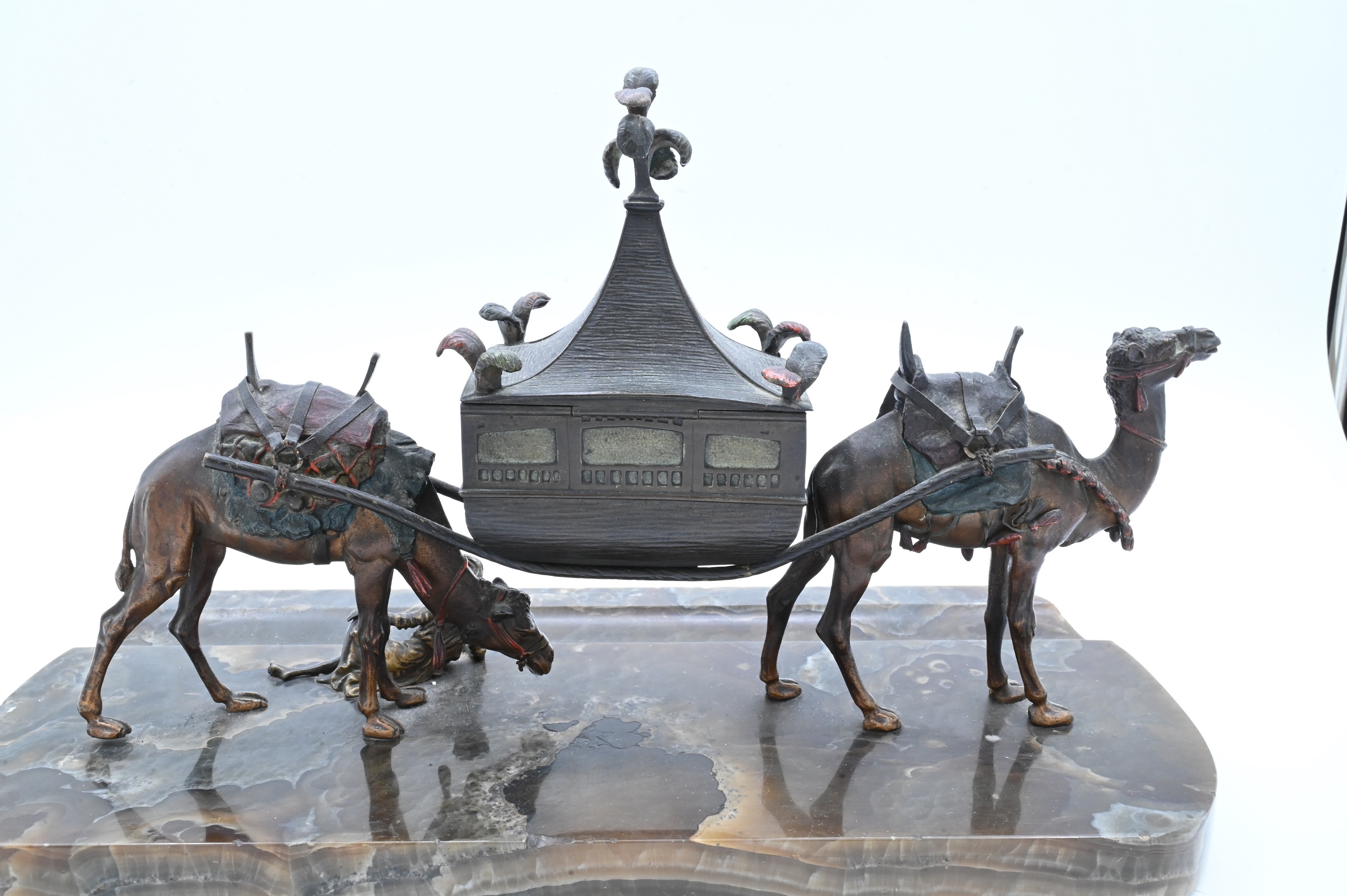 in the form of two camels carrying a howdah and a reclining figure on marble base