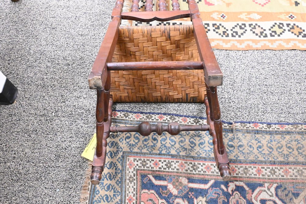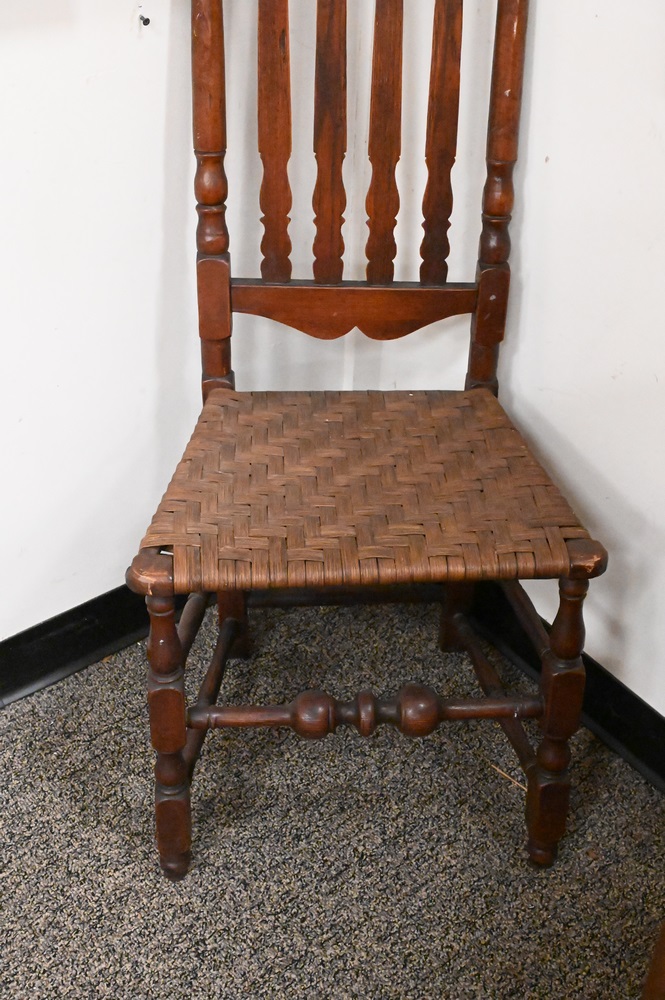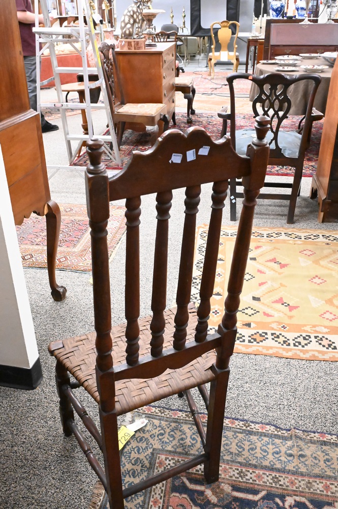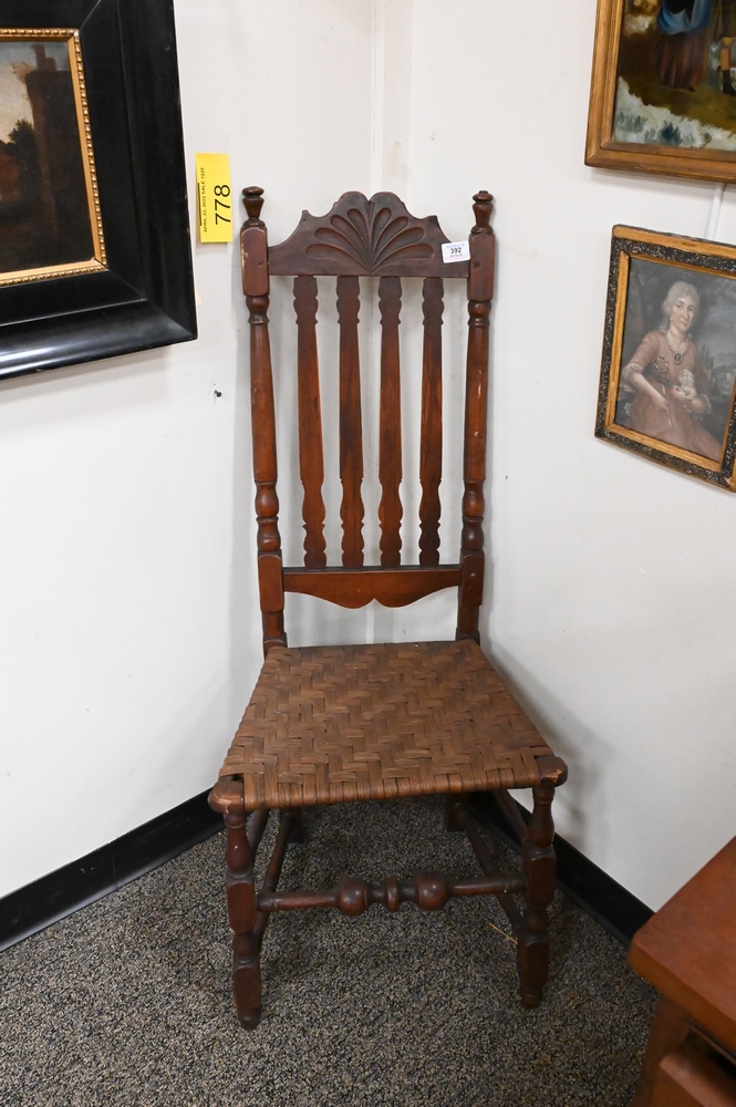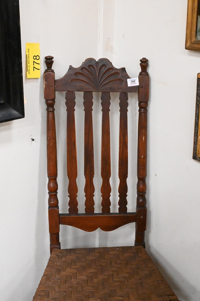Lot 392: Bannister Back Side Chair, having carved crest with fan carving, rush seat, block and turned legs, in old finish, 18th century, height 44 inches, seat height 17 inches. Provenance: An estate from Redding, CT.