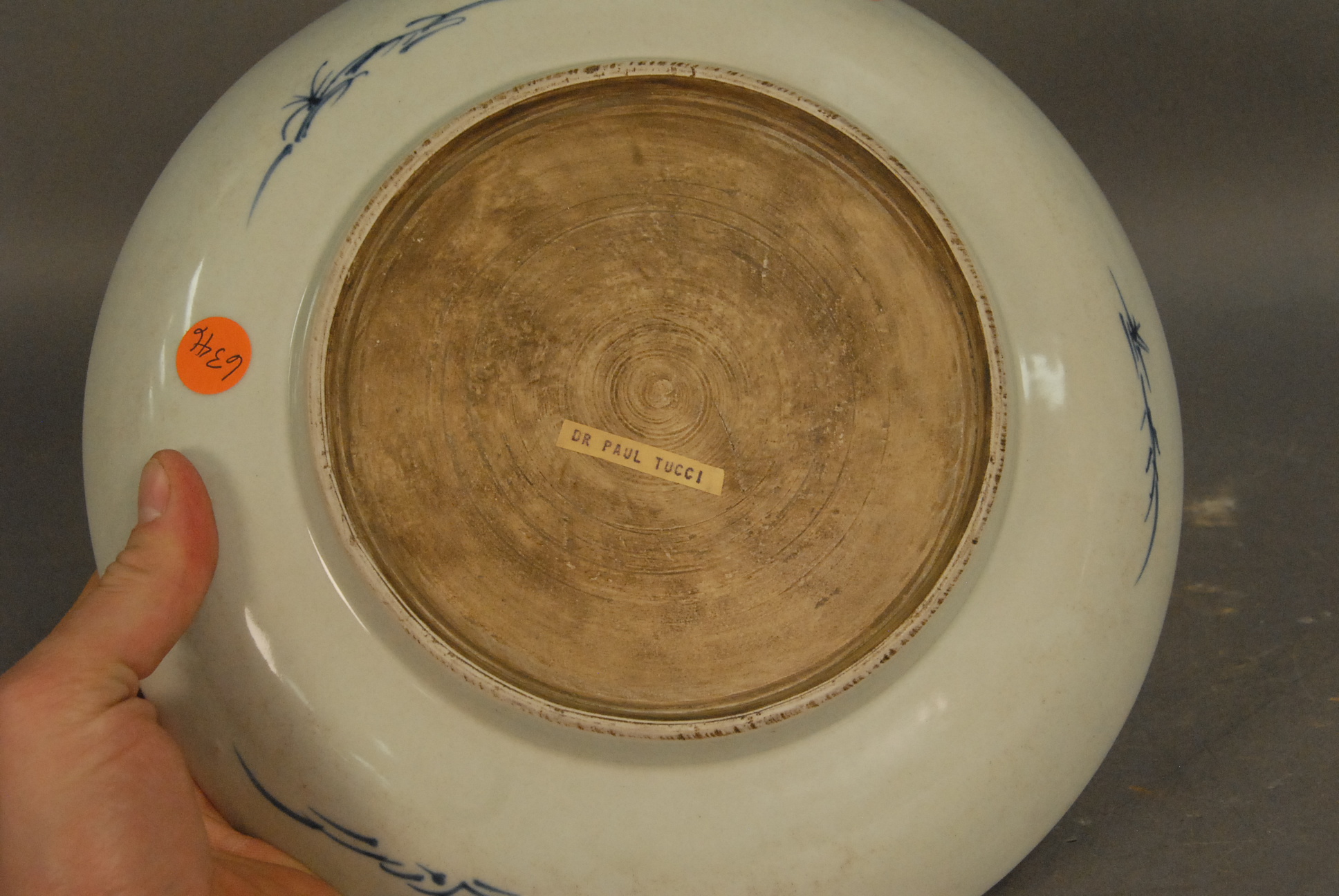 Blue and white plate having three men and a boy painted in the center, dia. 11.