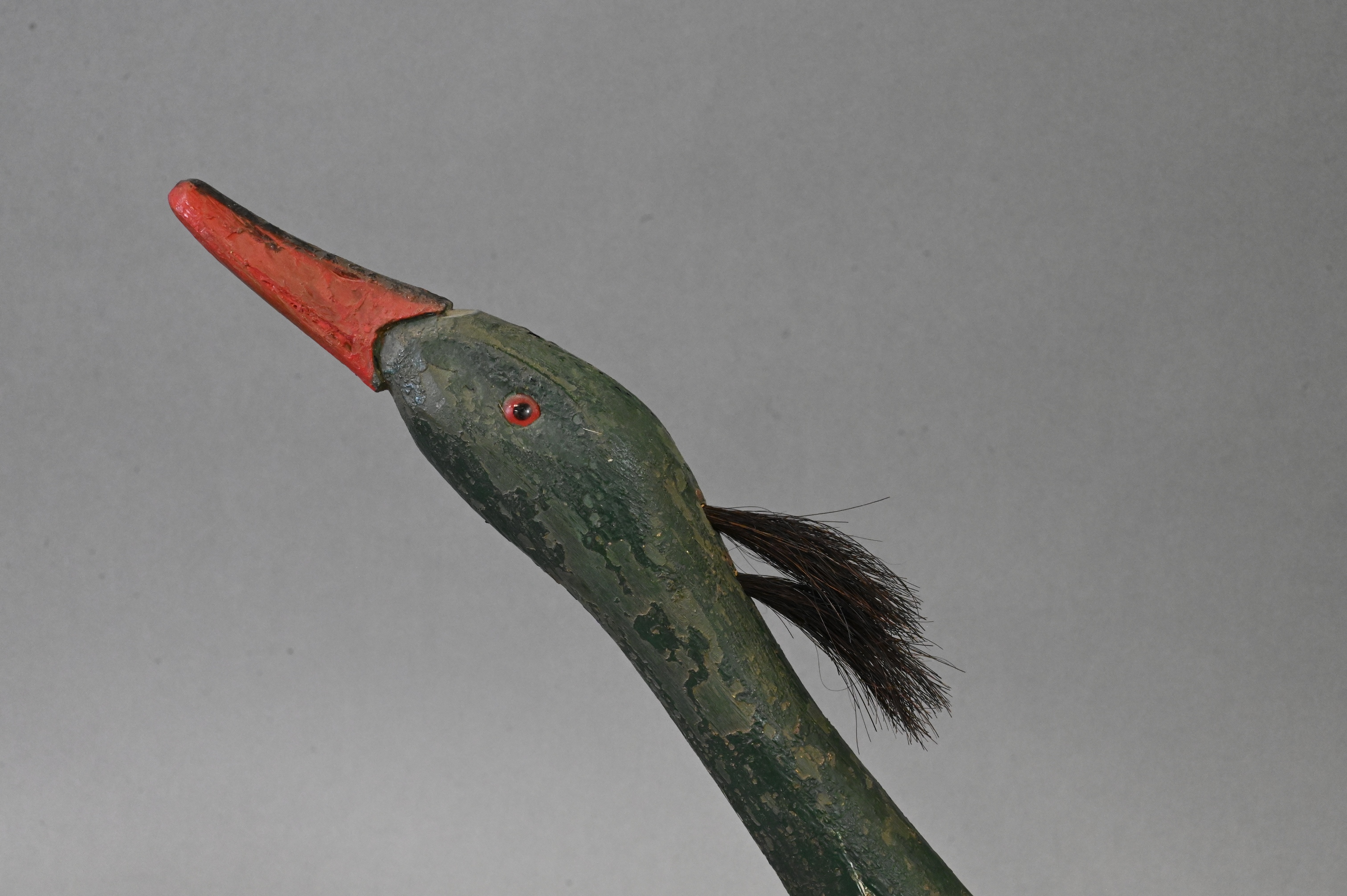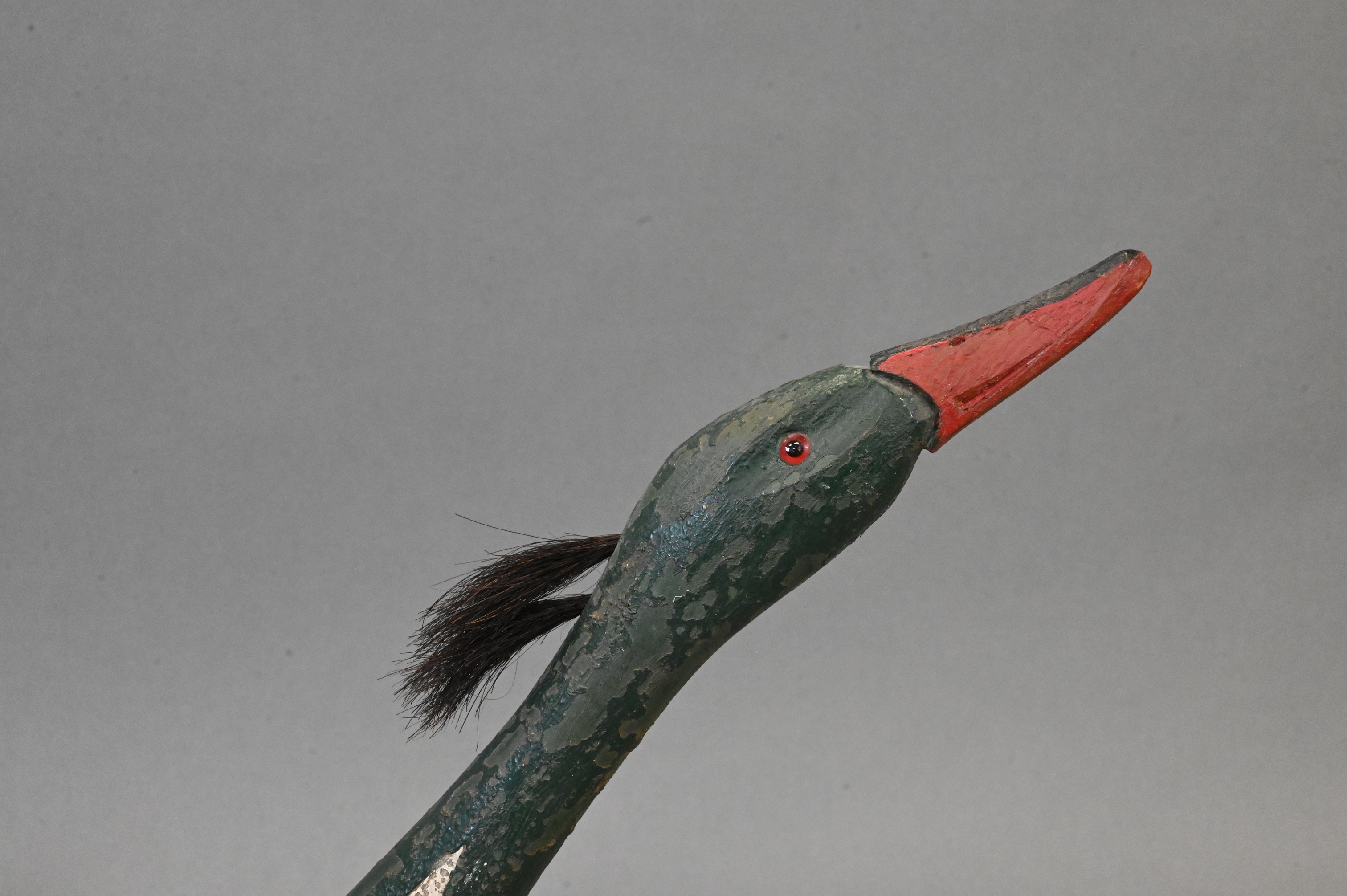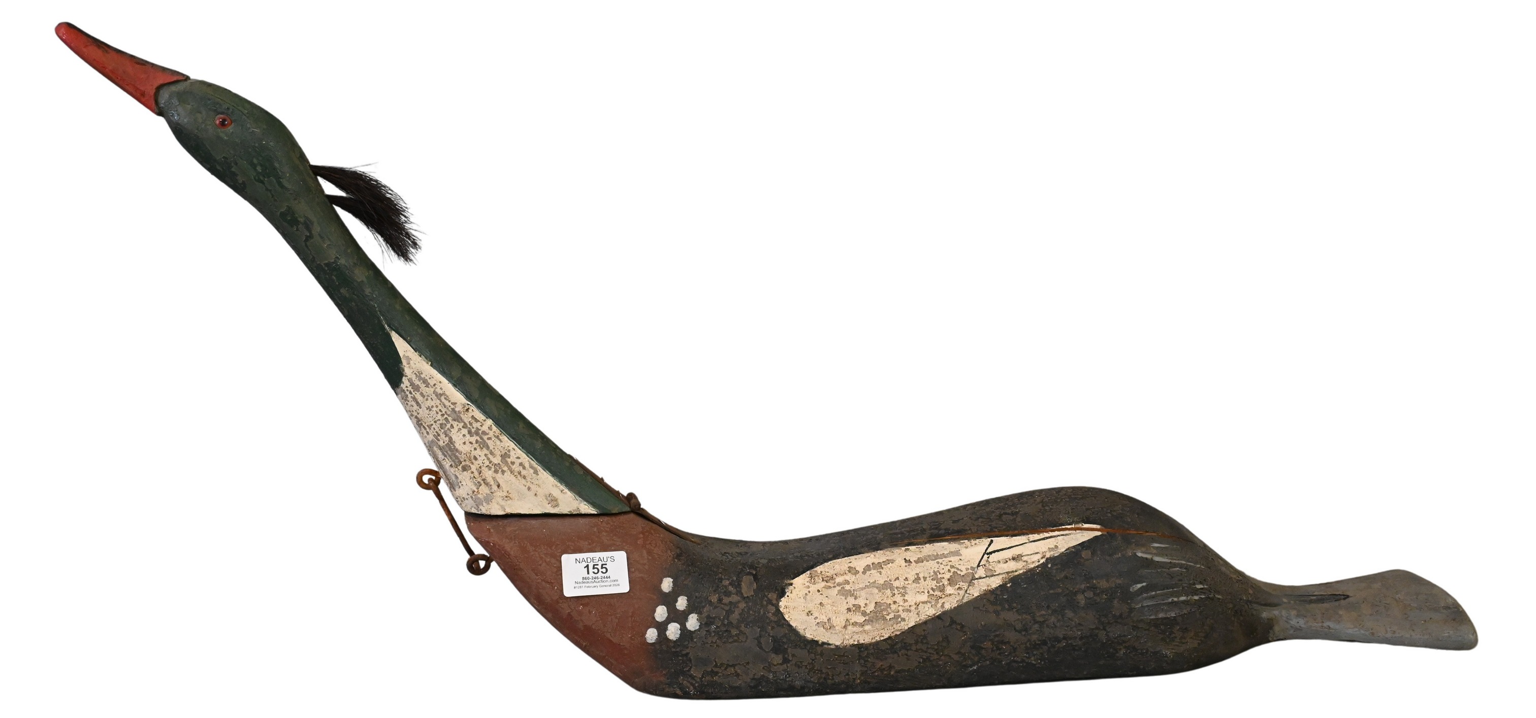 duck having painted red breasted merganser duck decoy, with hinged neck having hook and eye latch and red glass eyes, name plaque now absent