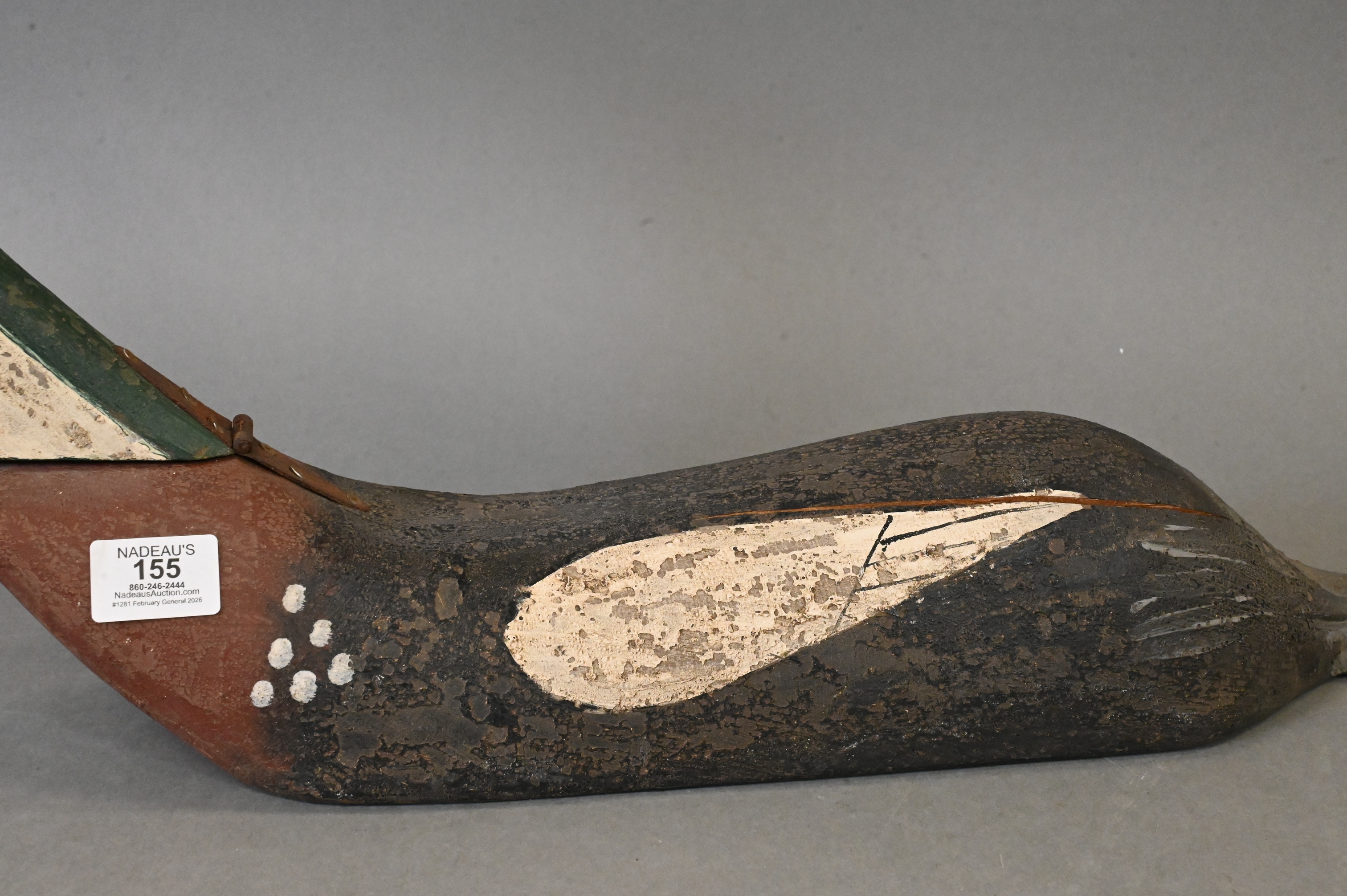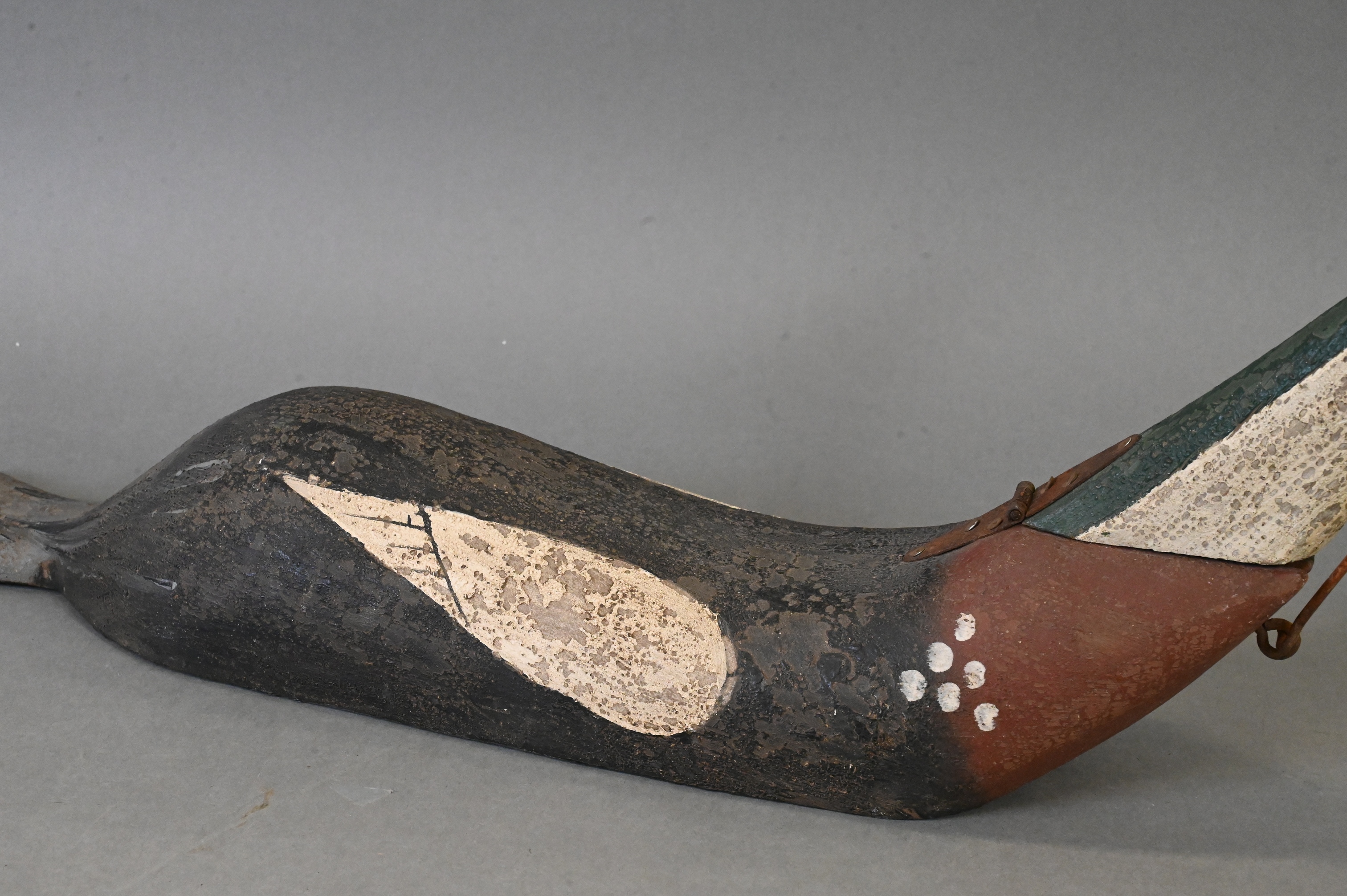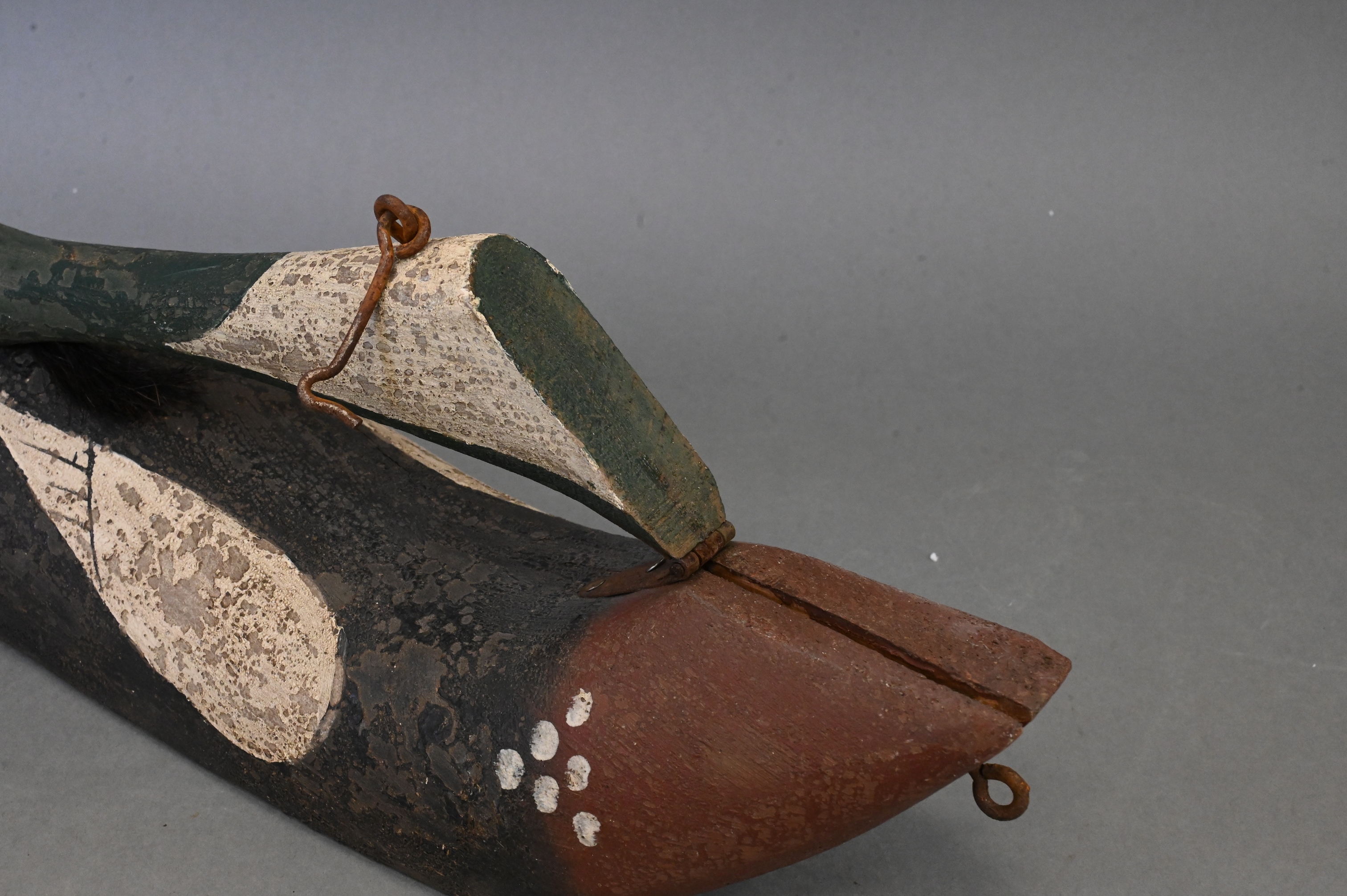 duck having painted red breasted merganser duck decoy, with hinged neck having hook and eye latch and red glass eyes, name plaque now absent