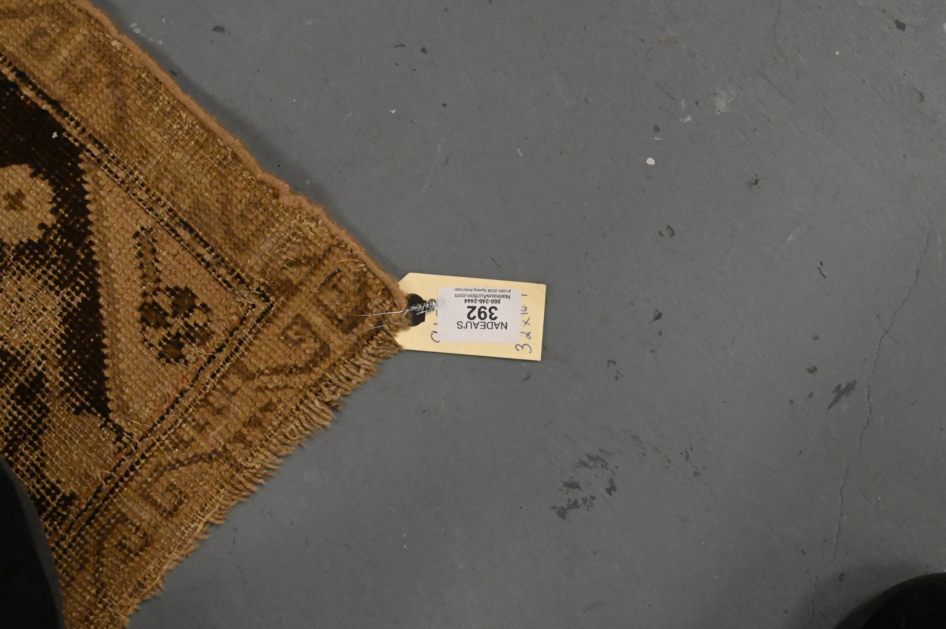With a dark brown to near-black field centering ivory geometric medallions flanked by stylized birds, trees, and latch-hook motifs, all within a reciprocal border. Reduced in length from a larger runner. Exhibits heavy wear and significant threadbare areas but retains bold graphic design.