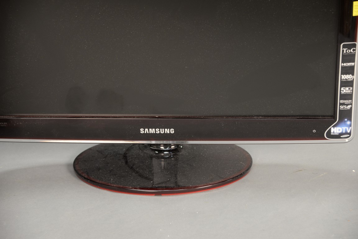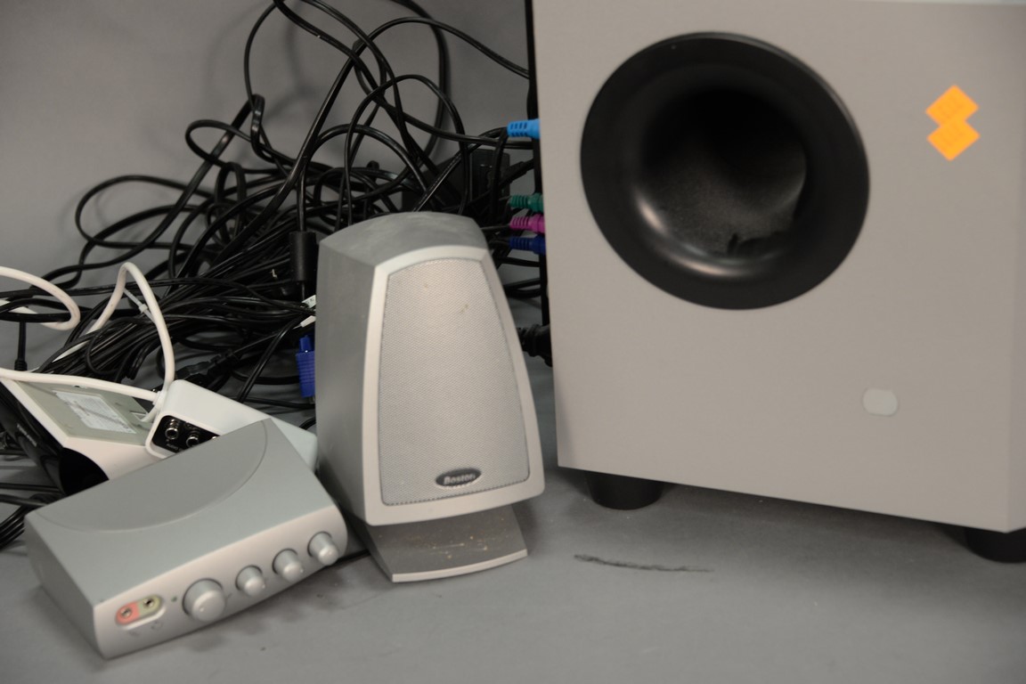 Electronics group including Boston Acoustics BA 7900 speaker set and Samsung monitor TV.