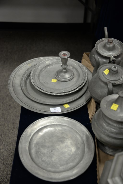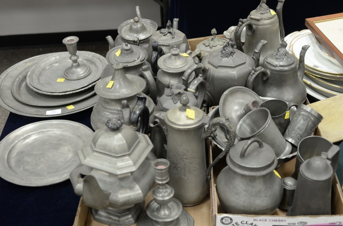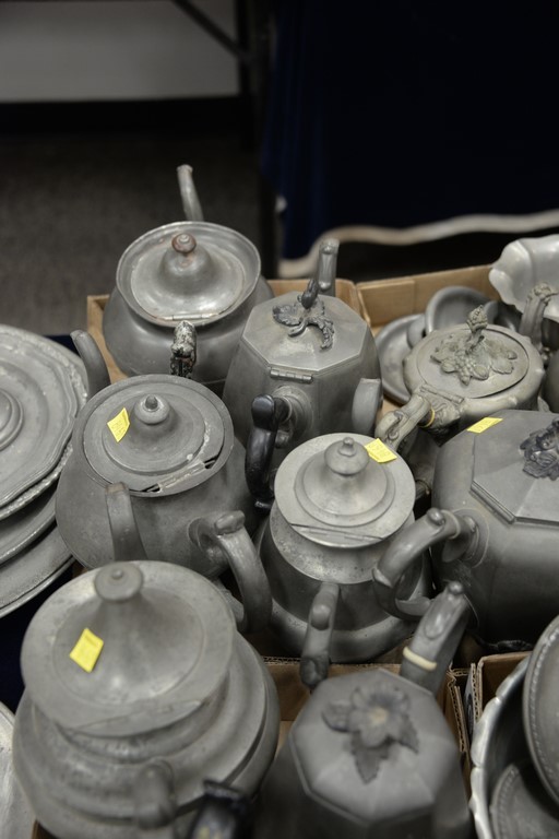 Lot 392: Five box lots of pewter teapots, chargers, cups, bowls, etc. Provenance: Estate of Arthur C. Pinto, MD