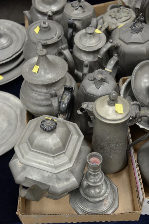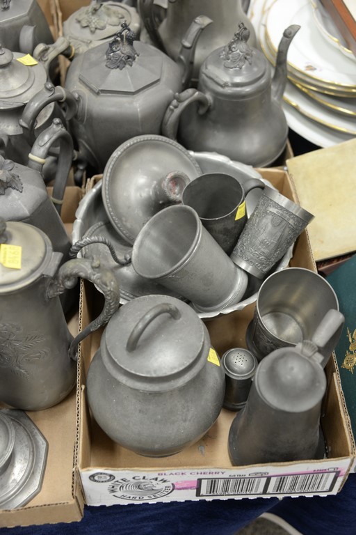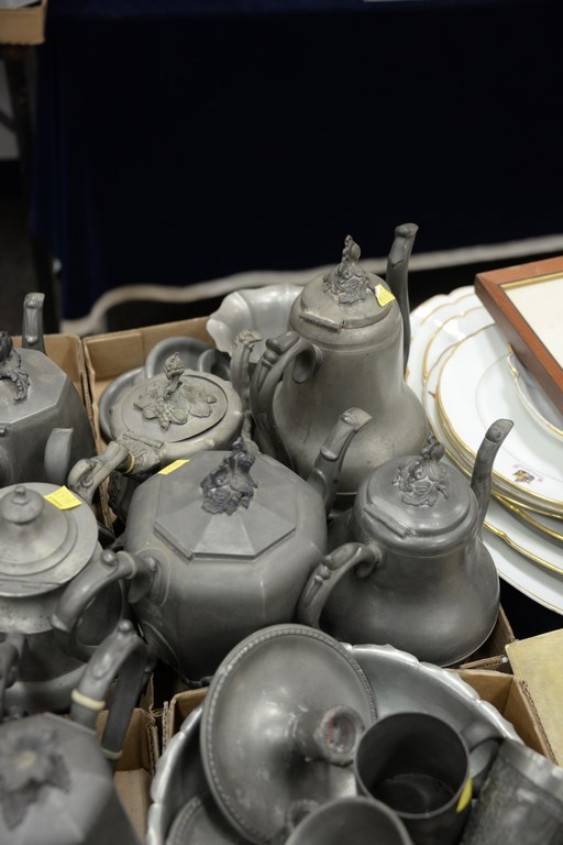 Five box lots of pewter teapots, chargers, cups, bowls, etc. Provenance: Estate of Arthur C. Pinto, MD