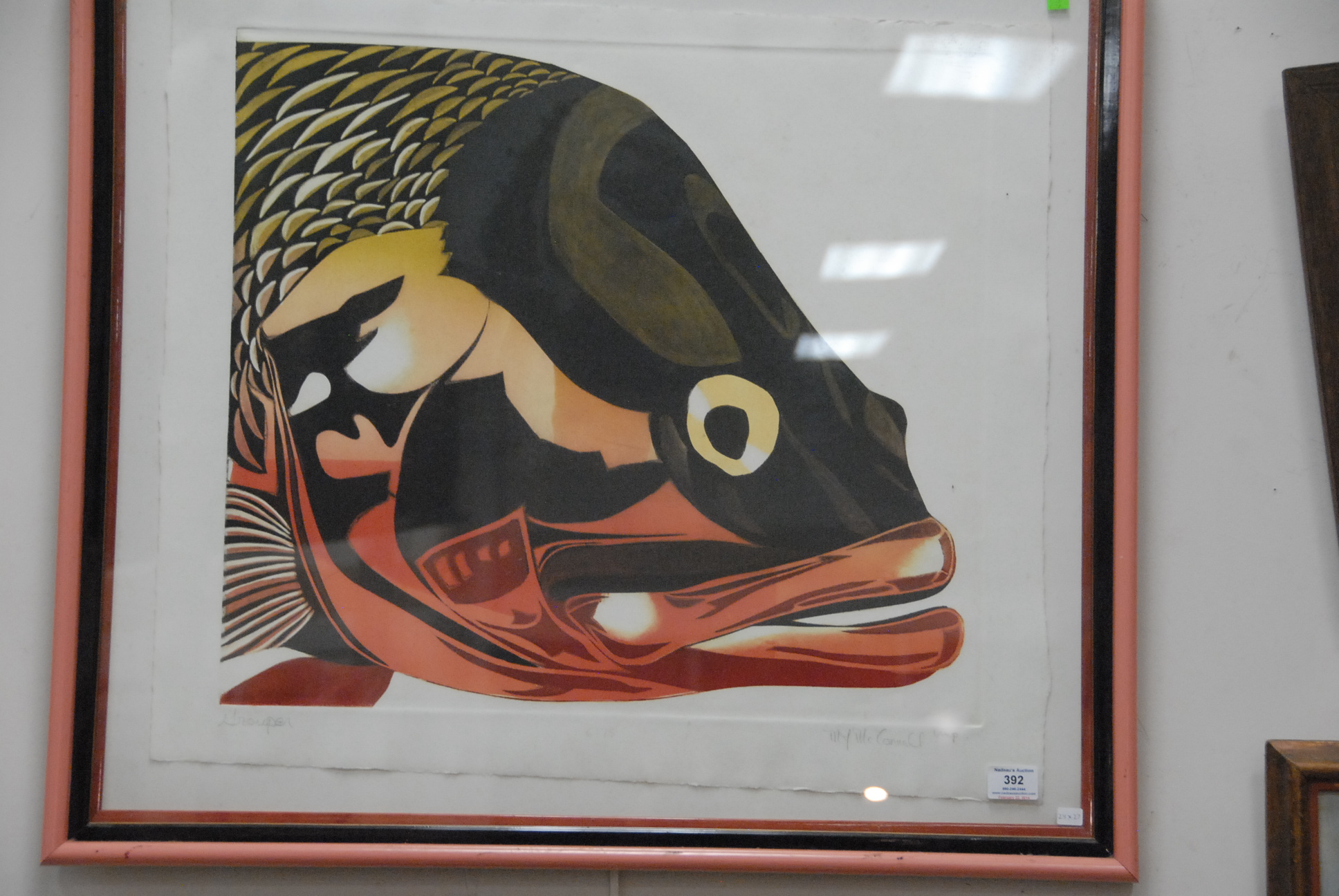 Lot 392: Group lot of framed items to include A. E. Bedford watercolor, Hak Hing board, McConnell Grouper etching, and Corkin oil on panel.