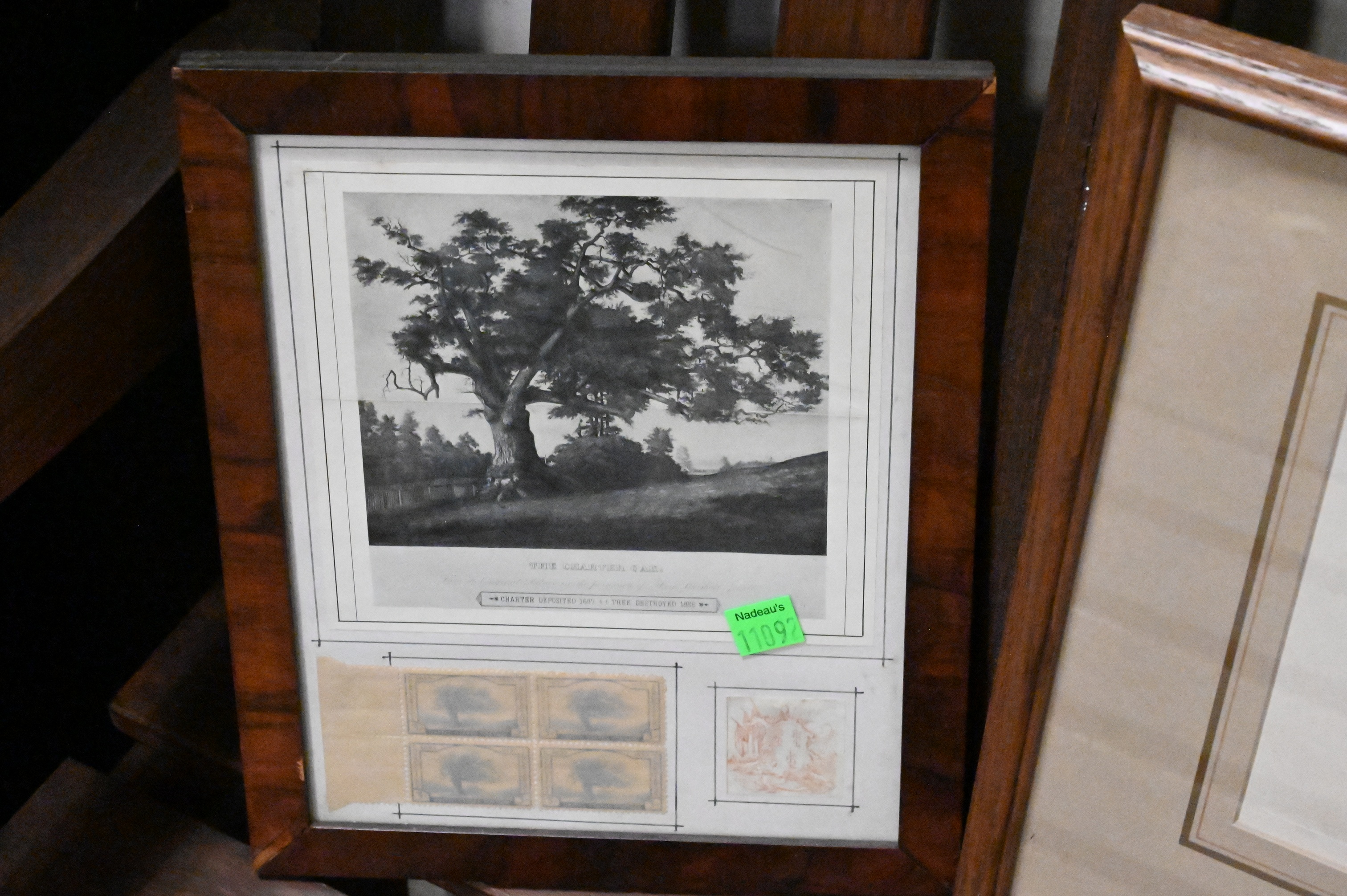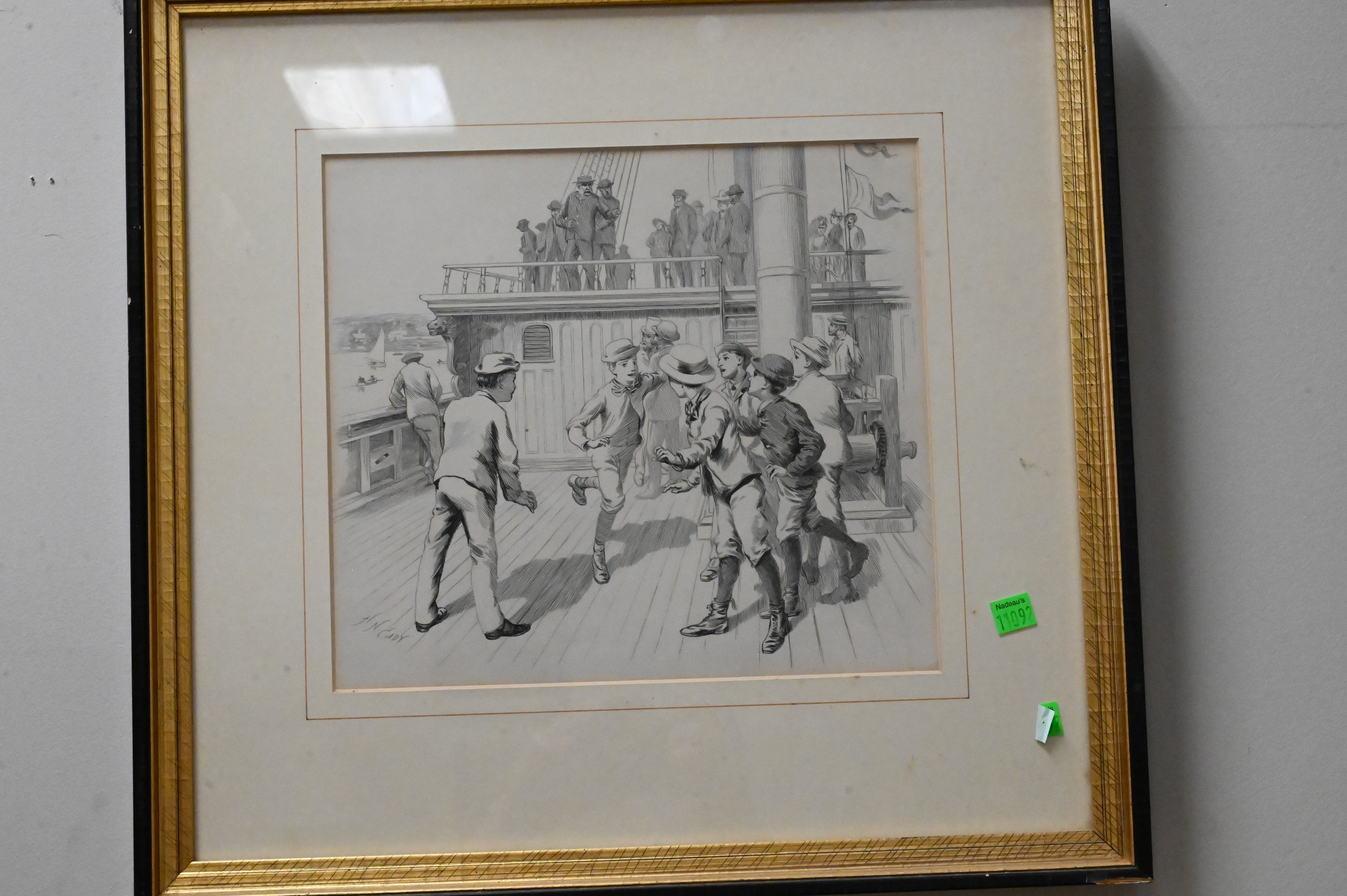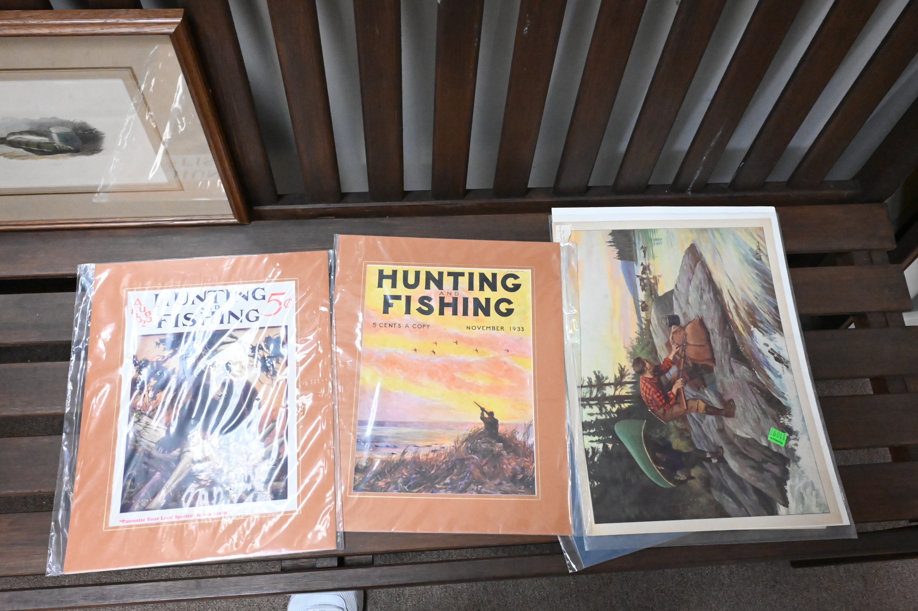 three Hunting and Fishing magazine covers, “Perch” engraving, Remington lithographs, 1935 Charter Oak 3 Cent Stamps, H.N. Cady lithograph of boys on a boat, Richard Brooks “The Bark Sarah Docking at Boston 1915″ etching edition 1/25 signed lower right Richard L. Brooks 11″ x 18”