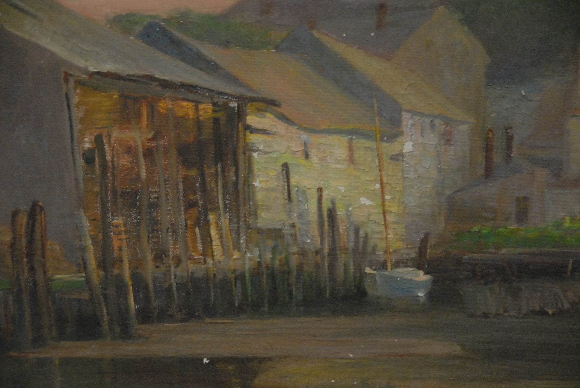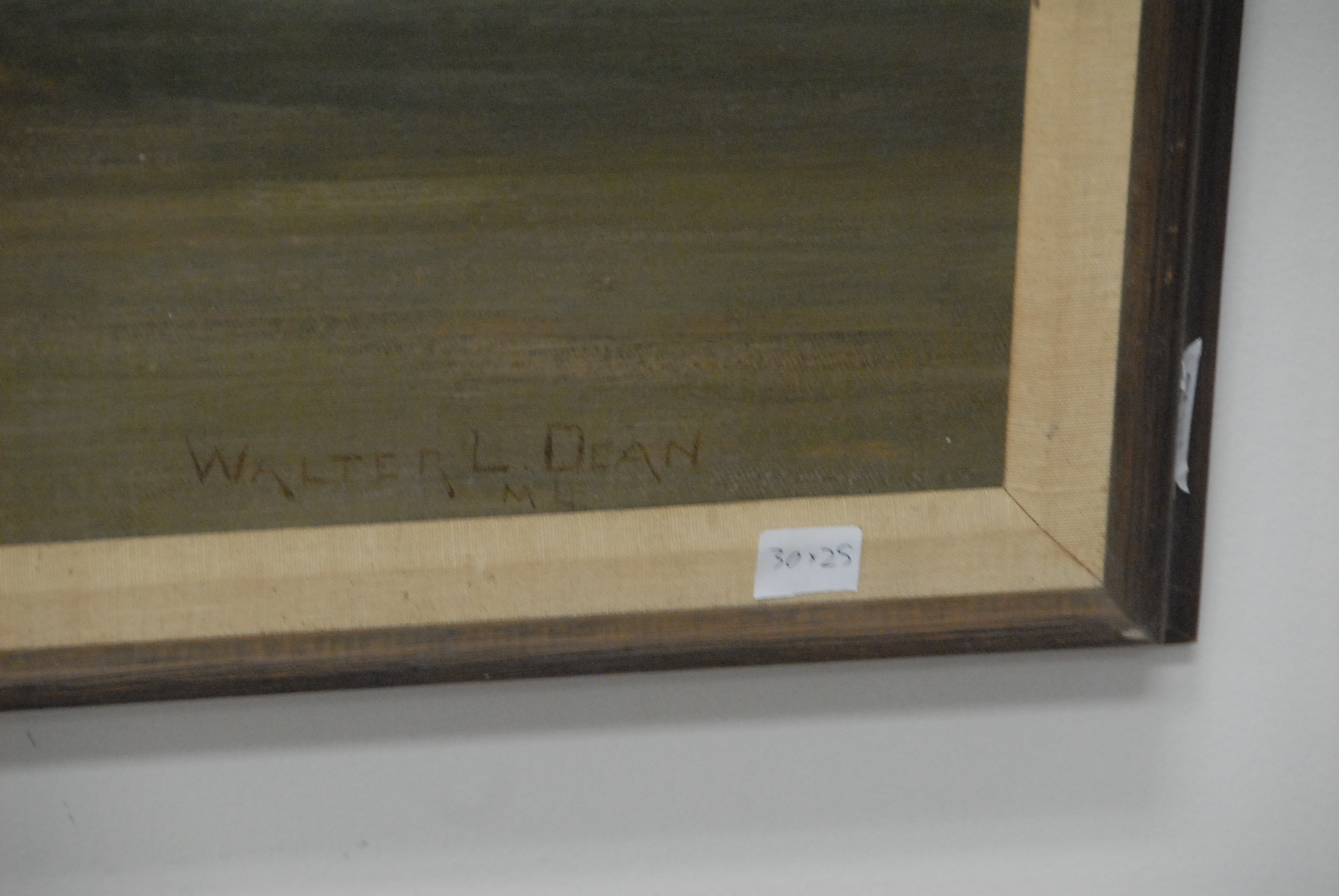 Oil on canvas of city’s edge with docks, signed lower left Walter L. Dean, 30 x 25.