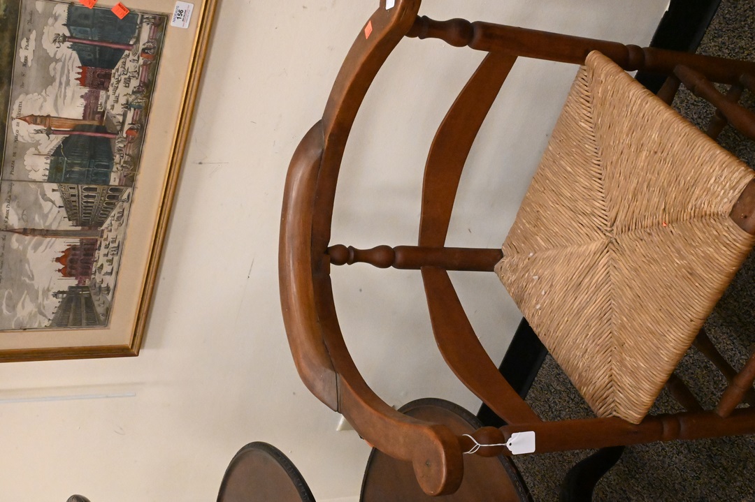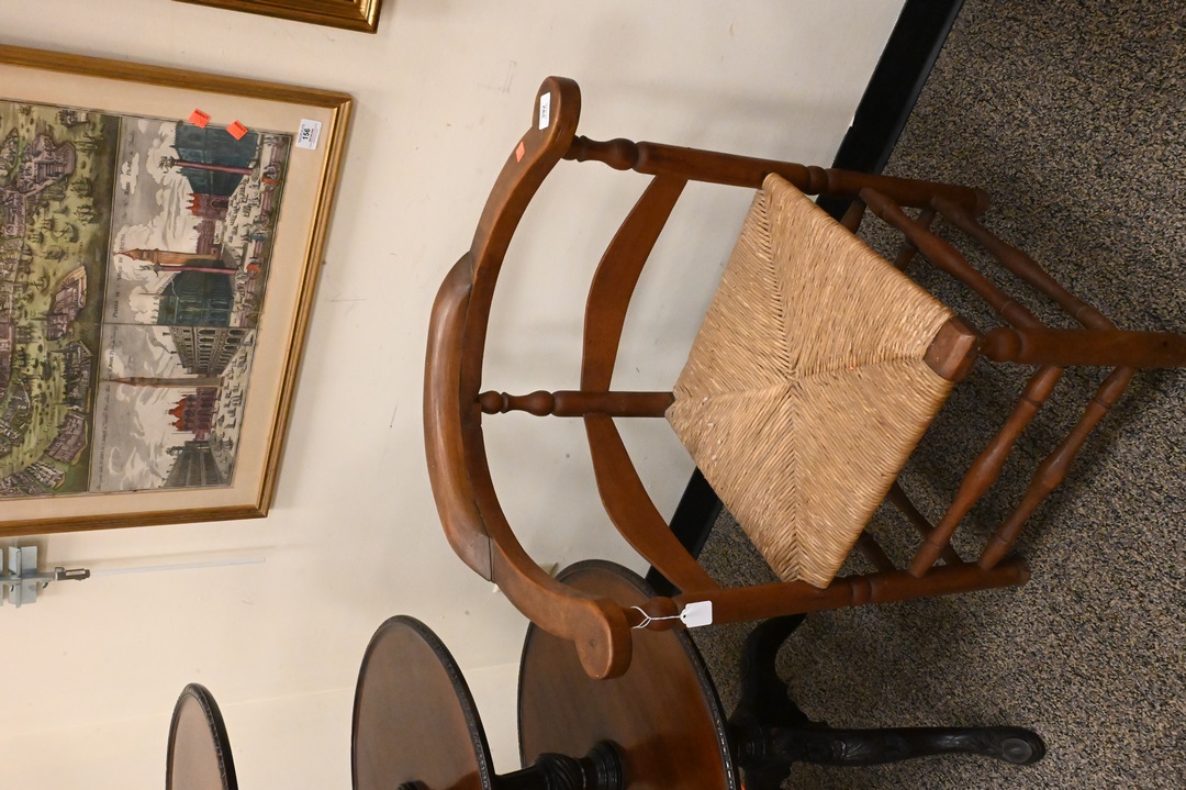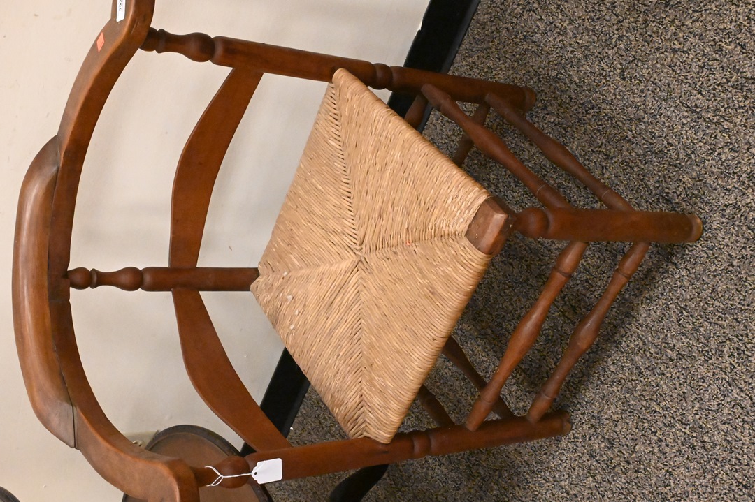 Queen Anne Corner Chair, having yoke back, rush seat on turned legs, seat height 16 inches, chair height 31 inches, Provenance: Estate of Cyril H. Moore Jr, Kent, Connecticut.