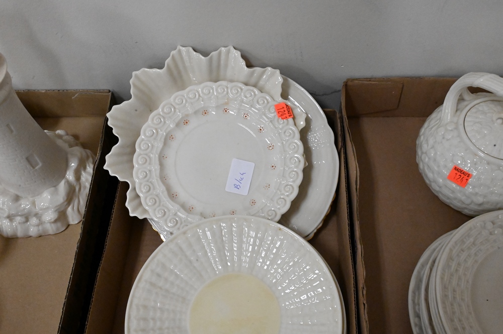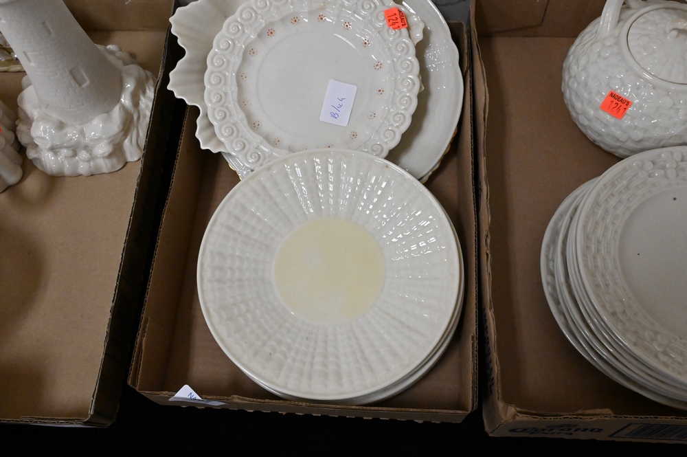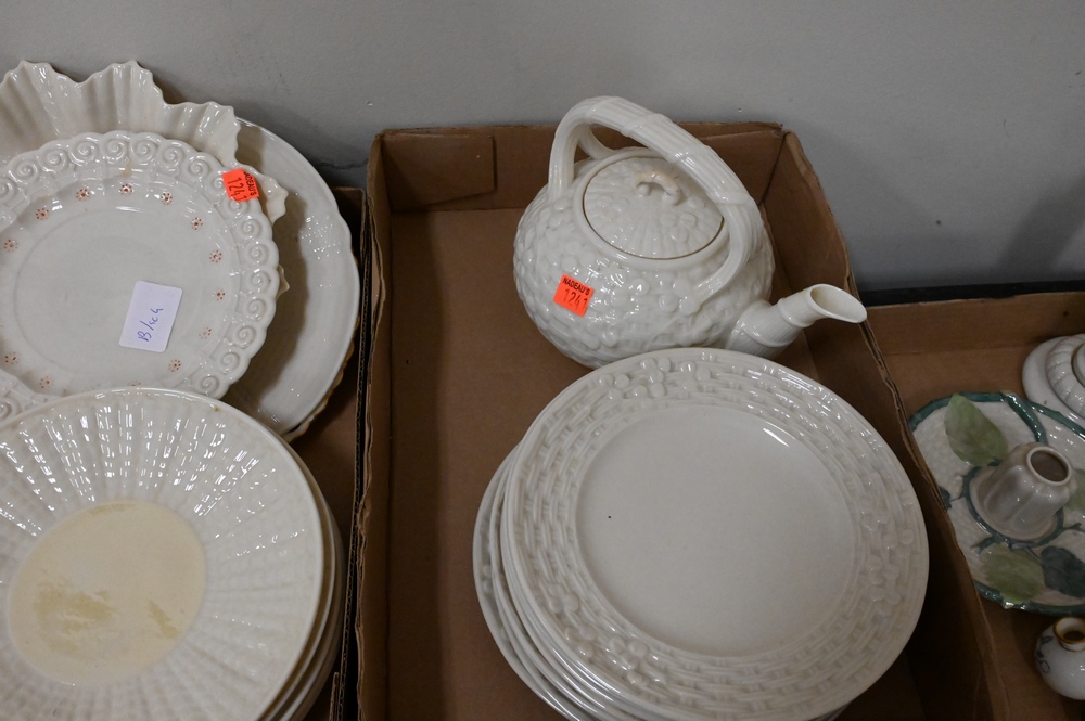 Three Tray Lots of Belleek, to include plates, teapot, shell dishes, etc.; all with black mark. Provenance: Collections of Norma Reilly, New Jersey.