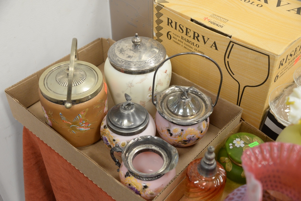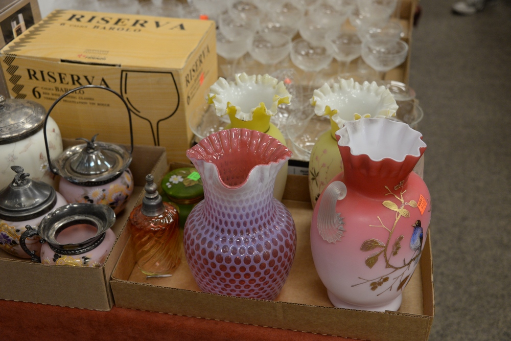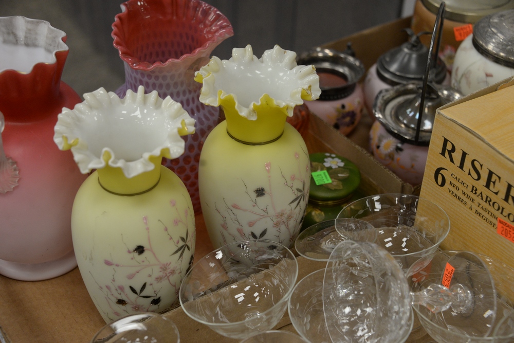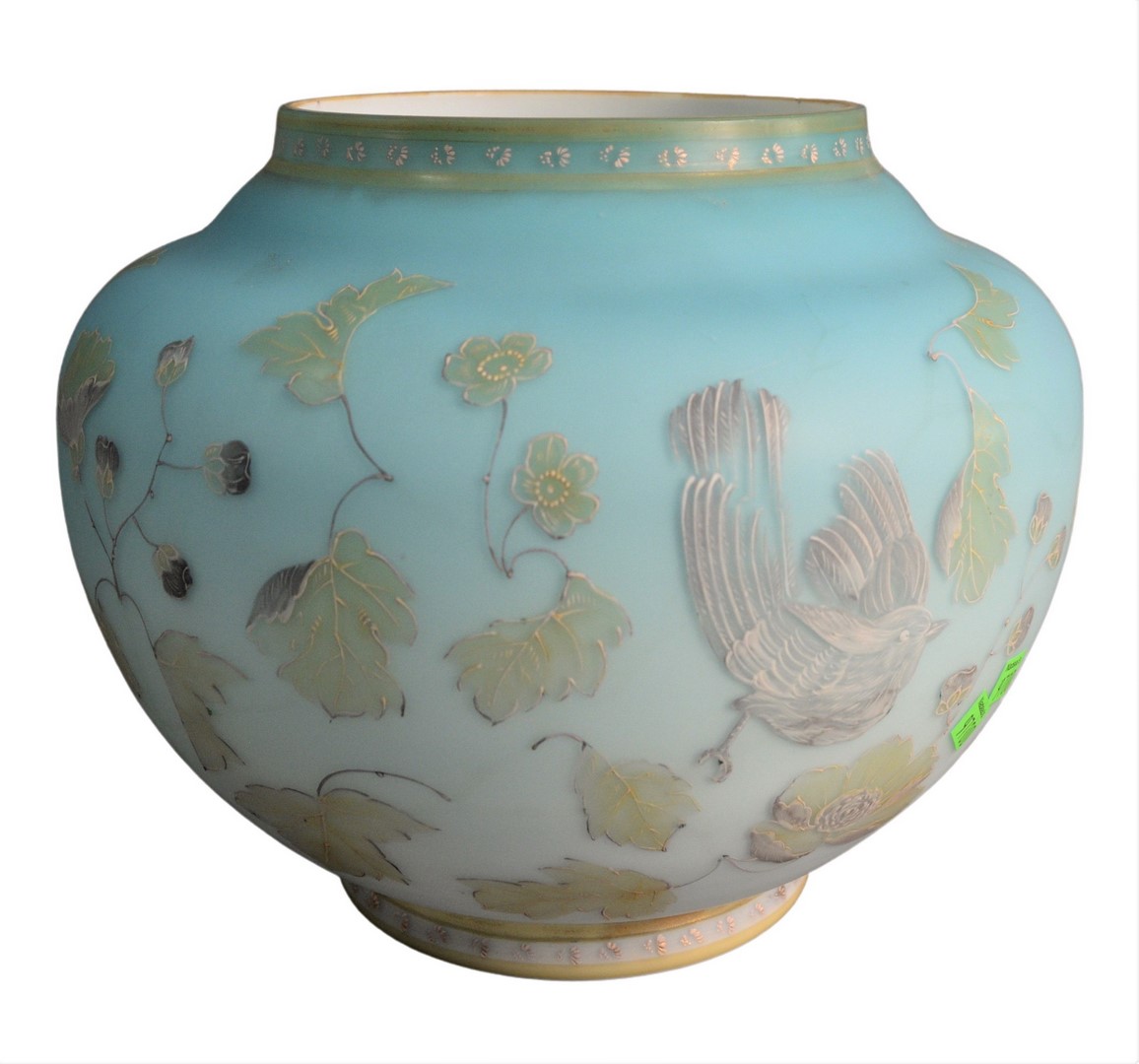 Twelve Piece Group of Satin Glass, stone with Enameling, to include a three piece set of pink having creamer, covered sugar and biscuit jar; a pair of yellow vases; a Mount Washington pink vase with a bird; a white jar having floral details and a silver plated lid; coinspot pitcher; a cranberry glass bottle; pink vase height 10 inches, width 7 1/2 inches, along with Large Turquoise Satin Glass Planter, having white and green floral enameling to the exterior. Provenance: Estate of James Wadhams.