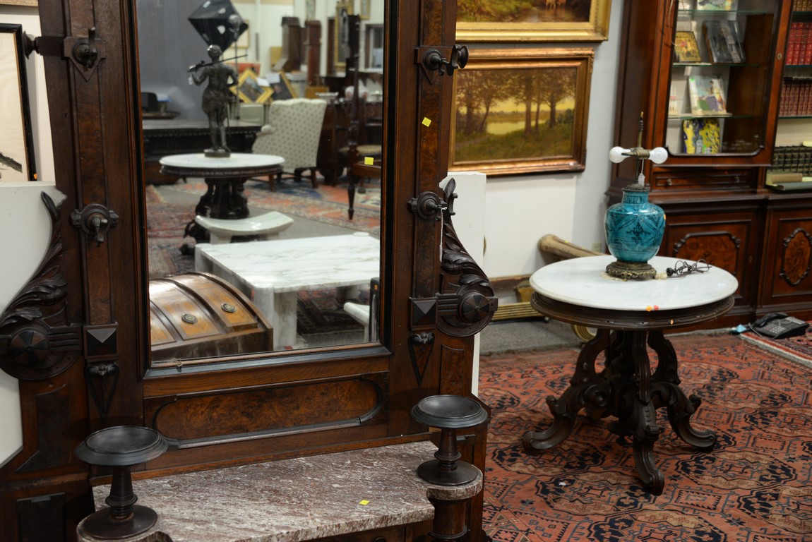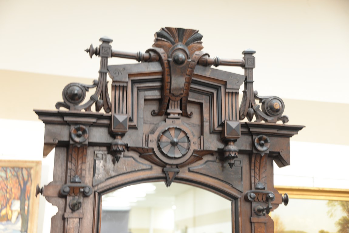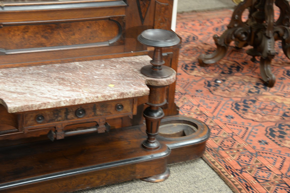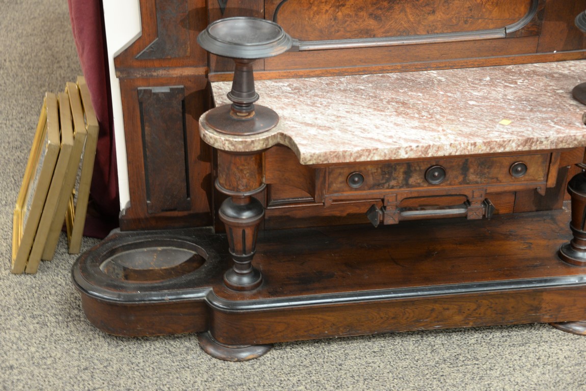 Lot 392: Victorian walnut and burl walnut hall rack having carved crest center mirror flanked by six original brass hat hooks and two key dis…