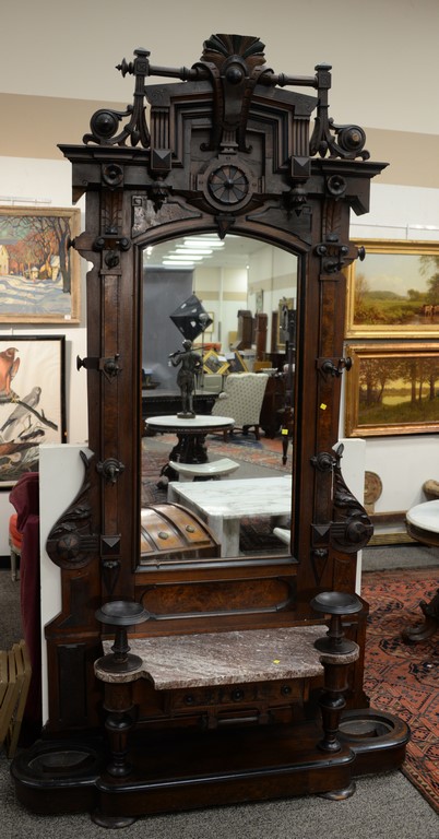 Victorian walnut and burl walnut hall rack having carved crest center mirror flanked by six original brass hat hooks and two key dishes both umbrella holder and dishes missing. ht. 104in. wd. 60in. dp. 18in.