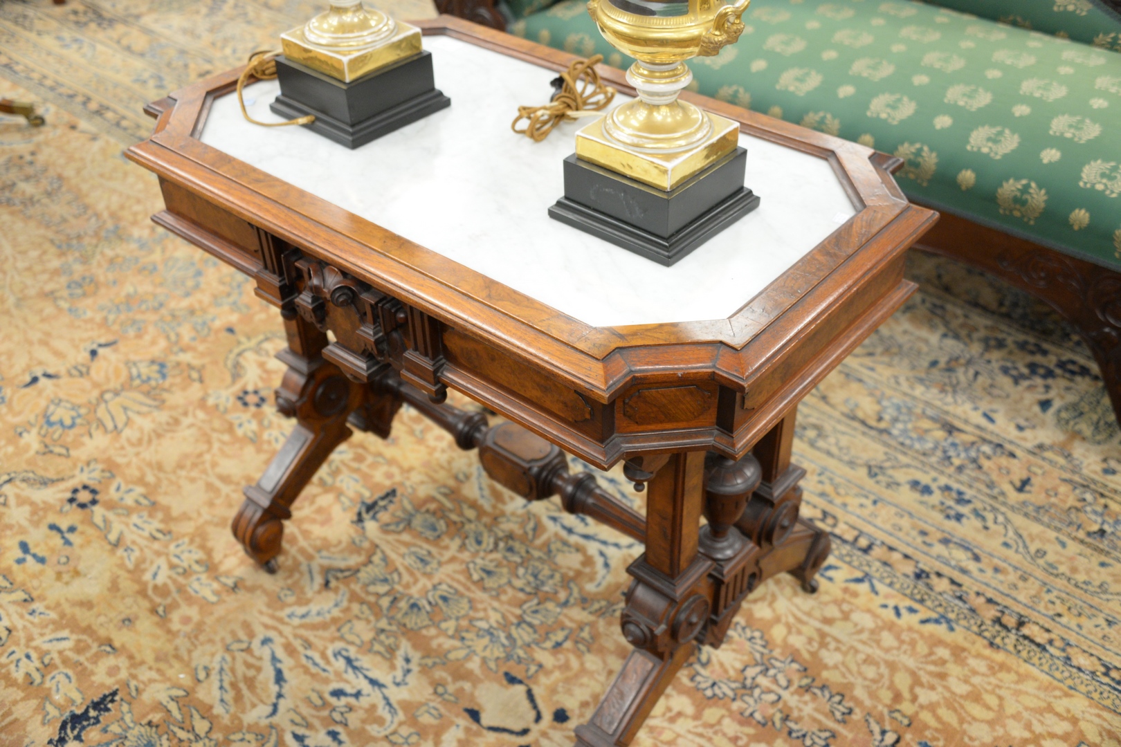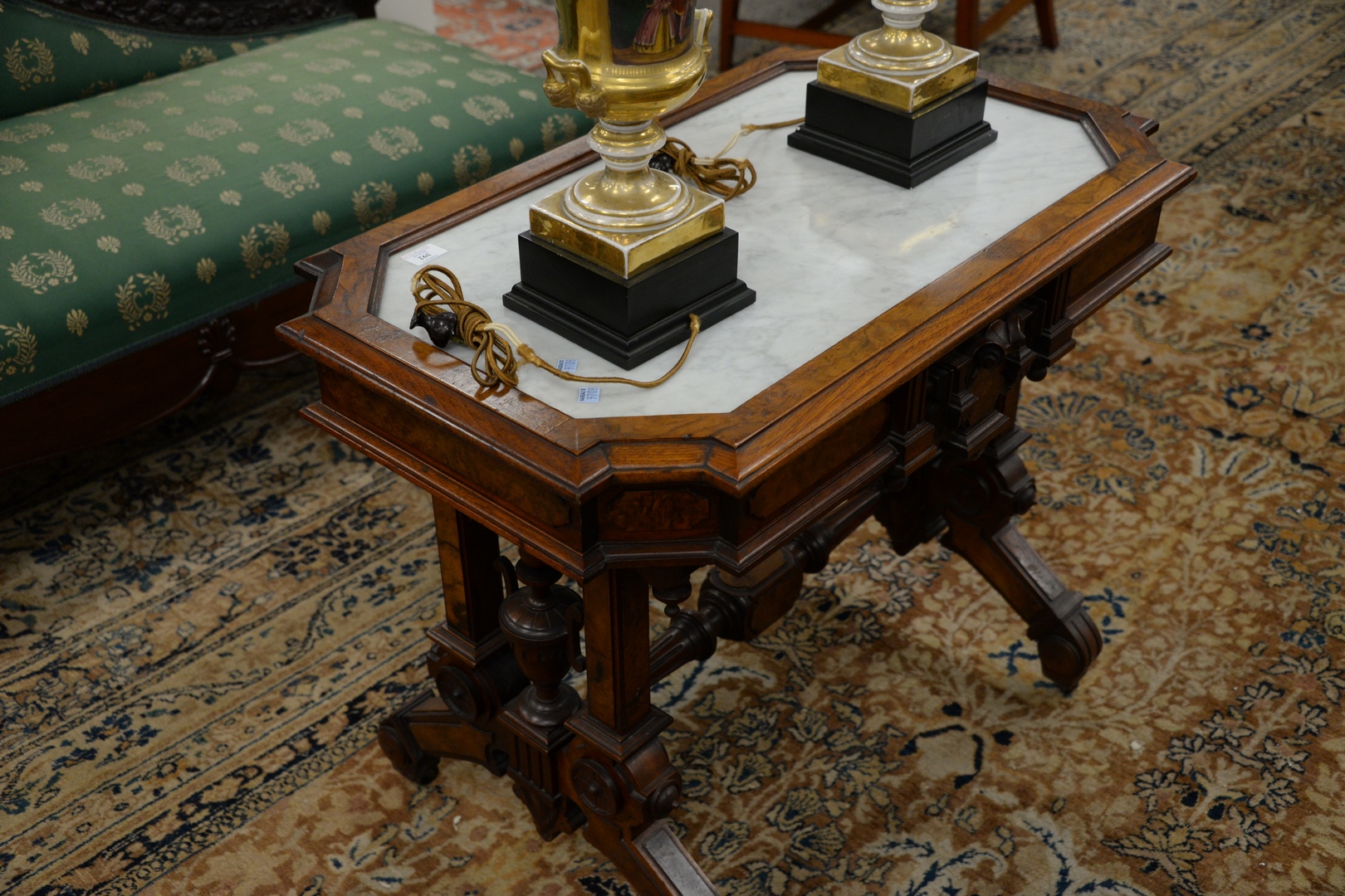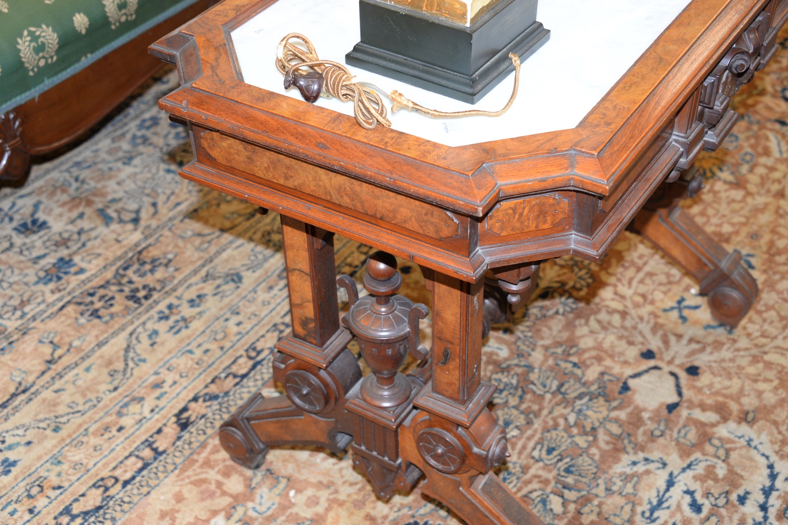 Lot 392: Victorian Walnut Table having white inset marble with floral carvings, on turned legs with stretchers height 29 1/2 inches, top 26…