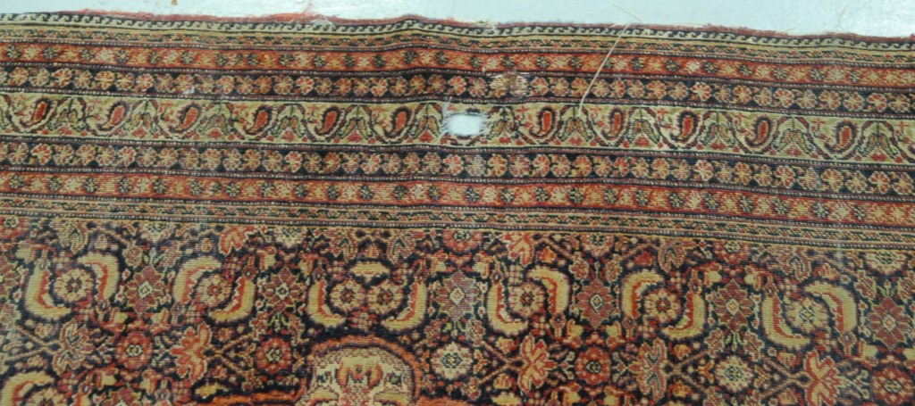 Antique Senna Oriental throw rug small holes. 4′ x 6′