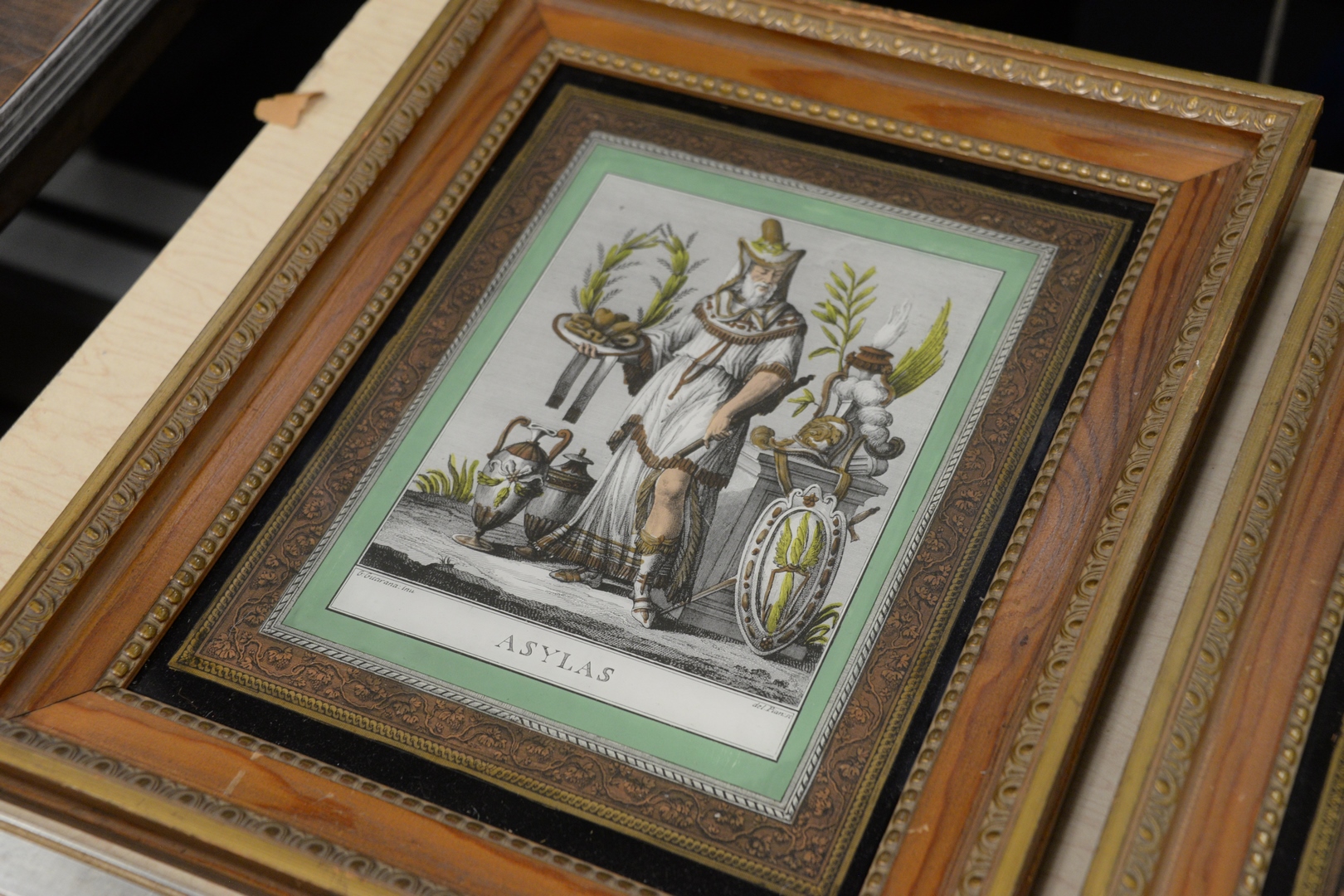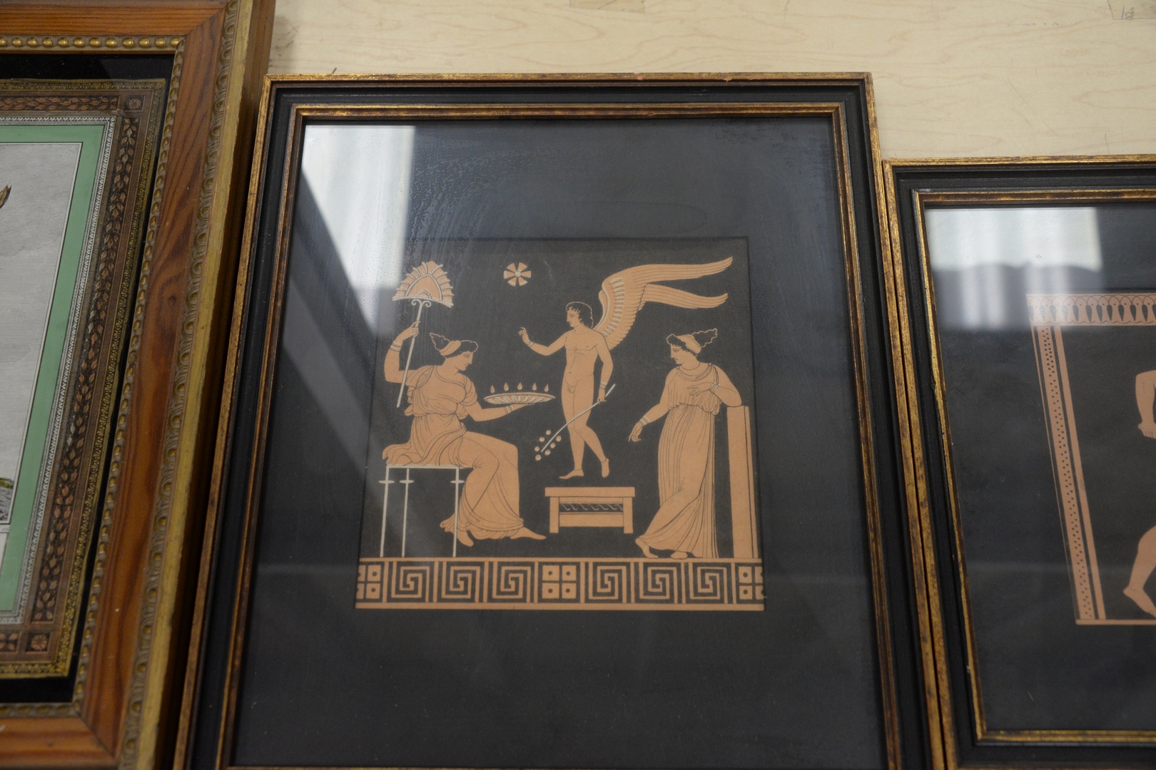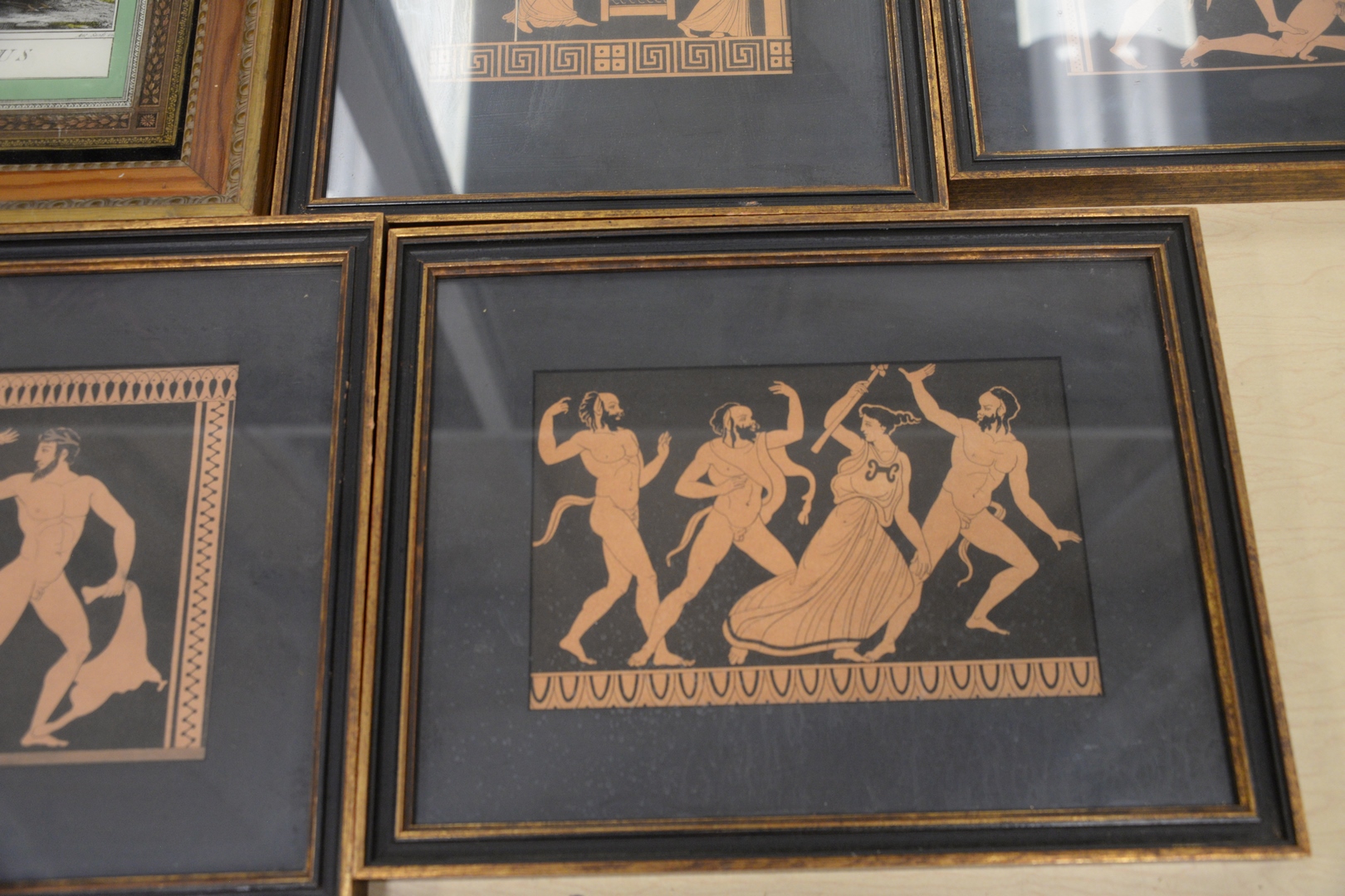 Lot 393: Eight Framed Pieces, to include four French Neoclassical pieces, along with four Neoclassical Hamilton prints, largest 13 1/2 x 10 1/2.