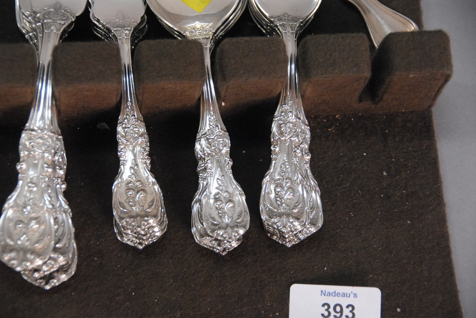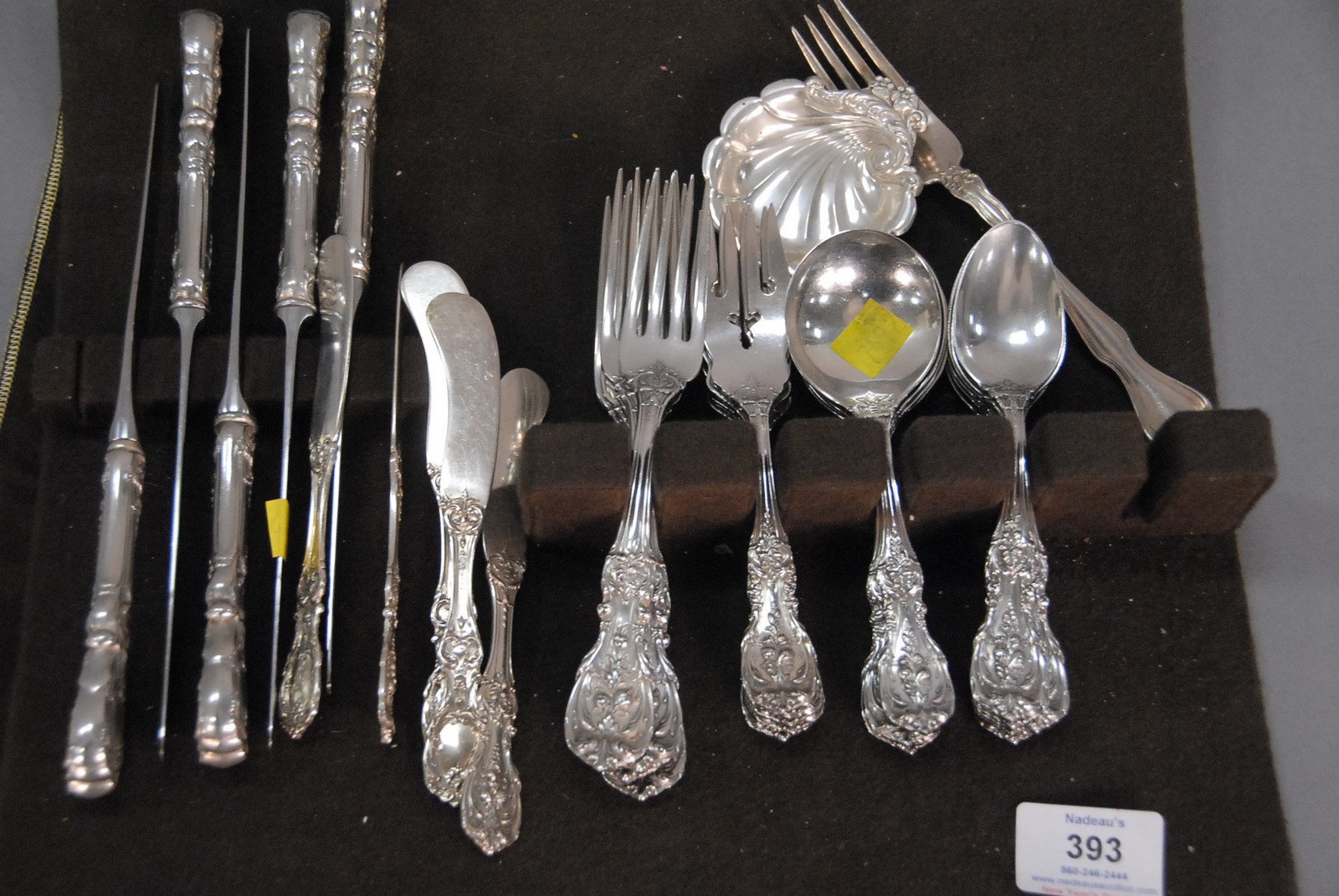 Lot 393: Francis I Reed and Barton sterling flatware set to include, six dinner forks, six salad forks, six dinner knives, six butter knives, six soup spoons, seven teaspoons, three serving pieces, and five miscellaneous pieces, 47.5 weighable t oz. plus six