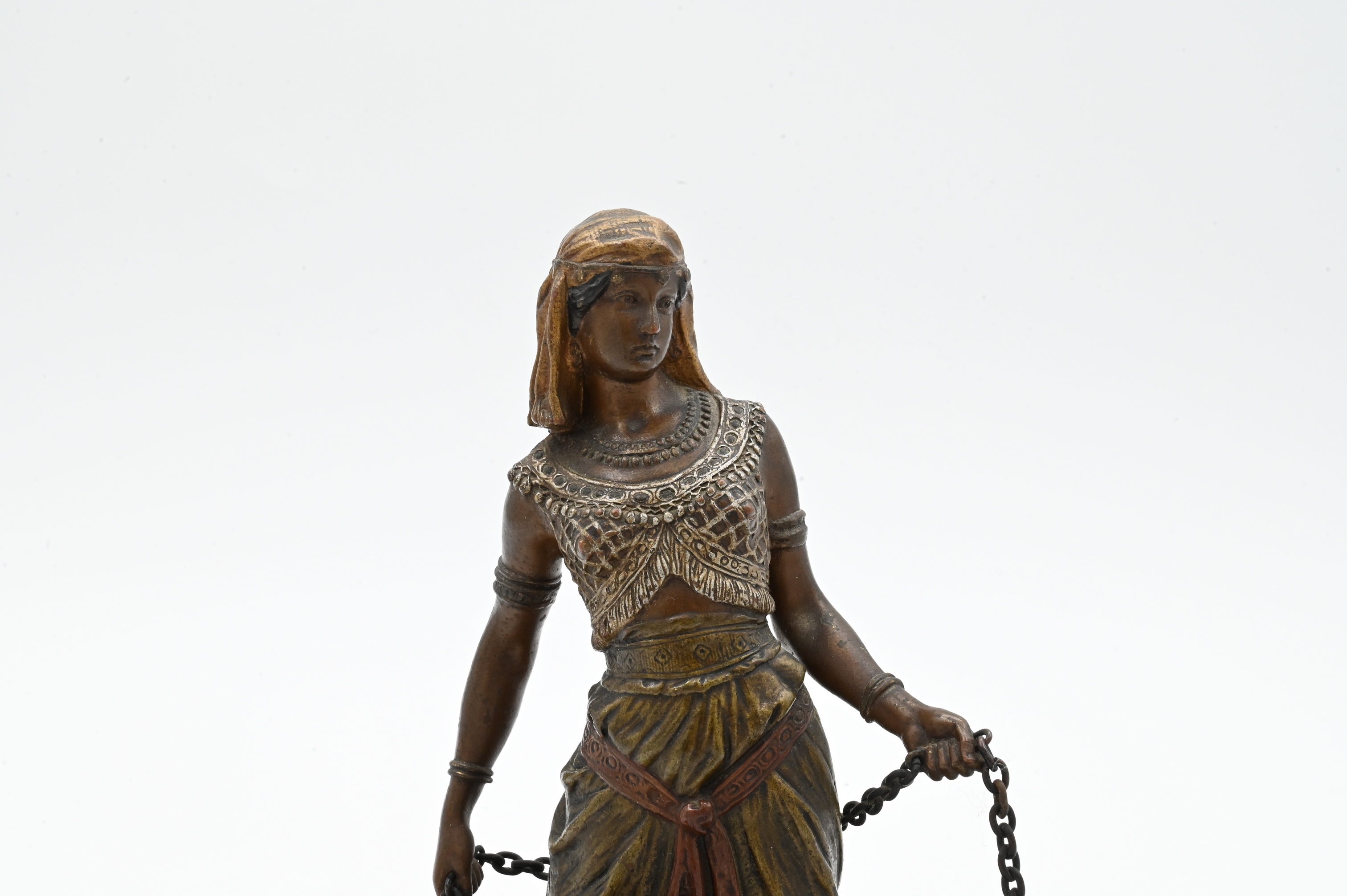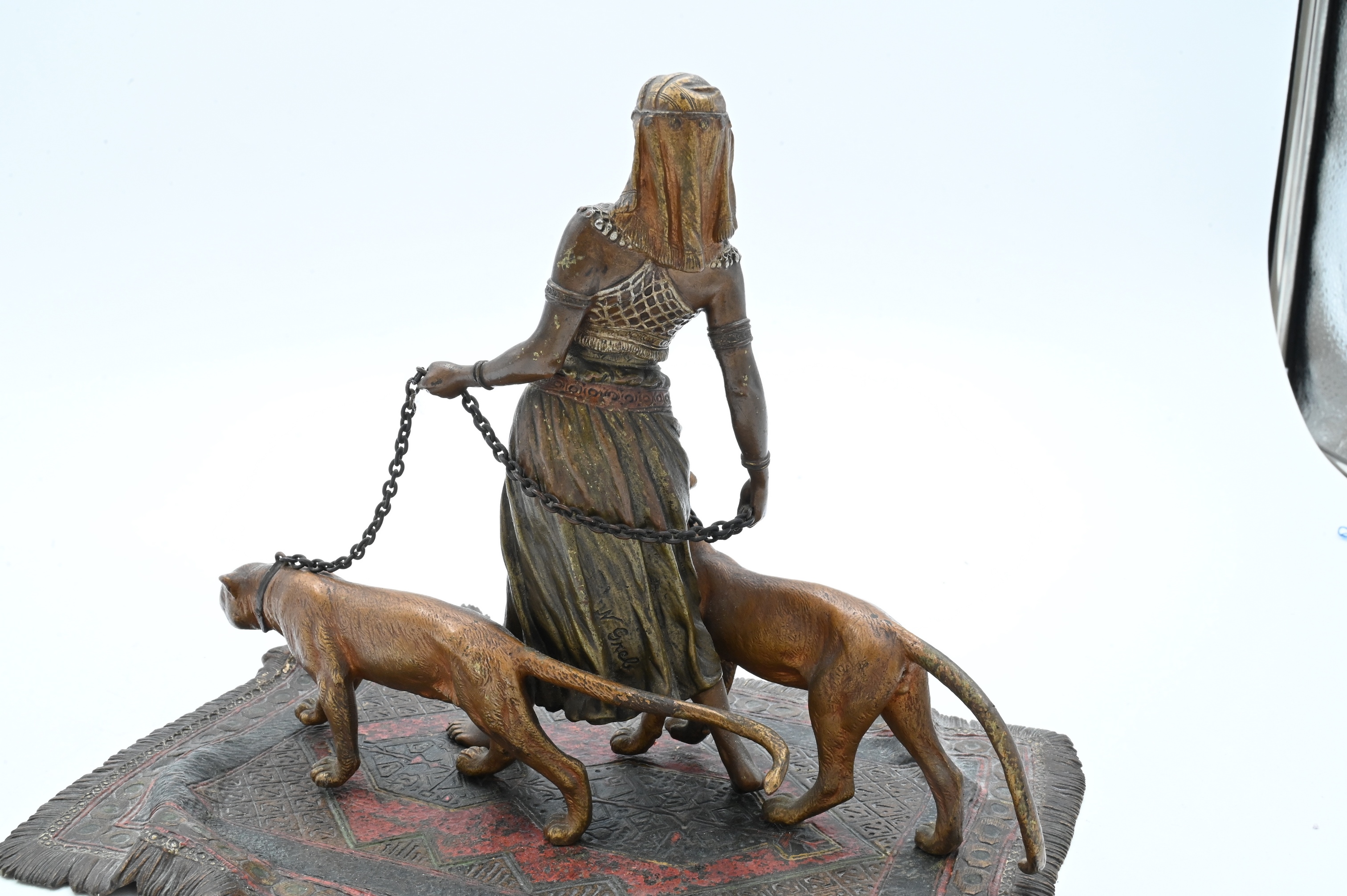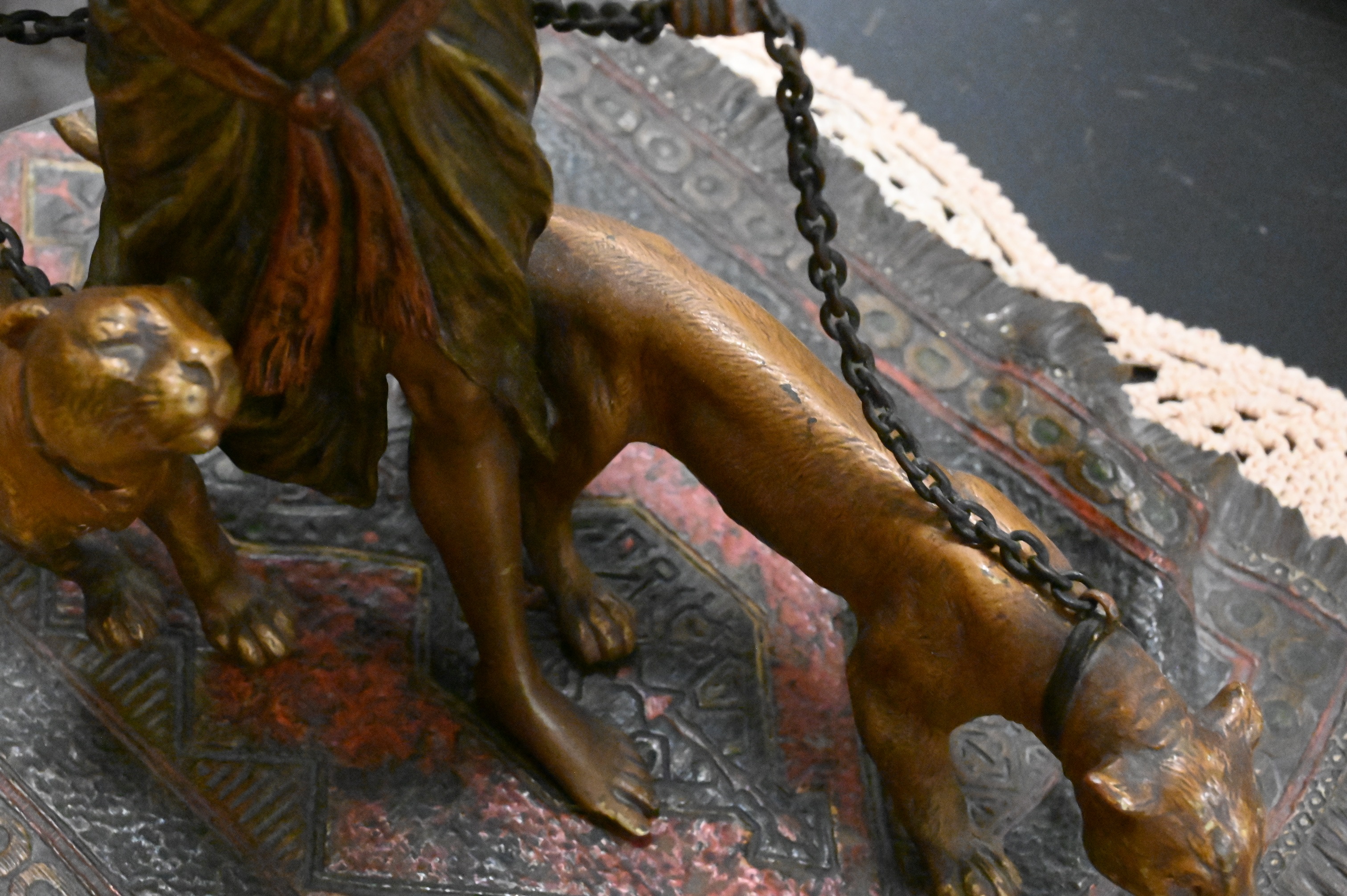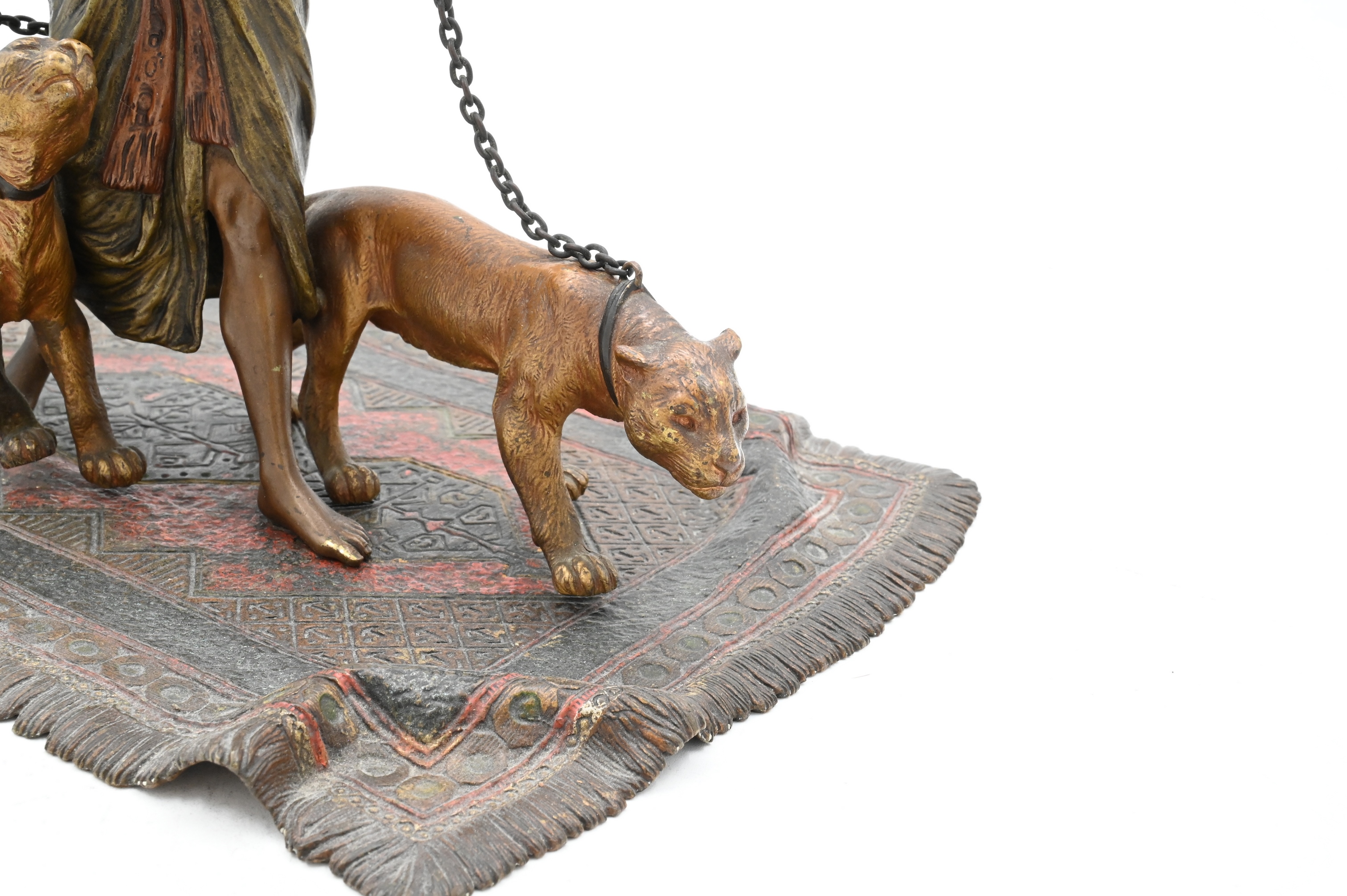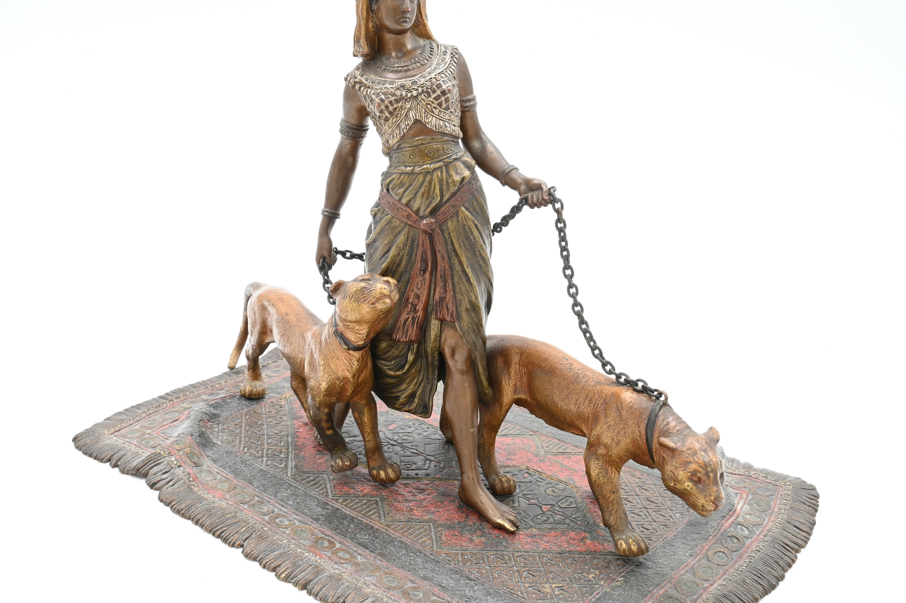 Cold painted bronze of woman walking two panthers, on Oriental rug