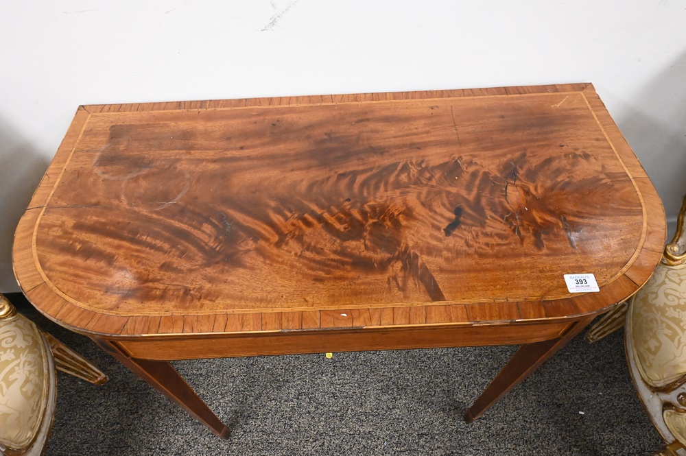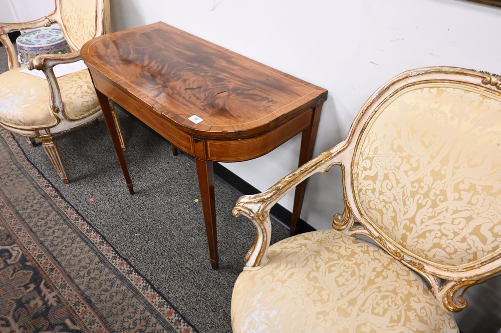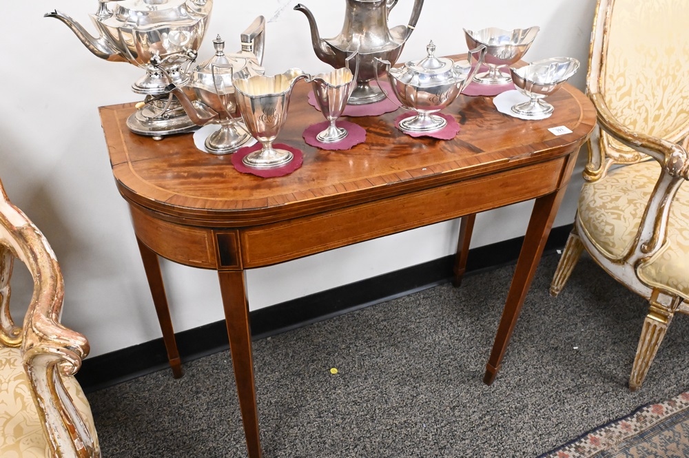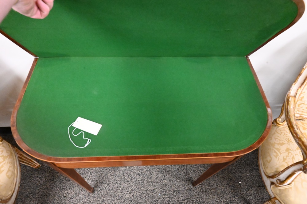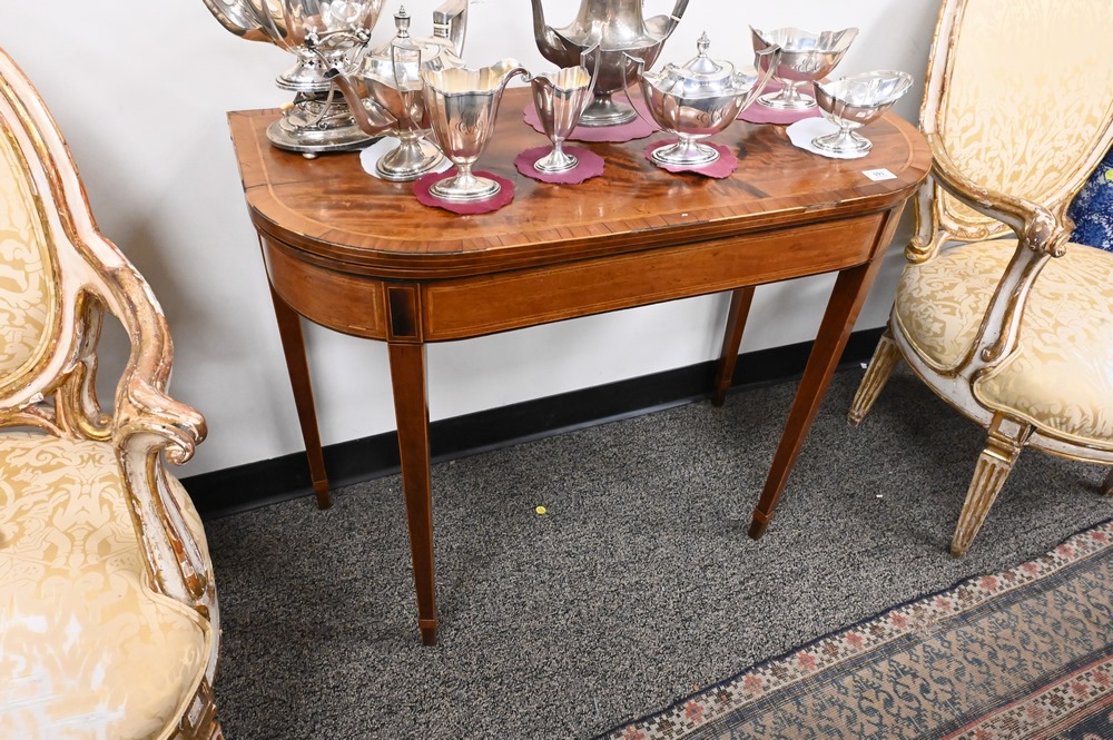 Lot 393: George III Mahogany Card Table, shaped with light wood inlays, set on square tapered legs, England, circa 1800. Provenance: Hooper collection. Marie Antoinette Slade (1892 – 1969). Bronx and later Pound Ridge, New York; gift of her estate to Yale University Art Gallery, New Haven, Connecticut, 1970.